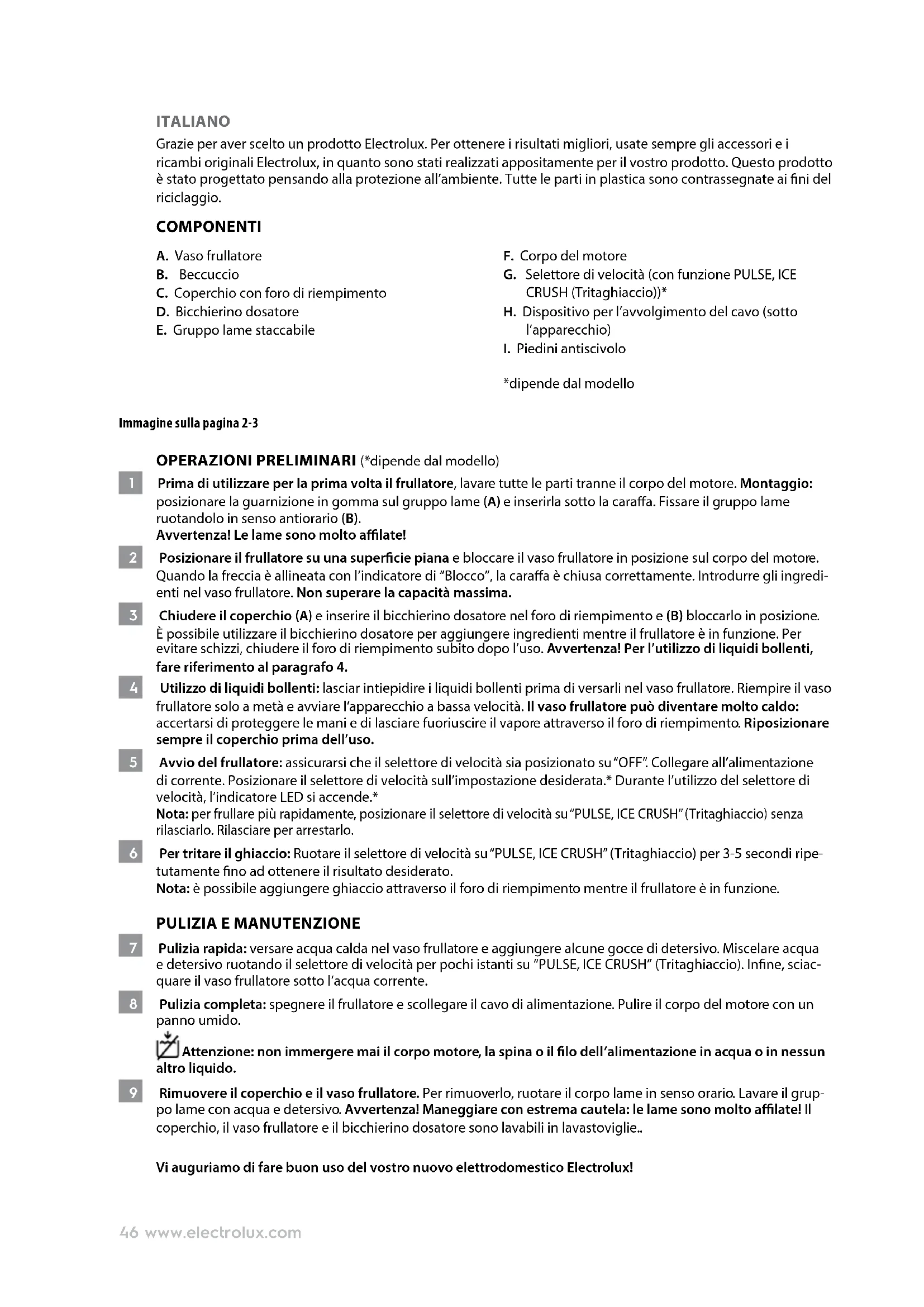 *dipende dal modello Immagine sulla pagina 2-3 OPERAZIONI PRELIMINARI (*dipende dal modello) 1 Prima di utilizzare per la prima volta il frullatore, lavare tutte le parti tranne il corpo del motore. Montaggio: posizionare la guarnizione in gomma sul gruppo lame (A) e inserirla sotto la caraa. Fissare il gruppo lame ruotandolo in senso antiorario (B). Avvertenza! Le lame sono molto alate! 2 Posizionare il frullatore su una supercie piana e bloccare il vaso frullatore in posizione sul corpo del motore. Quando la freccia è allineata con l’indicatore di “Blocco”, la caraa è chiusa correttamente. Introdurre gli ingredi- enti nel vaso frullatore. Non superare la capacità massima. 3 Chiudere il coperchio (A) e inserire il bicchierino dosatore nel foro di riempimento e (B) bloccarlo in posizione. È possibile utilizzare il bicchierino dosatore per aggiungere ingredienti mentre il frullatore è in funzione. Per evitare schizzi, chiudere il foro di riempimento subito dopo l’uso. Avvertenza! Per l’utilizzo di liquidi bollenti, fare riferimento al paragrafo 4. 4 Utilizzo di liquidi bollenti: lasciar intiepidire i liquidi bollenti prima di versarli nel vaso frullatore. Riempire il vaso frullatore solo a metà e avviare l’apparecchio a bassa velocità. Il vaso frullatore può diventare molto caldo: accertarsi di proteggere le mani e di lasciare fuoriuscire il vapore attraverso il foro di riempimento. Riposizionare sempre il coperchio prima dell’uso. 5 Avvio del frullatore: assicurarsi che il selettore di velocità sia posizionato su “OFF”. Collegare all’alimentazione di corrente. Posizionare il selettore di velocità sull’impostazione desiderata.* Durante l’utilizzo del selettore di velocità, l’indicatore LED si accende.* Nota: per frullare più rapidamente, posizionare il selettore di velocità su “PULSE, ICE CRUSH” (Tritaghiaccio) senza rilasciarlo. Rilasciare per arrestarlo. 6 Per tritare il ghiaccio: Ruotare il selettore di velocità su “PULSE, ICE CRUSH” (Tritaghiaccio) per 3-5 secondi ripe- tutamente no ad ottenere il risultato desiderato. Nota: è possibile aggiungere ghiaccio attraverso il foro di riempimento mentre il frullatore è in funzione.