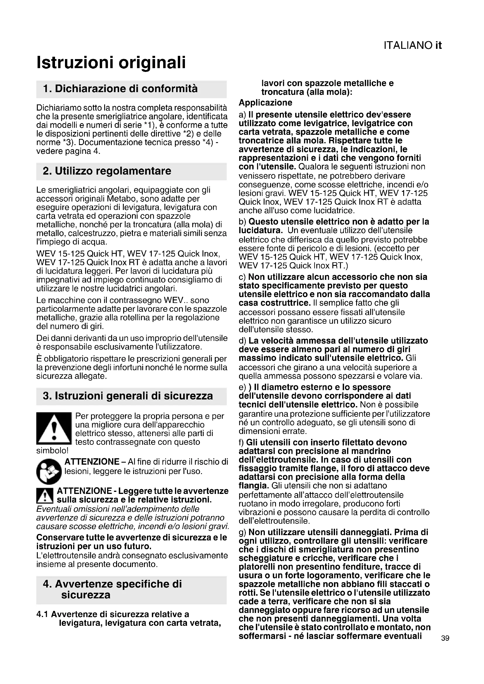 Istruzioni originali Dichiariamo sotto la nostra completa responsabilità che la presente smerigliatrice angolare, identificata dai modelli e numeri di serie *1), è conforme a tutte le disposizioni pertinenti delle direttive *2) e delle norme *3). Documentazione tecnica presso *4) - vedere pagina 4. Le smerigliatrici angolari, equipaggiate con gli accessori originali Metabo, sono adatte per eseguire operazioni di levigatura, levigatura con carta vetrata ed operazioni con spazzole metalliche, nonché per la troncatura (alla mola) di metallo, calcestruzzo, pietra e materiali simili senza l'impiego di acqua. WEV 15-125 Quick HT, WEV 17-125 Quick Inox, WEV 17-125 Quick Inox RT è adatta anche a lavori di lucidatura leggeri. Per lavori di lucidatura più impegnativi ad impiego continuato consigliamo di utilizzare le nostre lucidatrici angolari. Le macchine con il contrassegno WEV.. sono particolarmente adatte per lavorare con le spazzole metalliche, grazie alla rotellina per la regolazione del numero di giri. Dei danni derivanti da un uso improprio dell'utensile è responsabile esclusivamente l'utilizzatore. È obbligatorio rispettare le prescrizioni generali per la prevenzione degli infortuni nonché le norme sulla sicurezza allegate. Per proteggere la propria persona e per una migliore cura dell'apparecchio elettrico stesso, attenersi alle parti di testo contrassegnate con questo simbolo! ATTENZIONE – Al fine di ridurre il rischio di lesioni, leggere le istruzioni per l'uso. ATTENZIONE - Leggere tutte le avvertenze sulla sicurezza e le relative istruzioni. Eventuali omissioni nell’adempimento delle avvertenze di sicurezza e delle istruzioni potranno causare scosse elettriche, incendi e/o lesioni gravi. Conservare tutte le avvertenze di sicurezza e le istruzioni per un uso futuro. L'elettroutensile andrà consegnato esclusivamente insieme al presente documento.
