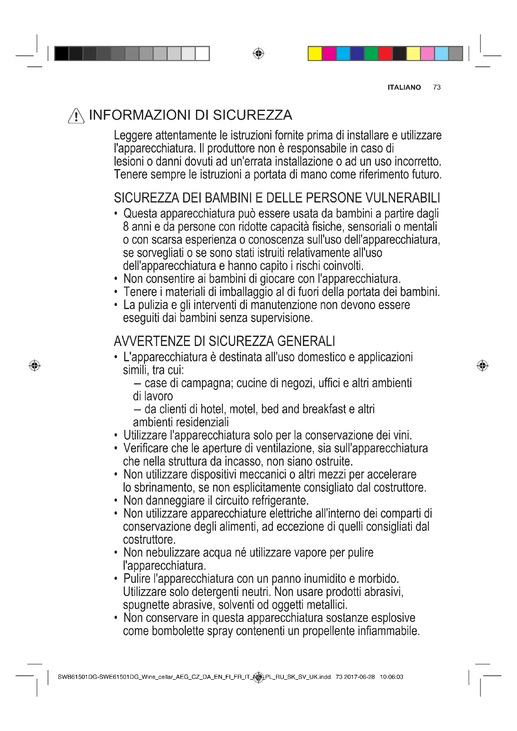 - Se il cavo di alimentazione è danneggiato, deve essere sostituito dal produttore, da un tecnico autorizzato o da una persona qualicata per evitare situazioni di pericolo. SWB61501DG-SWE61501DG_Wine_cellar_AEG_CZ_DA_EN_FI_FR_IT_NO_PL_RU_SK_SV_UK.indd 74 2017-06-28 10:06:03ITALIANO