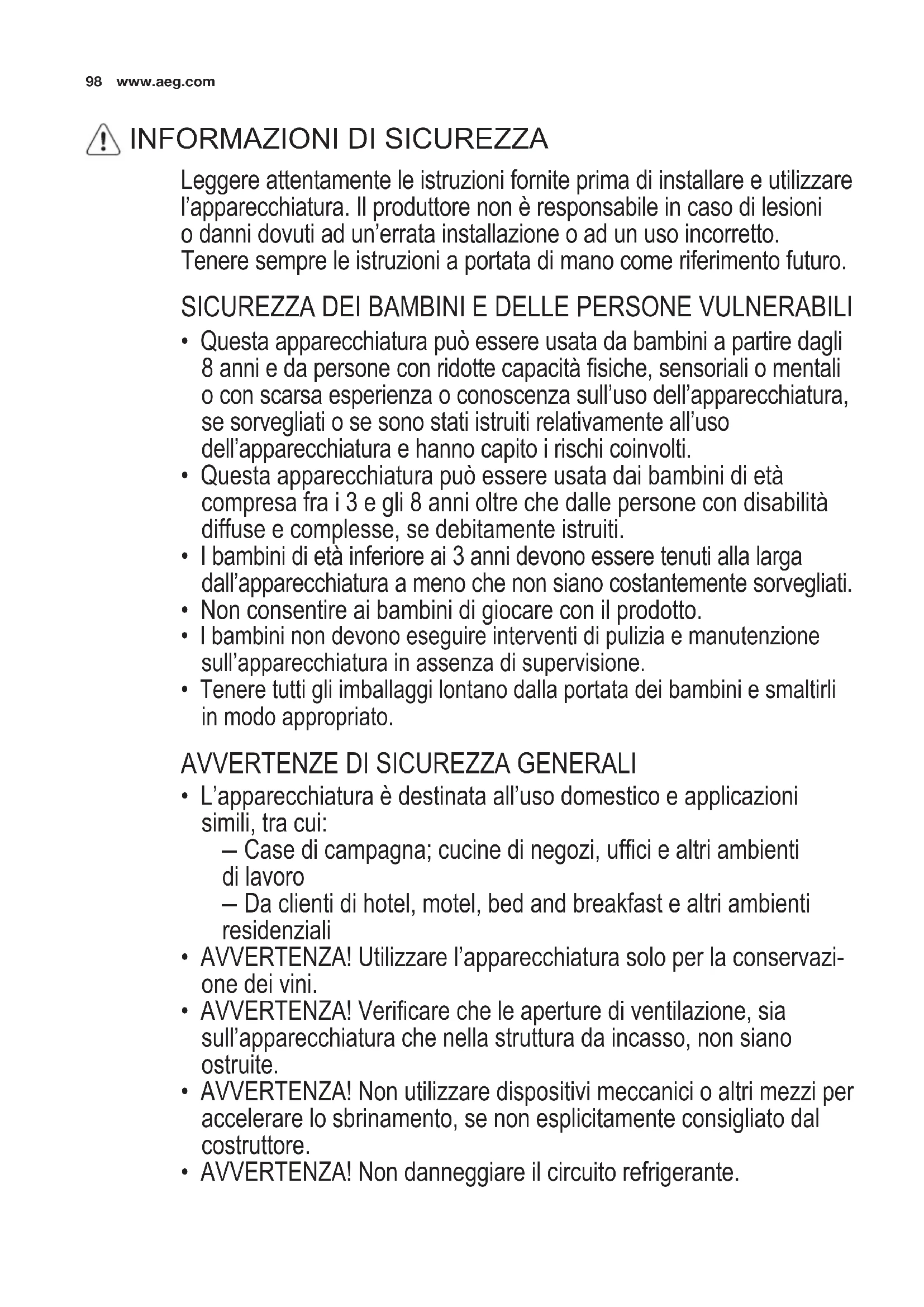 DATITECNICI .................................................................................................... 114 INFORMAZIONIPERGLIISTITUTIDITEST ...................................................114 ASPETTIAMBIENTALI ......................................................................................11598 www.aeg.com Leggere attentamente le istruzioni fornite prima di installare e utilizzare l’apparecchiatura. Il produttore non è responsabile in caso di lesioni o danni dovuti ad un’errata installazione o ad un uso incorretto. Tenere sempre le istruzioni a portata di mano come riferimento futuro. SICUREZZA DEI BAMBINI E DELLE PERSONE VULNERABILI