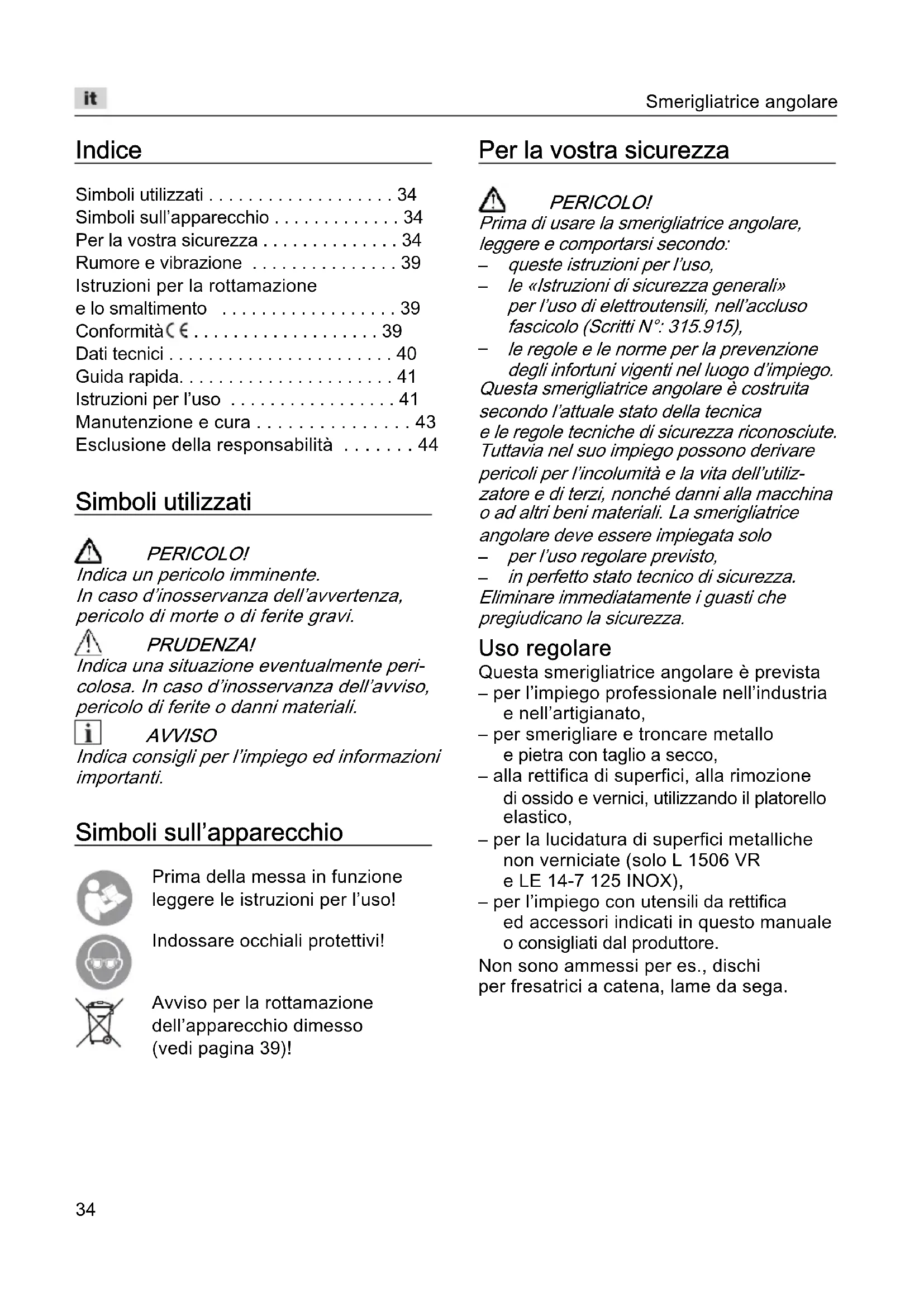 - Esclusione della responsabilità Simboli utilizzati PERICOLO! Indica un pericolo imminente. In caso d’inosservanza dell’avvertenza, pericolo di morte o di ferite gravi. PRUDENZA! Indica una situazione eventualmente peri- colosa. In caso d’inosservanza dell’avviso, pericolo di ferite o danni materiali. AVVISO Indica consigli per l’impiego ed informazioni importanti. Simboli sull’apparecchio Prima della messa in funzione leggere le istruzioni per l’uso! Indossare occhiali protettivi! Avviso per la rottamazione dell’apparecchio dimesso (vedi pagina 39)! Per la vostra sicurezza PERICOLO! Prima di usare la smerigliatrice angolare, leggere e comportarsi secondo: p. 44