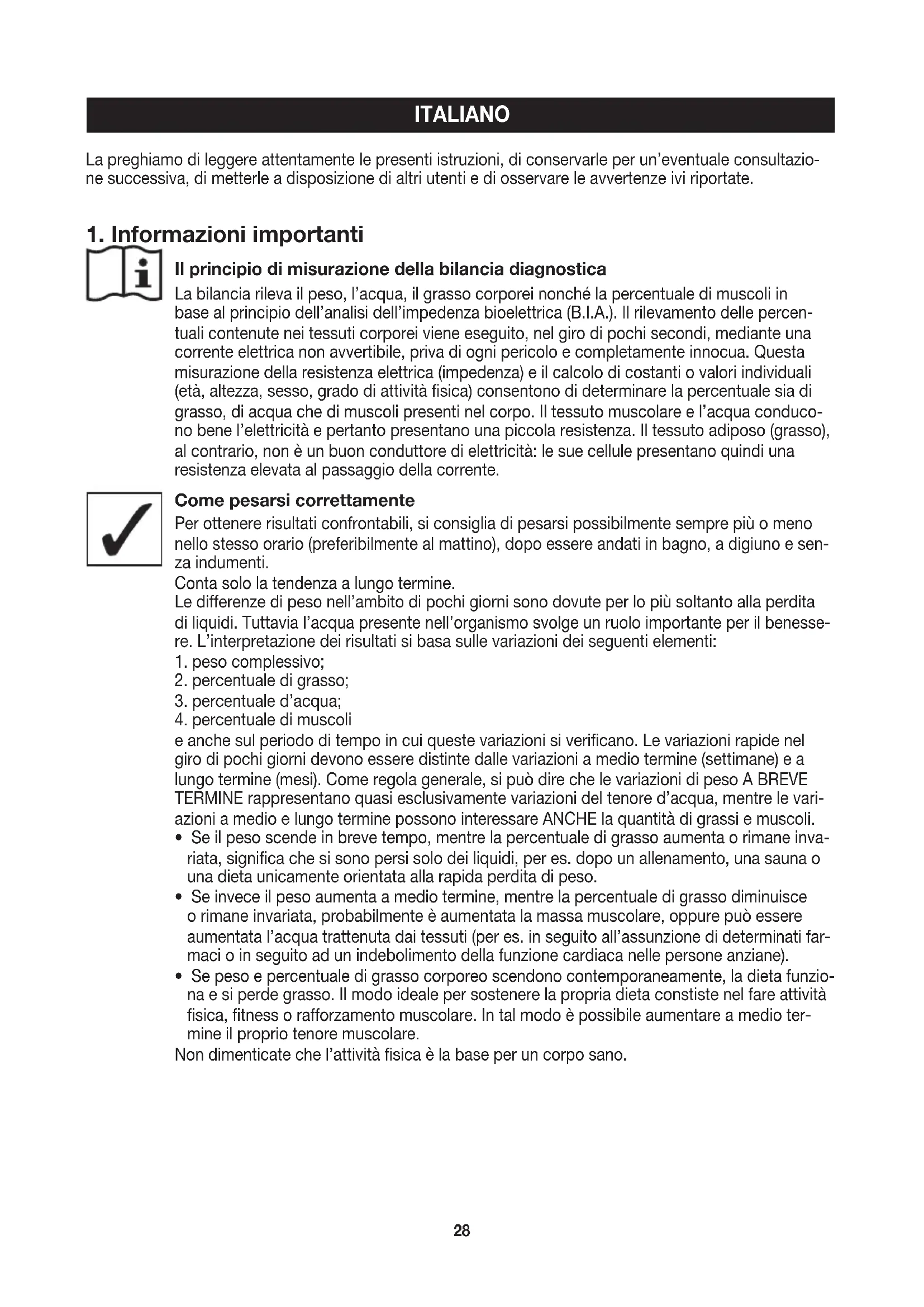 Il principio di misurazione della bilancia diagnostica La bilancia rileva il peso, l’acqua, il grasso corporei nonché la percentuale di muscoli in base al principio dell’analisi dell’impedenza bioelettrica (B.I.A.). Il rilevamento delle percen- tuali contenute nei tessuti corporei viene eseguito, nel giro di pochi secondi, mediante una corrente elettrica non avvertibile, priva di ogni pericolo e completamente innocua. Questa misurazione della resistenza elettrica (impedenza) e il calcolo di costanti o valori individuali (età, altezza, sesso, grado di attività fisica) consentono di determinare la percentuale sia di grasso, di acqua che di muscoli presenti nel corpo. Il tessuto muscolare e l’acqua conduco- no bene l’elettricità e pertanto presentano una piccola resistenza. Il tessuto adiposo (grasso), al contrario, non è un buon conduttore di elettricità: le sue cellule presentano quindi una resistenza elevata al passaggio della corrente. Come pesarsi correttamente Per ottenere risultati confrontabili, si consiglia di pesarsi possibilmente sempre più o meno nello stesso orario (preferibilmente al mattino), dopo essere andati in bagno, a digiuno e sen- za indumenti. Conta solo la tendenza a lungo termine. Le differenze di peso nell’ambito di pochi giorni sono dovute per lo più soltanto alla perdita di liquidi. Tuttavia l’acqua presente nell’organismo svolge un ruolo importante per il benesse- re. L’interpretazione dei risultati si basa sulle variazioni dei seguenti elementi: