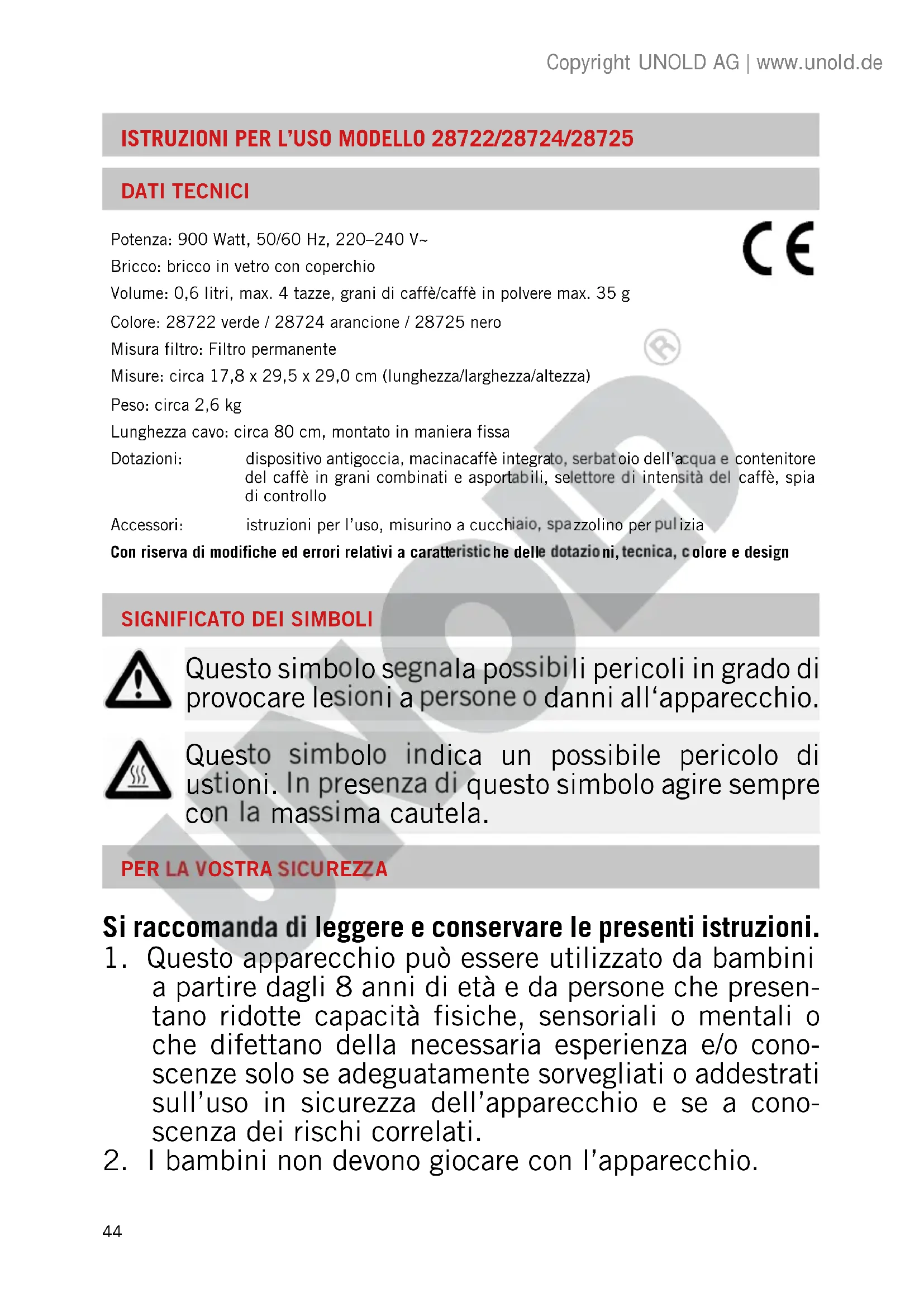 Questo simbolo segnala possibili pericoli in grado di provocare lesioni a persone o danni all‘apparecchio. Questo simbolo indica un possibile pericolo di ustioni. In presenza di questo simbolo agire sempre con la massima cautela. Potenza: 900 Watt, 50/60 Hz, 220–240 V~ Bricco: bricco in vetro con coperchio Volume: 0,6 litri, max. 4 tazze, grani di caffè/caffè in polvere max. 35 g Colore: 28722 verde / 28724 arancione / 28725 nero Misura filtro: Filtro permanente Misure: circa 17,8 x 29,5 x 29,0 cm (lunghezza/larghezza/altezza) Peso: circa 2,6 kg Lunghezza cavo: circa 80 cm, montato in maniera fissa Dotazioni: dispositivo antigoccia, macinacaffè integrato, serbatoio dell’acqua e contenitore del caffè in grani combinati e asportabili, selettore di intensità del caffè, spia di controllo Accessori: istruzioni per l’uso, misurino a cucchiaio, spazzolino per pulizia Con riserva di modifiche ed errori relativi a caratteristiche delle dotazioni, tecnica, colore e design Copyright UNOLD AG | www.unold.de45