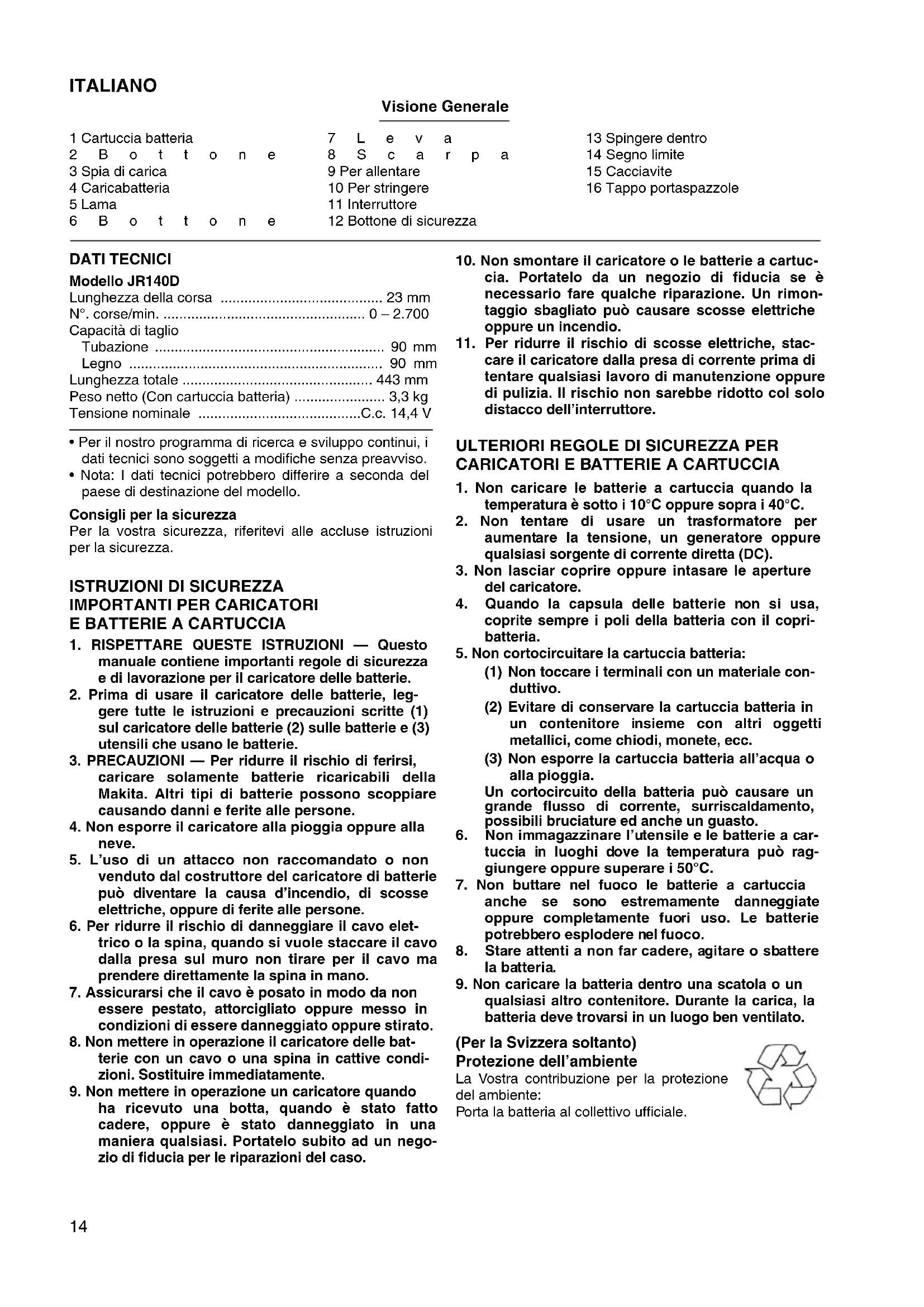 - Durante la lavorazione esercitate sempre forte pres- sione sulla scarpa affinchè stia sempre a contatto col pezzo da lavorare. Se durante la lavorazione la scarpa viene a trovarsi staccata dal pezzo sotto lavorazione, avrete forti vibrazioni e/o movimenti di torsione che causeranno una rottura pericolosa della lama. MANUTENZIONE ATTENZIONE: Prima di effettuare ogni tipo di lavoro sull’utensile, assicu- ratevi sempre che essa sia spenta e che la batteria sia rimossa. Sostituzione delle spazzole di carbone (Figg. 10 e 11) Sostituite la spazzole di carbone quando sono usurate fino alla linea di delimitazione. Sostituite entrambe le spazzole con tipi di spazzole identici. Per mantenere la sicurezza e l’affidabilità del prodotto, le riparazioni, la manutenzione o le regolazioni dovrebbero essere eseguite da un centro di assistenza Makita auto- rizzato.17 NEDERLANDS Verklaring van algemene gegevens 1 Accu 2 Drukknop 3 Laadlampje 4 Acculader 5 Zaagblad 6 Duwknop 7 Hendel 8 Schoen 9 Losdraaien 10 Vastzetten 11 Trekkerschakelaar 12 Ontgrendelknop 13 Indrukken 14 Limietmarkering 15 Schroevendraaier 16 Koolborsteldop TECHNISCHE GEGEVENS Model JR140D Slaglengte ............................................................. 23 mm Aantal zaagbewegingen/min. .......................... 0 – 2 700 Snijcapaciteit Pijp ..................................................................... 90 mm Hout ................................................................... 90 mm Totale lengte ....................................................... 443 mm Netto gewicht (Met accu) ....................................... 3,3 kg Nominale spanning ........................................D.C. 14,4 V