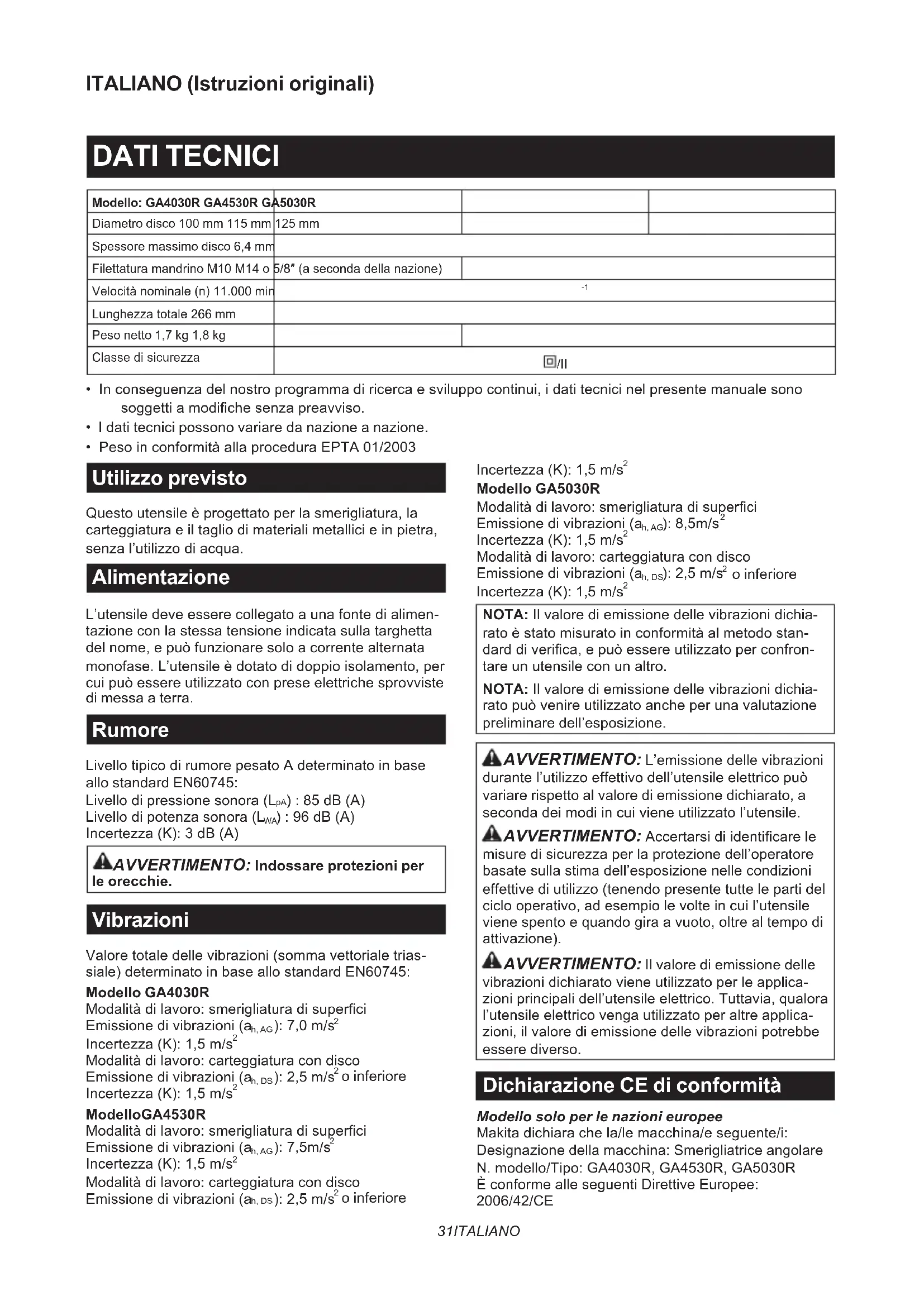 NOTA: Il valore di emissione delle vibrazioni dichia- rato è stato misurato in conformità al metodo stan- dard di verica, e può essere utilizzato per confron- tare un utensile con un altro. NOTA: Il valore di emissione delle vibrazioni dichia- rato può venire utilizzato anche per una valutazione preliminare dell’esposizione. AVVERTIMENTO: L’emissione delle vibrazioni durante l’utilizzo effettivo dell’utensile elettrico può variare rispetto al valore di emissione dichiarato, a seconda dei modi in cui viene utilizzato l’utensile. AVVERTIMENTO: Accertarsi di identicare le misure di sicurezza per la protezione dell’operatore basate sulla stima dell’esposizione nelle condizioni effettive di utilizzo (tenendo presente tutte le parti del ciclo operativo, ad esempio le volte in cui l’utensile viene spento e quando gira a vuoto, oltre al tempo di attivazione). AVVERTIMENTO: Il valore di emissione delle vibrazioni dichiarato viene utilizzato per le applica- zioni principali dell’utensile elettrico. Tuttavia, qualora l’utensile elettrico venga utilizzato per altre applica- zioni, il valore di emissione delle vibrazioni potrebbe essere diverso. Dichiarazione CE di conformità Modello solo per le nazioni europee Makita dichiara che la/le macchina/e seguente/i: Designazione della macchina: Smerigliatrice angolare N. modello/Tipo: GA4030R, GA4530R, GA5030R È conforme alle seguenti Direttive Europee: 2006/42/CE32 ITALIANO È stata fabbricata in conformità allo standard e ai docu- menti standardizzati seguenti: EN60745 Il le tecnico in conformità alla normativa 2006/42/CE è disponibile presso: Makita, Jan-Baptist Vinkstraat 2, 3070, Belgio