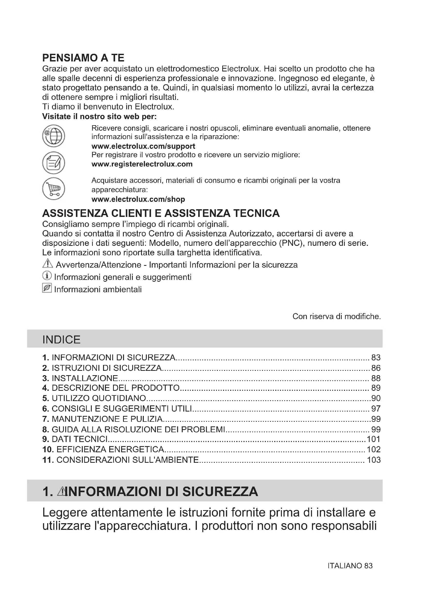 Grazie per aver acquistato un elettrodomestico Electrolux. Hai scelto un prodotto che ha alle spalle decenni di esperienza professionale e innovazione. Ingegnoso ed elegante, è stato progettato pensando a te. Quindi, in qualsiasi momento lo utilizzi, avrai la certezza di ottenere sempre i migliori risultati. Ti diamo il benvenuto in Electrolux. Visitate il nostro sito web per:Ricevere consigli, scaricare i nostri opuscoli, eliminare eventuali anomalie, ottenereinformazioni sull'assistenza e la riparazione:www.electrolux.com/supportPer registrare il vostro prodotto e ricevere un servizio migliore:www.registerelectrolux.comAcquistare accessori, materiali di consumo e ricambi originali per la vostraapparecchiatura:www.electrolux.com/shop