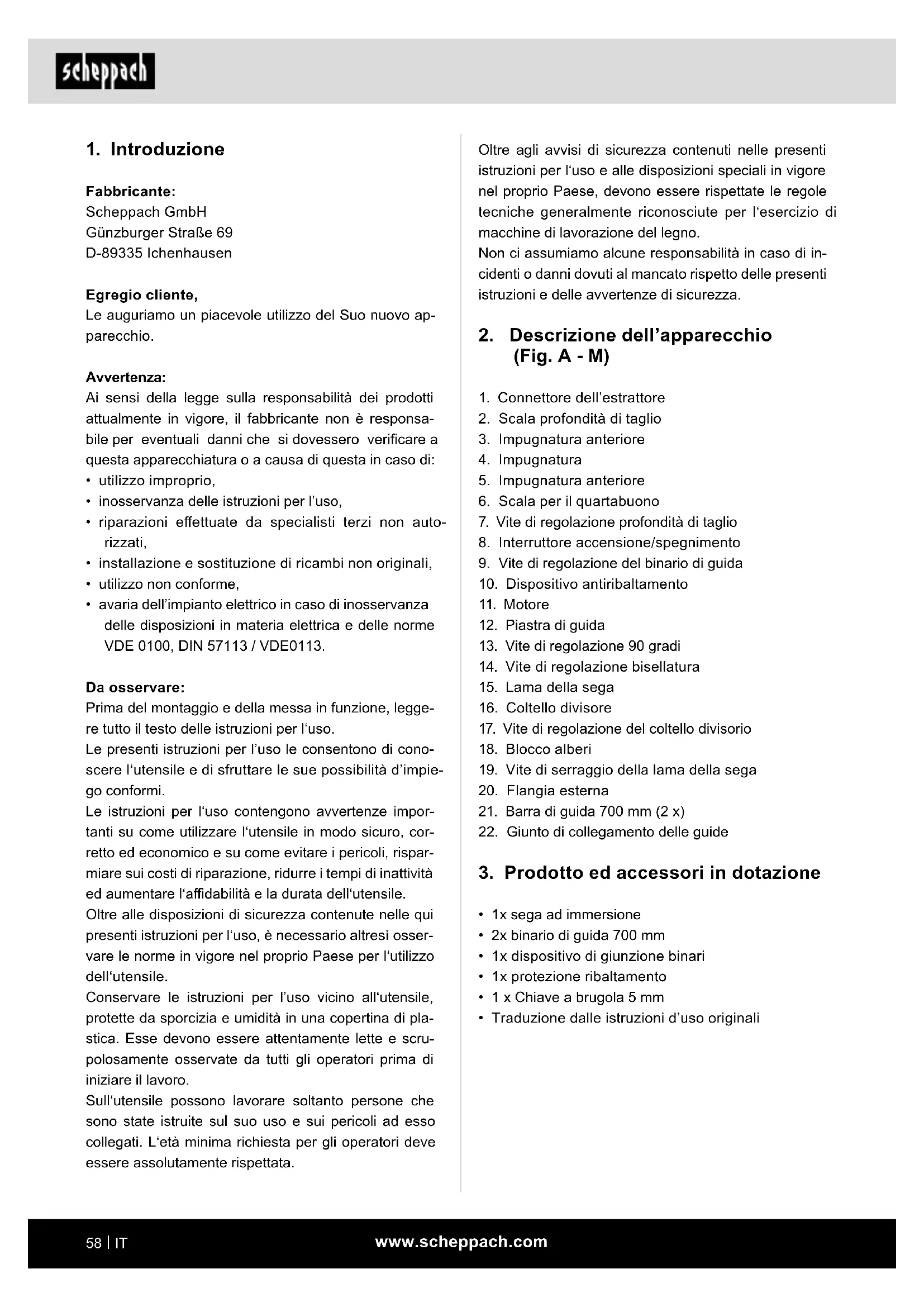 - utilizzo o manutenzione della sega ad immersione da parte di persone che non hanno familiarità con l’uso della sega ad immersione e/o non comprendo- no i rischi connessi. L’osservanza delle avvertenze sulla sicurezza, nonché le istruzioni di montaggio e le avvertenze sul funzio- namento riportate nelle istruzioni d’uso, fanno integral- mente parte dell’impiego regolamentare previsto. Le persone, che usano o manutenzionano la sega, de- vono averne pratica ed essere al corrente degli even- tuali pericoli incombenti. Oltre a ciò ci si deve minutamente attenere alle norme sulla prevenzione degli infortuni.www.scheppach.com