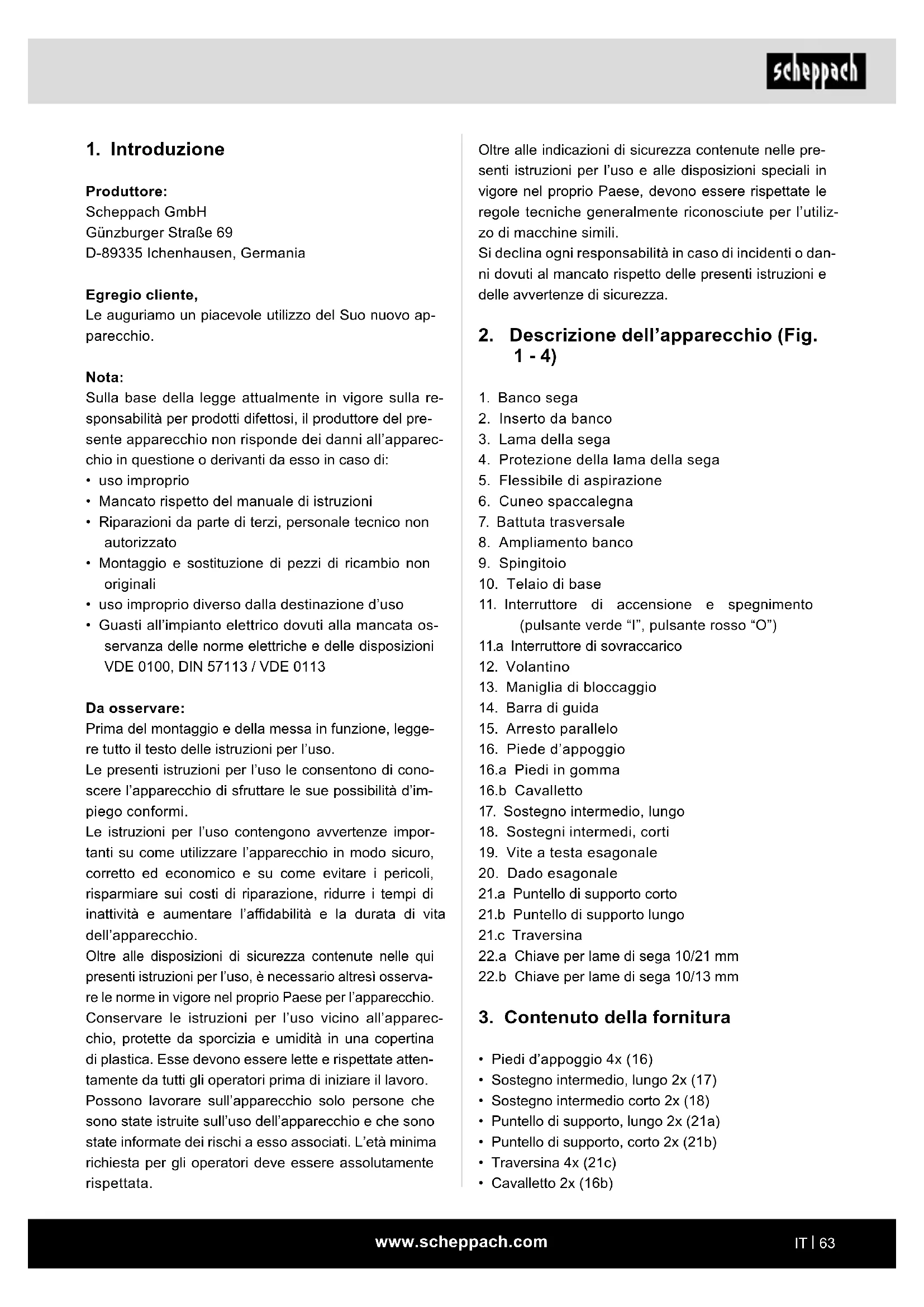 Produttore: Scheppach GmbH Günzburger Straße 69 D-89335 Ichenhausen, Germania Egregio cliente, Le auguriamo un piacevole utilizzo del Suo nuovo ap- parecchio. Nota: Sulla base della legge attualmente in vigore sulla re- sponsabilità per prodotti difettosi, il produttore del pre- sente apparecchio non risponde dei danni all’apparec- chio in questione o derivanti da esso in caso di: