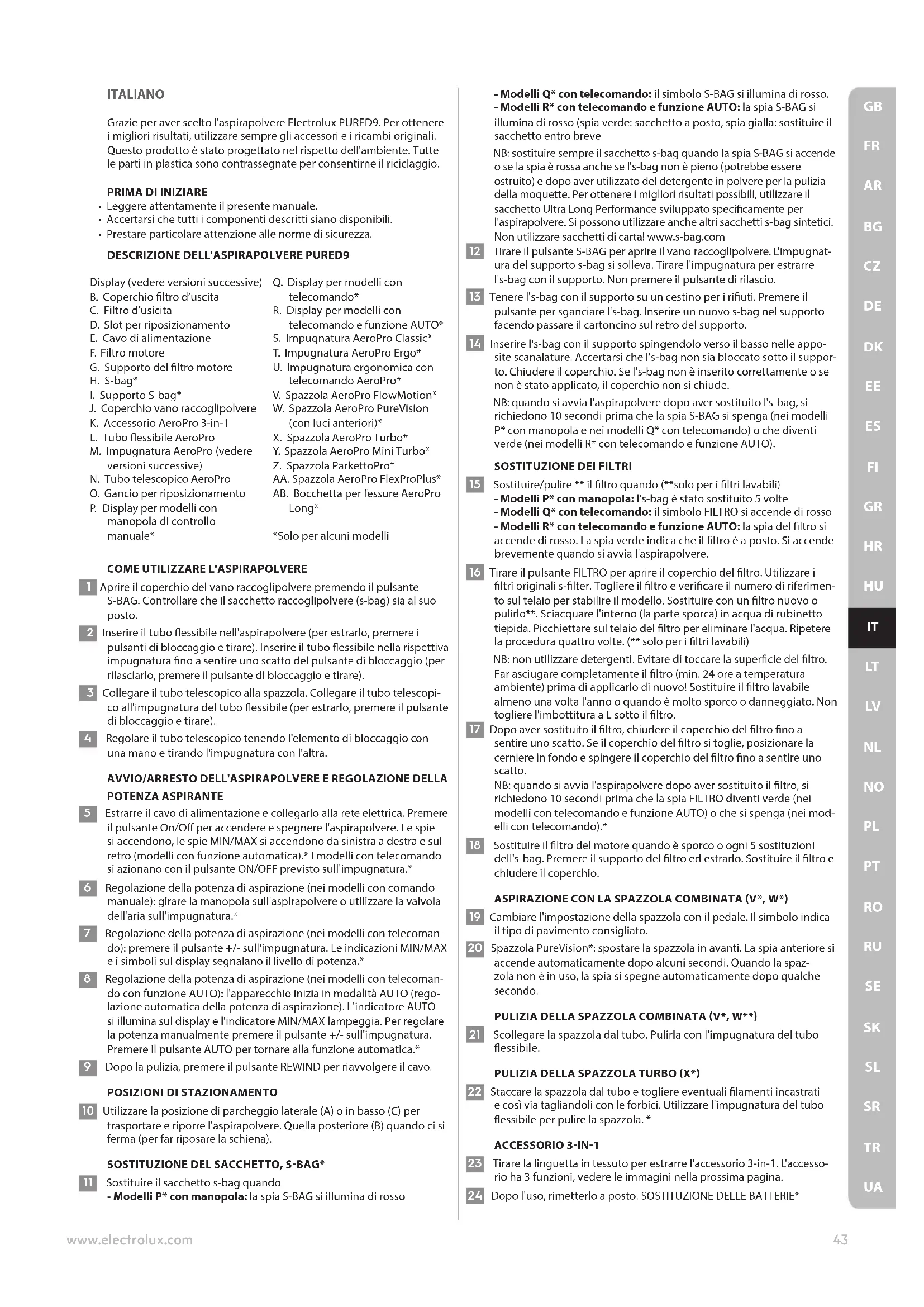 UAITALIANO Grazie per aver scelto l'aspirapolvere Electrolux PURED9. Per ottenere i migliori risultati, utilizzare sempre gli accessori e i ricambi originali. Questo prodotto è stato progettato nel rispetto dell'ambiente. Tutte le parti in plastica sono contrassegnate per consentirne il riciclaggio.