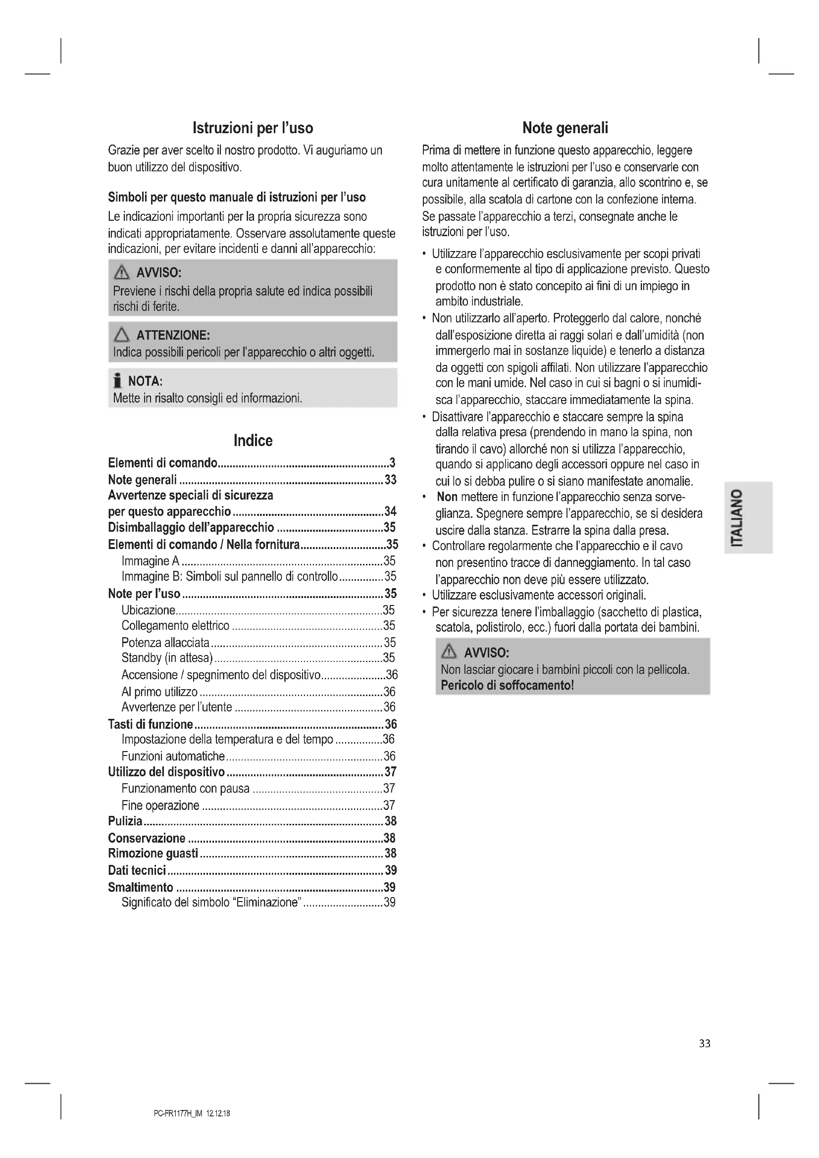 - Per sicurezza tenere l’imballaggio (sacchetto di plastica, scatola, polistirolo, ecc.) fuori dalla portata dei bambini. AVVISO: Non lasciar giocare i bambini piccoli con la pellicola. Pericolo di soffocamento!PC-FR1177H_IM 12.12.18
