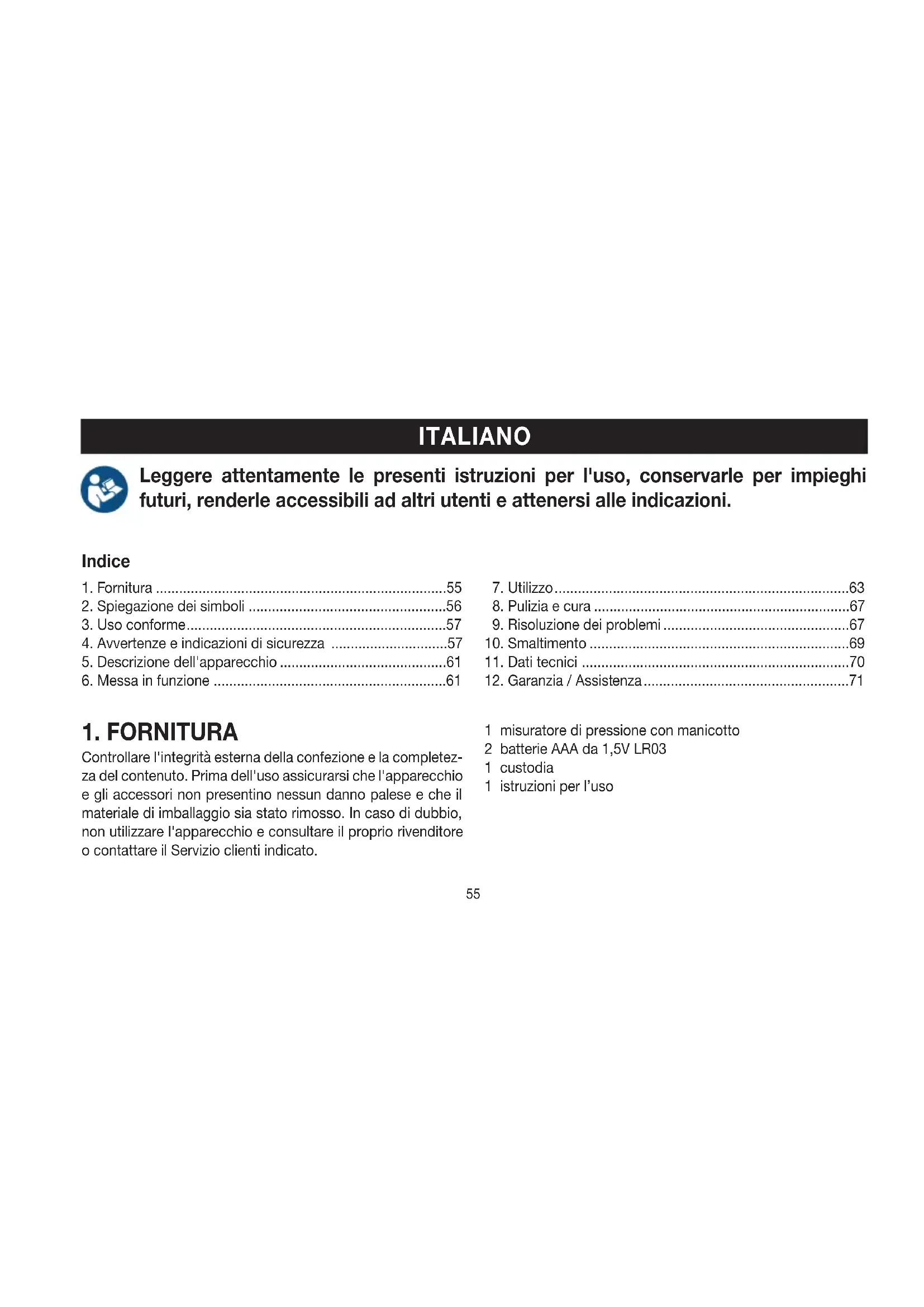 Controllare l'integrità esterna della confezione e la completez- za del contenuto. Prima dell'uso assicurarsi che l'apparecchio e gli accessori non presentino nessun danno palese e che il materiale di imballaggio sia stato rimosso. In caso di dubbio, non utilizzare l'apparecchio e consultare il proprio rivenditore o contattare il Servizio clienti indicato. 1 misuratore di pressione con manicotto 2 batterie AAA da 1,5V LR03 1 custodia 1 istruzioni per l’uso