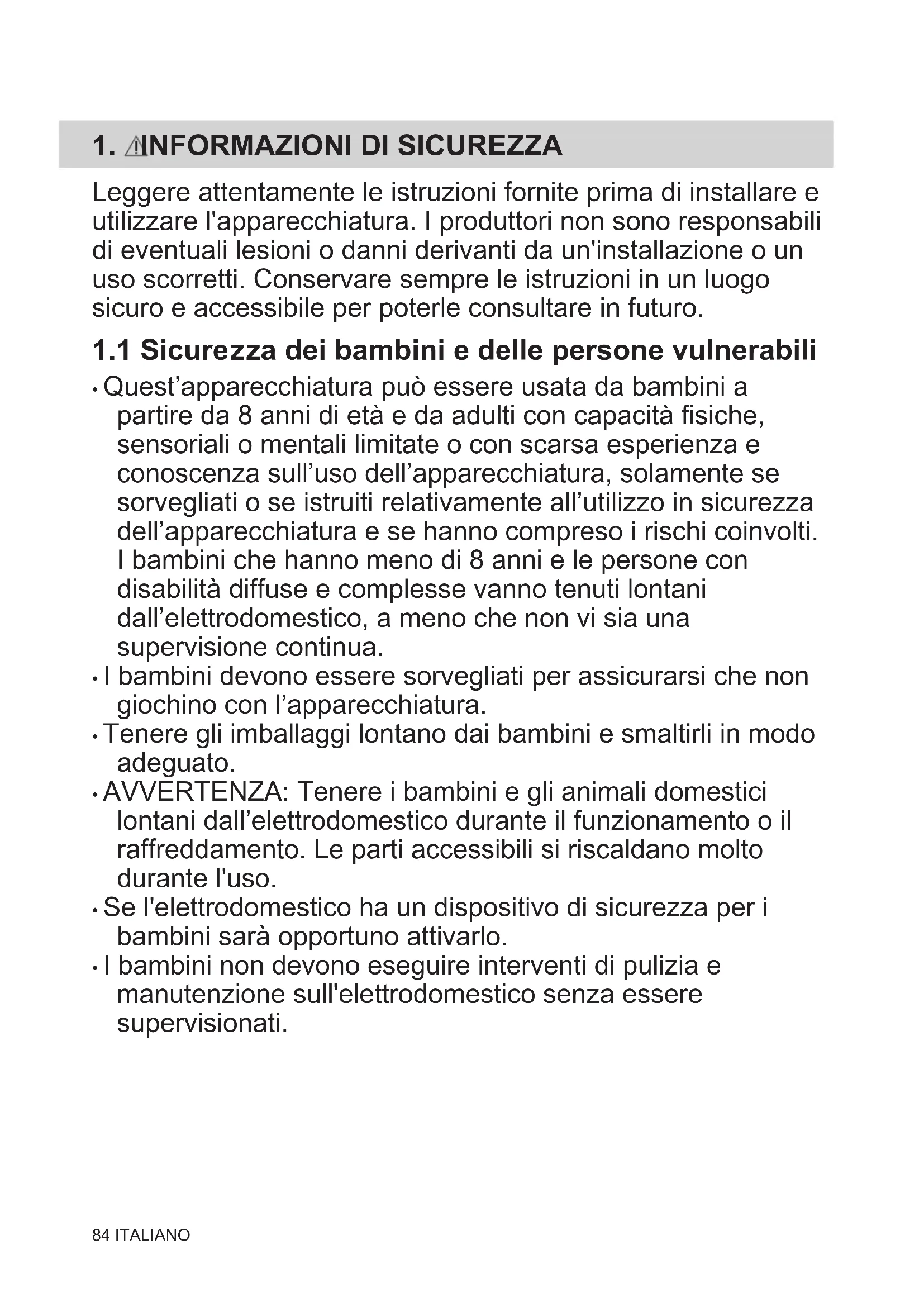 - I bambini non devono eseguire interventi di pulizia e manutenzione sull'elettrodomestico senza essere supervisionati. 84 ITALIANO1.2 Avvertenze di sicurezza generali