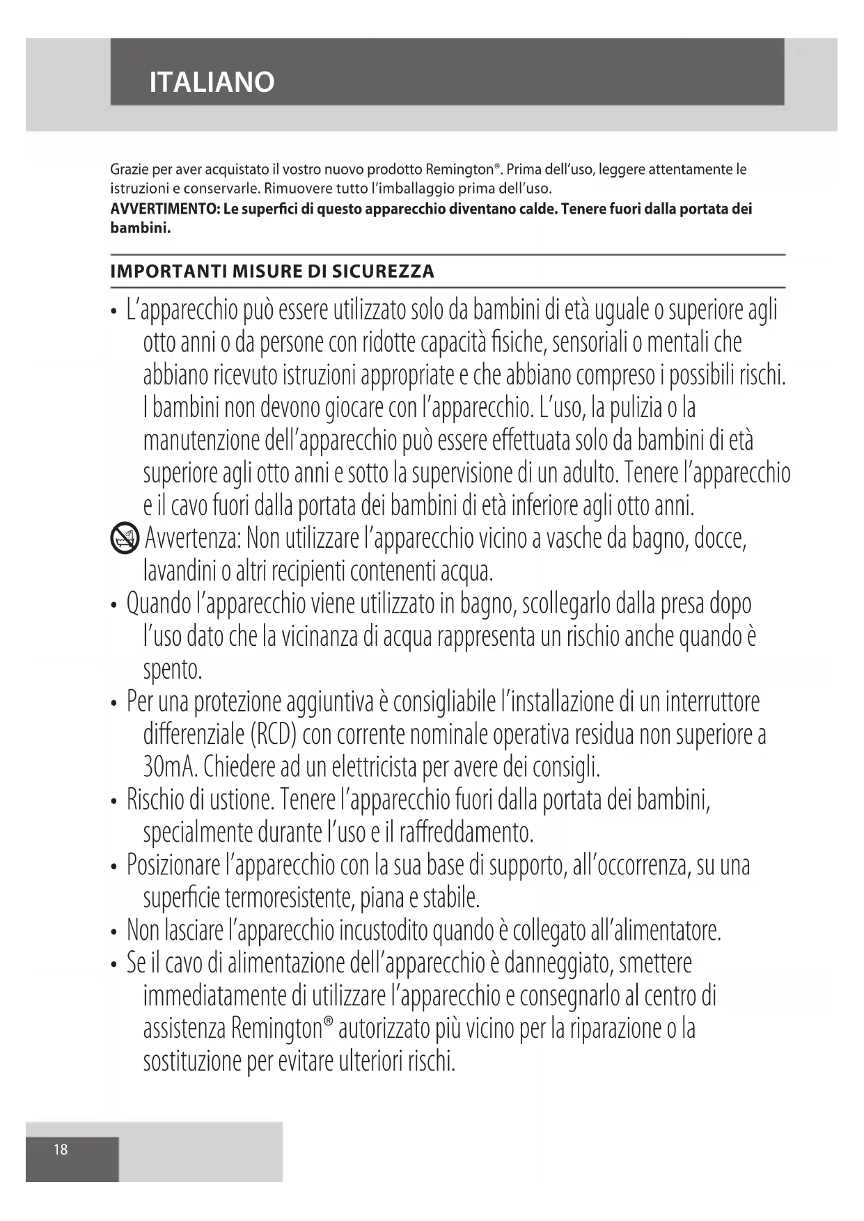 - Se il cavo di alimentazione dell’apparecchio è danneggiato, smettere immediatamente di utilizzare l’apparecchio e consegnarlo al centro di assistenza Remington® autorizzato più vicino per la riparazione o la sostituzione per evitare ulteriori rischi. ITALIANO19 ITALIANO