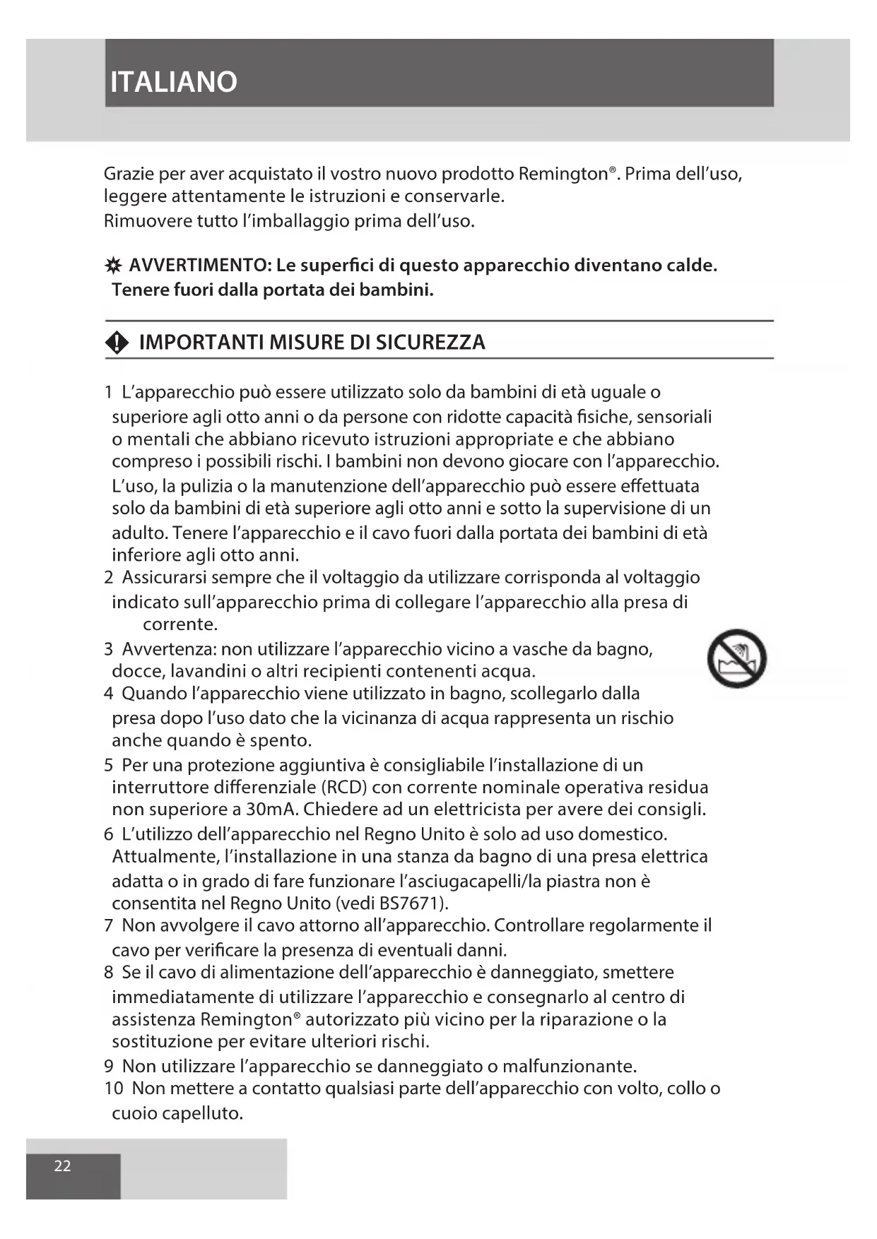 1 L’apparecchio può essere utilizzato solo da bambini di età uguale o superiore agli otto anni o da persone con ridotte capacità siche, sensoriali o mentali che abbiano ricevuto istruzioni appropriate e che abbiano compreso i possibili rischi. I bambini non devono giocare con l’apparecchio. L’uso, la pulizia o la manutenzione dell’apparecchio può essere eettuata solo da bambini di età superiore agli otto anni e sotto la supervisione di un adulto. Tenere l’apparecchio e il cavo fuori dalla portata dei bambini di età inferiore agli otto anni. 2 Assicurarsi sempre che il voltaggio da utilizzare corrisponda al voltaggio indicato sull’apparecchio prima di collegare l’apparecchio alla presa di corrente. 3 Avvertenza: non utilizzare l’apparecchio vicino a vasche da bagno, docce, lavandini o altri recipienti contenenti acqua. 4 Quando l’apparecchio viene utilizzato in bagno, scollegarlo dalla presa dopo l’uso dato che la vicinanza di acqua rappresenta un rischio anche quando è spento. 5 Per una protezione aggiuntiva è consigliabile l’installazione di un interruttore dierenziale (RCD) con corrente nominale operativa residua non superiore a 30mA. Chiedere ad un elettricista per avere dei consigli. 6 L’utilizzo dell’apparecchio nel Regno Unito è solo ad uso domestico. Attualmente, l’installazione in una stanza da bagno di una presa elettrica adatta o in grado di fare funzionare l’asciugacapelli/la piastra non è consentita nel Regno Unito (vedi BS7671). 7 Non avvolgere il cavo attorno all’apparecchio. Controllare regolarmente il cavo per vericare la presenza di eventuali danni. 8 Se il cavo di alimentazione dell’apparecchio è danneggiato, smettere immediatamente di utilizzare l’apparecchio e consegnarlo al centro di assistenza Remington® autorizzato più vicino per la riparazione o la sostituzione per evitare ulteriori rischi. 9 Non utilizzare l’apparecchio se danneggiato o malfunzionante. 10 Non mettere a contatto qualsiasi parte dell’apparecchio con volto, collo o cuoio capelluto. ITALIANO23 11 Tenere il usso d’aria diretta lontano dagli occhi e da altre zone sensibili. 12 Durante l’uso, fare attenzione che la griglia posteriore non sia bloccata in quanto ciò causerebbe l’arresto automatico dell’apparecchio. Se questo dovesse succedere, spegnere e fare rareddare l’apparecchio. 13 Assicurarsi che la griglia posteriore sia libera da ostruzioni quali lanugine, capelli etc. 14 Non lasciare l’apparecchio incustodito quando è collegato alla presa. 15 Non appoggiare l’apparecchio mentre è in funzione. 16 Non collocare l’apparecchio su mobili delicati. 17 Non utilizzare accessori diversi da quelli forniti in dotazione. 18 Questo apparecchio non è destinato all’uso commerciale o professionale. 19 Lasciare rareddare l’apparecchio prima di pulirlo e riporlo.