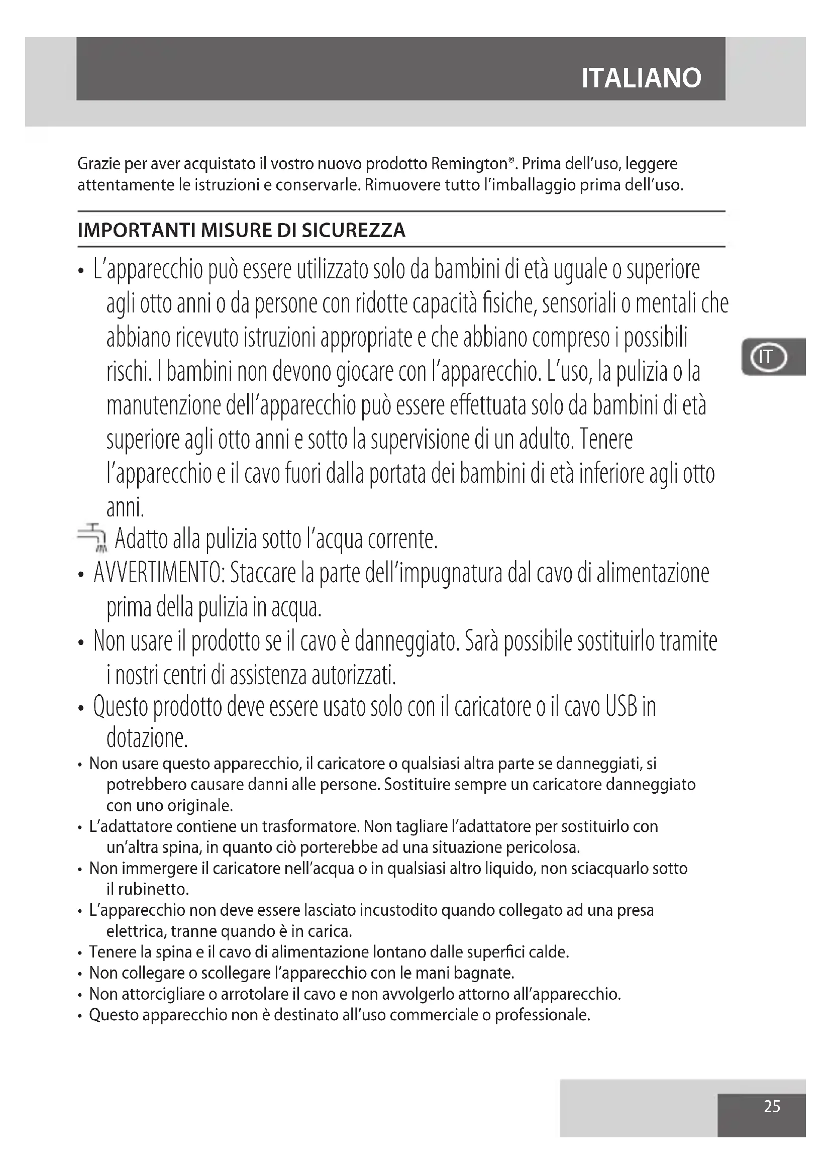Grazie per aver acquistato il vostro nuovo prodotto Remington. Prima dell'uso, leggere attendamente le istruzioni e conservare. Rimuovere tutto l'imballaggio prima dell'uso.