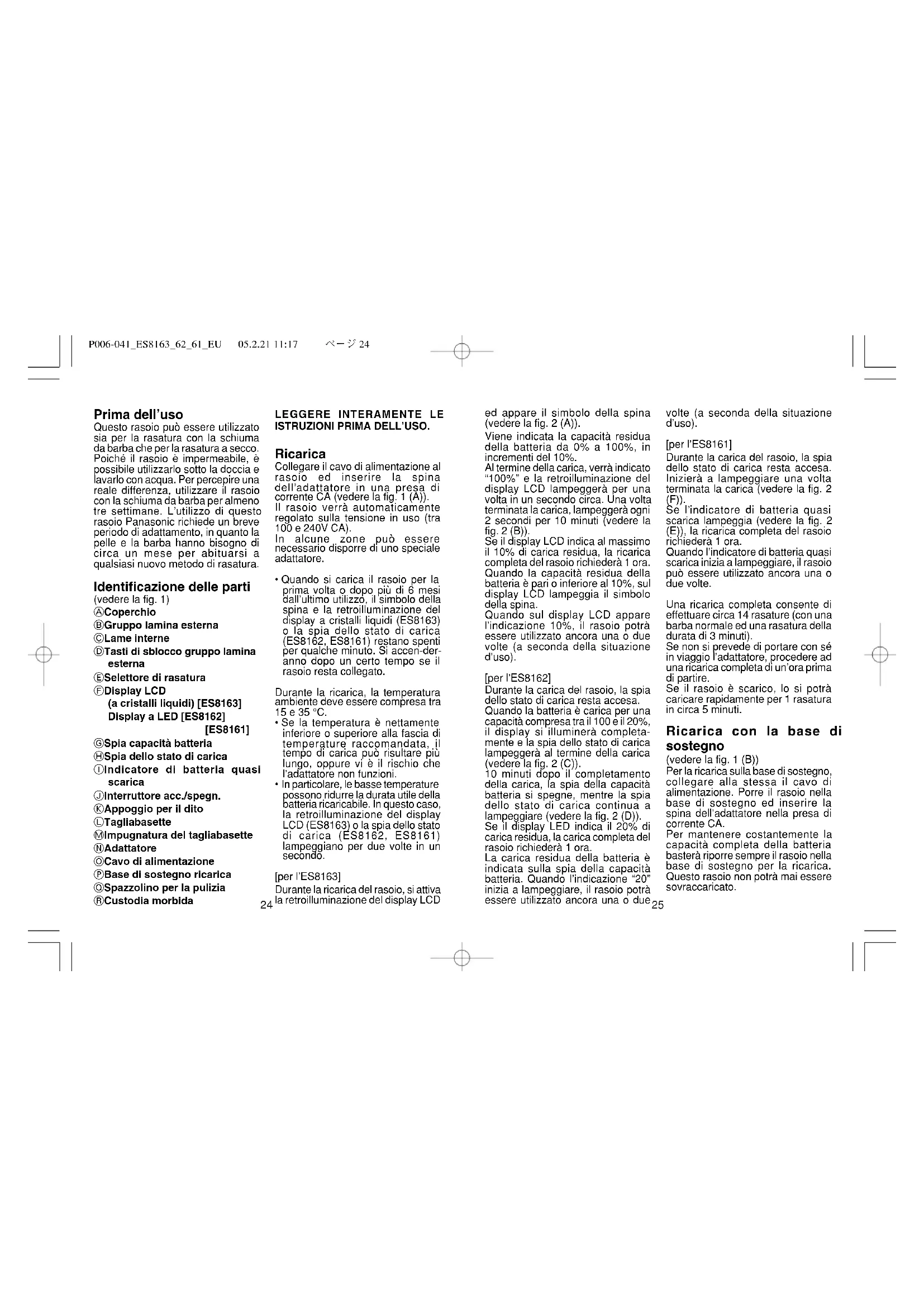 P006-041ES81636261EU 05.2.21 11:17 ページ228 ed appare il simbolo della spina (vedere la fig. 2 (A)). Viene indicata la capacità residua della batteria da 0% a 100%, in incrementi del 10%. Al termine della carica, verrà indicato “100%” e la retroilluminazione del display LCD lampeggerà per una volta in un secondo circa. Una volta terminata la carica, lampeggerà ogni 2 secondi per 10 minuti (vedere la fig. 2 (B)). Se il display LCD indica al massimo il 10% di carica residua, la ricarica completa del rasoio richiederà 1 ora. Quando la capacità residua della batteria è pari o inferiore al 10%, sul display LCD lampeggia il simbolo della spina. Quando sul display LCD appare l’indicazione 10%, il rasoio potrà essere utilizzato ancora una o due volte (a seconda della situazione d’uso). [per l’ES8162] Durante la carica del rasoio, la spia dello stato di carica resta accesa. Quando la batteria è carica per una capacità compresa tra il 100 e il 20%, il display si illuminerà completa- mente e la spia dello stato di carica lampeggerà al termine della carica (vedere la fig. 2 (C)). 10 minuti dopo il completamento della carica, la spia della capacità batteria si spegne, mentre la spia dello stato di carica continua a lampeggiare (vedere la fig. 2 (D)). Se il display LED indica il 20% di carica residua, la carica completa del rasoio richiederà 1 ora. La carica residua della batteria è indicata sulla spia della capacità batteria. Quando l’indicazione “20” inizia a lampeggiare, il rasoio potrà essere utilizzato ancora una o due volte (a seconda della situazione d’uso). [per l’ES8161] Durante la carica del rasoio, la spia dello stato di carica resta accesa. Inizierà a lampeggiare una volta terminata la carica (vedere la fig. 2 (F)). Se l’indicatore di batteria quasi scarica lampeggia (vedere la fig. 2 (E)), la ricarica completa del rasoio richiederà 1 ora. Quando l’indicatore di batteria quasi scarica inizia a lampeggiare, il rasoio può essere utilizzato ancora una o due volte. Una ricarica completa consente di effettuare circa 14 rasature (con una barba normale ed una rasatura della durata di 3 minuti). Se non si prevede di portare con sé in viaggio l’adattatore, procedere ad una ricarica completa di un’ora prima di partire. Se il rasoio è scarico, lo si potrà caricare rapidamente per 1 rasatura in circa 5 minuti. Ricarica con la base di sostegno (vedere la fig. 1 (B)) Per la ricarica sulla base di sostegno, collegare alla stessa il cavo di alimentazione. Porre il rasoio nella base di sostegno ed inserire la spina dell’adattatore nella presa di corrente CA. Per mantenere costantemente la capacità completa della batteria basterà riporre sempre il rasoio nella base di sostegno per la ricarica. Questo rasoio non potrà mai essere sovraccaricato.