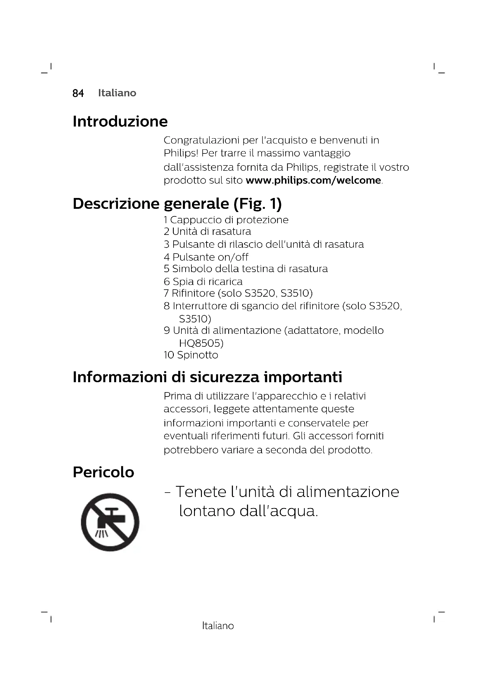 FrançaisItaliano Introduzione Congratulazioni per l'acquisto e benvenuti in Philips! Per trarre il massimo vantaggio dall'assistenza fornita da Philips, registrate il vostro prodotto sul sito www.philips.com/welcome. Descrizione generale (Fig. 1) 1 Cappuccio di protezione 2 Unità di rasatura 3 Pulsante di rilascio dell'unità di rasatura 4 Pulsante on/off 5 Simbolo della testina di rasatura 6 Spia di ricarica 7 Rifinitore (solo S3520, S3510) 8 Interruttore di sgancio del rifinitore (solo S3520, S3510) 9 Unità di alimentazione (adattatore, modello HQ8505) 10 Spinotto Informazioni di sicurezza importanti Prima di utilizzare l'apparecchio e i relativi accessori, leggete attentamente queste informazioni importanti e conservatele per eventuali riferimenti futuri. Gli accessori forniti potrebbero variare a seconda del prodotto. Pericolo - Tenete l'unità di alimentazione lontano dall'acqua.