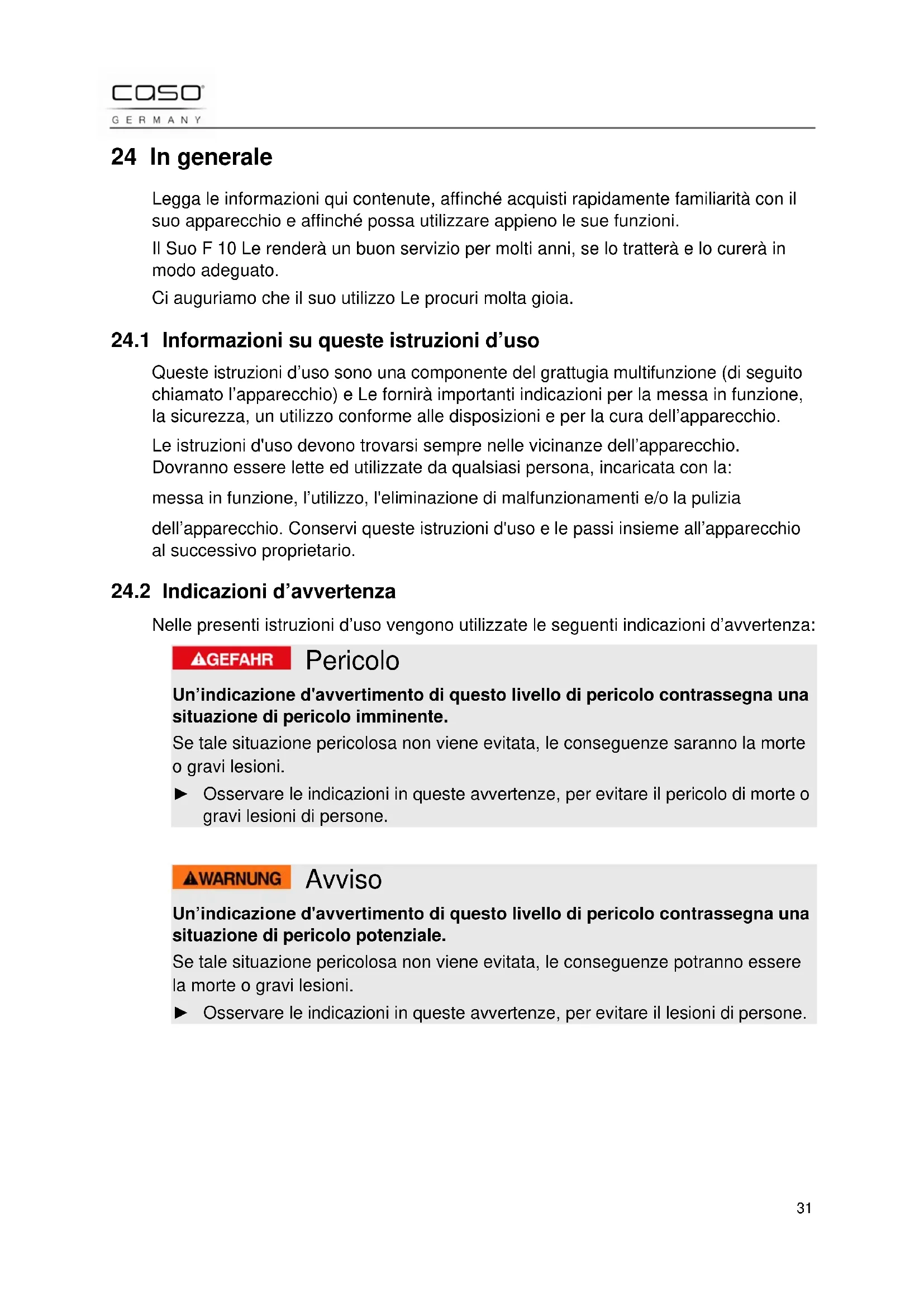 Indicazione ► Si serva dell'area ecologica realizzata nel suo comune di residenza, per la consegna ed il riciclo di apparecchi elettrici o elettronici obsoleti. Si informi eventualmente presso il Suo comune, il Suo servizio di nettezza urbana o presso il suo rivenditore. ► Si assicuri, che il suo apparecchio obsoleto venga stoccato a prova di bambini, fino al momento della sua rimozione.39 30 Garanzia (USA) A partire dalla data di vendita assumiamo per questo prodotto una garanzia di 12 mesi per difetti, riconducibili ad errori di fabbricazione o nelle materie prime. Non contenute nella garanzia sono i danni, che si sono verificati a causa di un trattamento o un impiego inadeguato, così come i danni, che compromettono solo lievemente il funzionamento o il valore dell’apparecchio. Inoltre si escludono dalle pretese di garanzia pezzi d'usura, danni dovuti al trasporto, fin tanto questi non siano imputabili alla nostra responsabilità, così come danni, che sono riconducibili a riparazioni non eseguiti da noi. Questo apparecchio è stato realizzato per un utilizzo in ambito privato (impiego domestico) ed è stato realizzato con una potenza adeguata. Un eventuale utilizzo di tipo commerciale è assoggettabile alla garanzia, solo fintanto il suo utilizzo possa essere confrontato con quello in ambito privato. Non è previsto per un uso che vada oltre questo tipo di utilizzo commerciale. In caso di reclami giustificati, saremo liberi di scegliere se riparare l’apparecchio o se è il caso di sostituirlo con uno privo di malfunzionamenti. Malfunzionamenti aperti dovranno essere comunicati entro 14 giorni dalla fornitura. Altre pretese sono escluse. Per far valere una pretesa di garanzia, La preghiamo di mettersi in contatto con noi prima di reinviarci l’apparecchio (sempre con scontrino d’acquisto!). Appliance Sales & Service 840 Folsom Street San Francisco, CA 94107 USA service@caso-germany.com US-service no.: (855) 230 – 9284, OPTION 1 International service no. : +49 2932 – 54766 – 79 International fax no. : +49 2932 – 54766 – 7740 31 Garanzia (Europa) A partire dalla data di vendita assumiamo per questo prodotto una garanzia di 24 mesi per difetti, riconducibili ad errori di fabbricazione o nelle materie prime. Ciò non ha alcuna influenza sulle sue pretese di garanzia di legge in conformità al §439 e seguenti del BGB-E. Non contenute nella garanzia sono i danni, che si sono verificati a causa di un trattamento o un impiego inadeguato, così come i danni, che compromettono solo lievemente il funzionamento o il valore dell’apparecchio. Inoltre si escludono dalle pretese di garanzia pezzi d'usura, danni dovuti al trasporto, fin tanto questi non siano imputabili alla nostra responsabilità, così come danni, che sono riconducibili a riparazioni non eseguiti da noi. Questo apparecchio è stato realizzato per un utilizzo in ambito privato (impiego domestico) ed è stato realizzato con una potenza adeguata. Un eventuale utilizzo di tipo commerciale è assoggettabile alla garanzia, solo fintanto il suo utilizzo possa essere confrontato con quello in ambito privato. Non è previsto per un uso che vada oltre questo tipo di utilizzo commerciale. In caso di reclami giustificati, saremo liberi di scegliere se riparare l’apparecchio o se è il caso di sostituirlo con uno privo di malfunzionamenti. Malfunzionamenti aperti dovranno essere comunicati entro 14 giorni dalla fornitura. Altre pretese sono escluse. Per far valere una pretesa di garanzia, La preghiamo di mettersi in contatto con noi prima di reinviarci l’apparecchio (sempre con scontrino d’acquisto!). caso Germany / Braukmann GmbH Raiffeisenstraße 9 D-59757 Arnsberg Service-Hotline International: Tel.: +49 (0) 29 32 / 80 55 4 – 99 Fax: +49 (0) 29 32 / 80 55 4 – 77 eMail: kundenservice@caso-germany.de Internet: www.caso-germany.de41 32 Algemeen Lees de hier vermelde informatie, zodat u snel vertrouwd raakt met uw apparaat en al zijn functies in volle omvang kunt gebruiken. U heeft jaren lang plezier van uw F10 als u hem vakkundig behandelt en onderhoudt. Wij wensen u veel plezier met het gebruik.