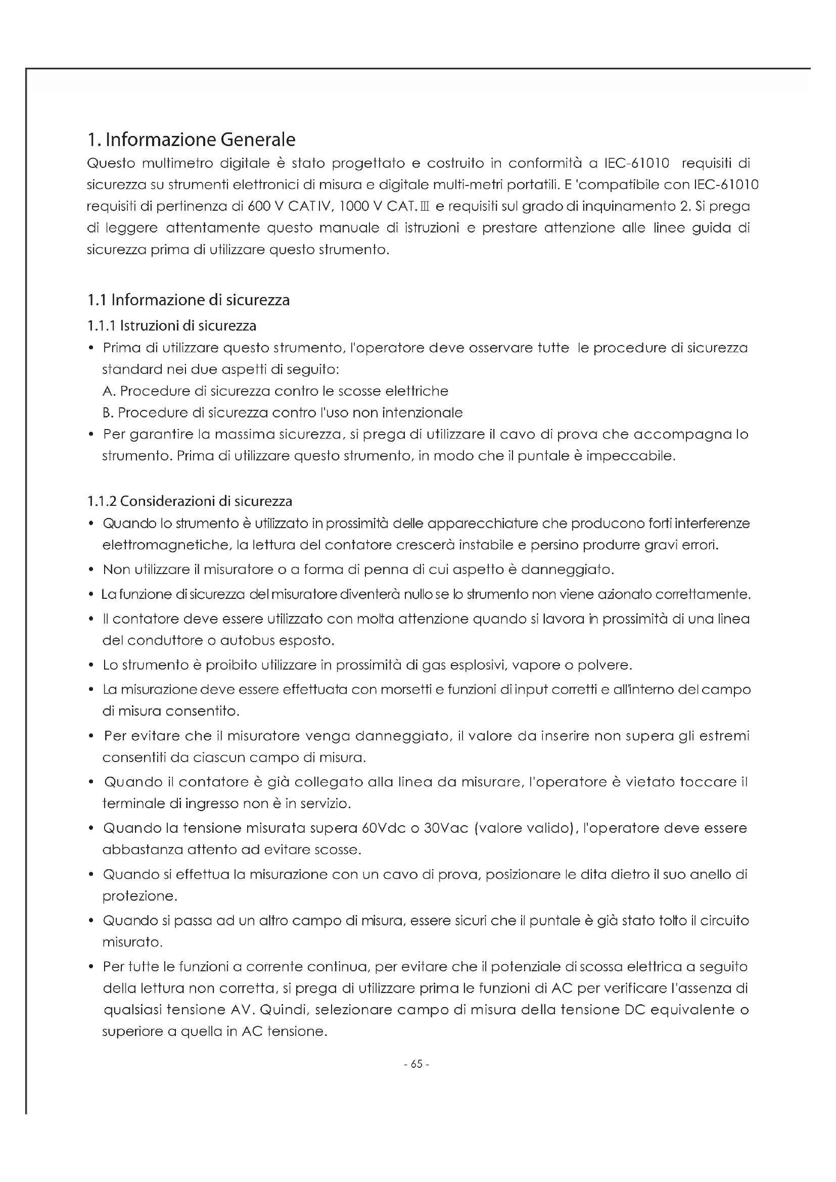 Questo multimetro digitale è stato progettato e costruito in conformità a IEC-61010 requisiti di sicurezza su strumenti elettronici di misura e digitale multi-metri portatili. E 'compatibile con IEC-61010 requisiti di pertinenza di 600 V CAT IV, 1000 V CAT.Ⅲ e requisiti sul grado di inquinamento 2. Si prega di leggere attentamente questo manuale di istruzioni e prestare attenzione alle linee guida di sicurezza prima di utilizzare questo strumento.