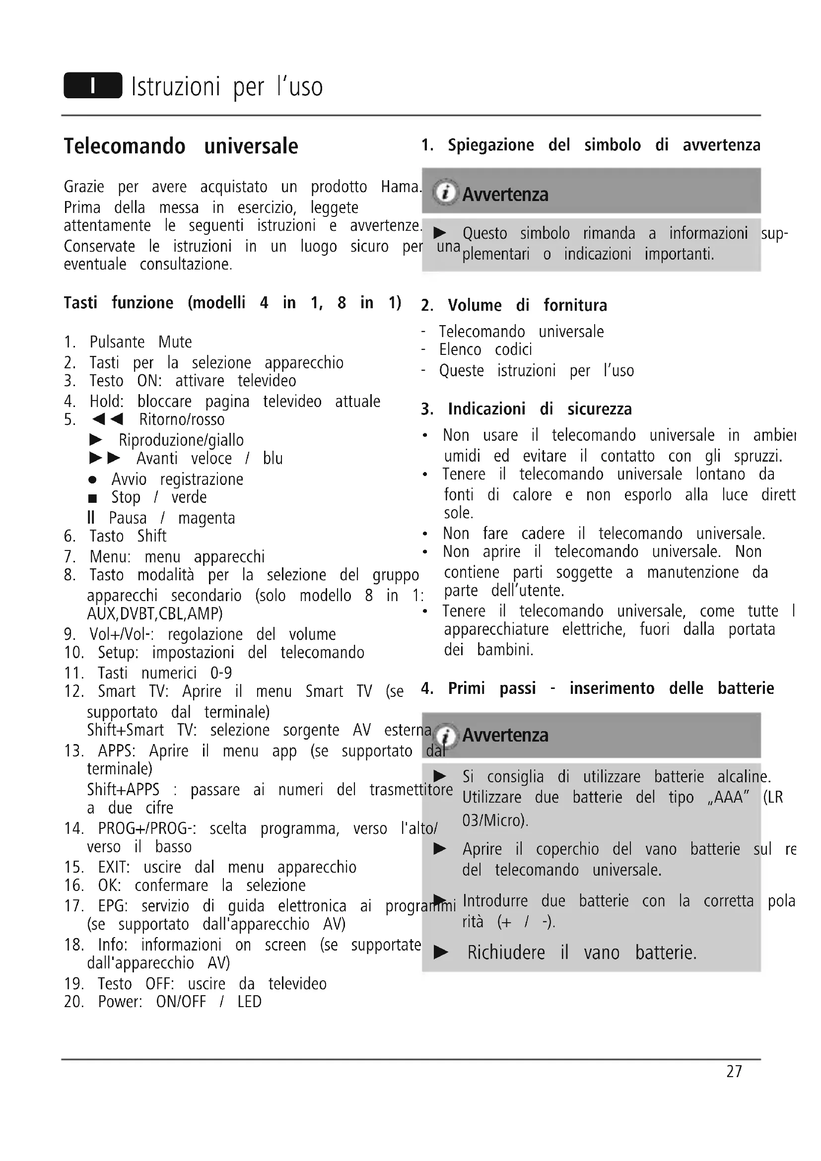 Informazioni per protezione ambientale: Dopo l’implementazione della Direttiva Europea 2012/19/EU e 2006/66/EU nel sistema legale nazionale, ci sono le seguenti applicazioni: Le apparecchiature elettriche ed elettroniche e le batterie non devono essere smaltite con i riuti domestici. I consumatori sono obbligati dalla legge a restituire I dispositivi elettrici ed elettronici e le batterie alla ne della loro vita utile ai punti di raccolta pubblici preposti per questo scopo o nei punti vendita. Dettagli di quanto riportato sono deniti dalle leggi nazionali di ogni stato. Questo simbolo sul prodotto, sul manuale d’istruzioni o sull’imballo indicano che questo prodotto è soggetto a queste regole. Riciclando, ri-utilizzando i materiali o utilizzando sotto altra forma i vecchi prodotti/le batterie, darete un importante contributo alla protezione dell’ambiente. 31Universele afstandsbediening Hartelijk dank dat u voor een Hama-product heeft gekozen. Neemt u zich de tijd en lees de onderstaande aanwijzingen en informatie allereerst geheel door. Bewaar deze instructies op een veilige plek als naslagwerk voor op een later tijdstip. Functietoetsen (modellen 4 in 1, 8 in 1)