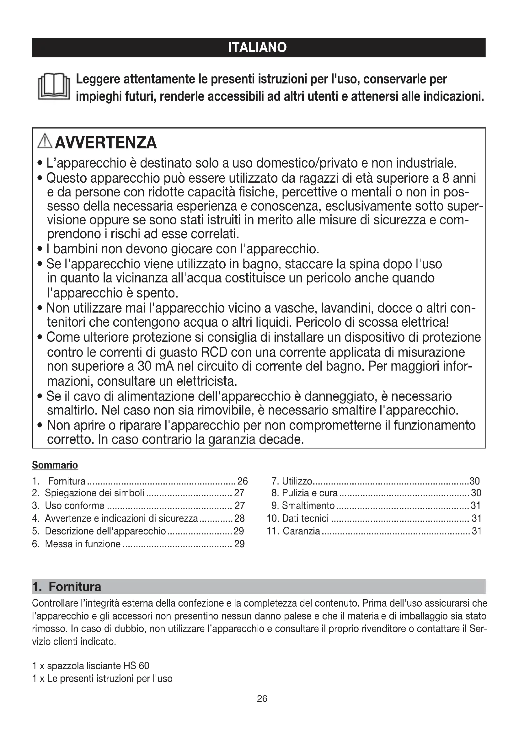 - Non aprire o riparare l'apparecchio per non comprometterne il funzionamento corretto. In caso contrario la garanzia decade. Leggere attentamente le presenti istruzioni per l'uso, conservarle per impieghi futuri, renderle accessibili ad altri utenti e attenersi alle indicazioni. Sommario