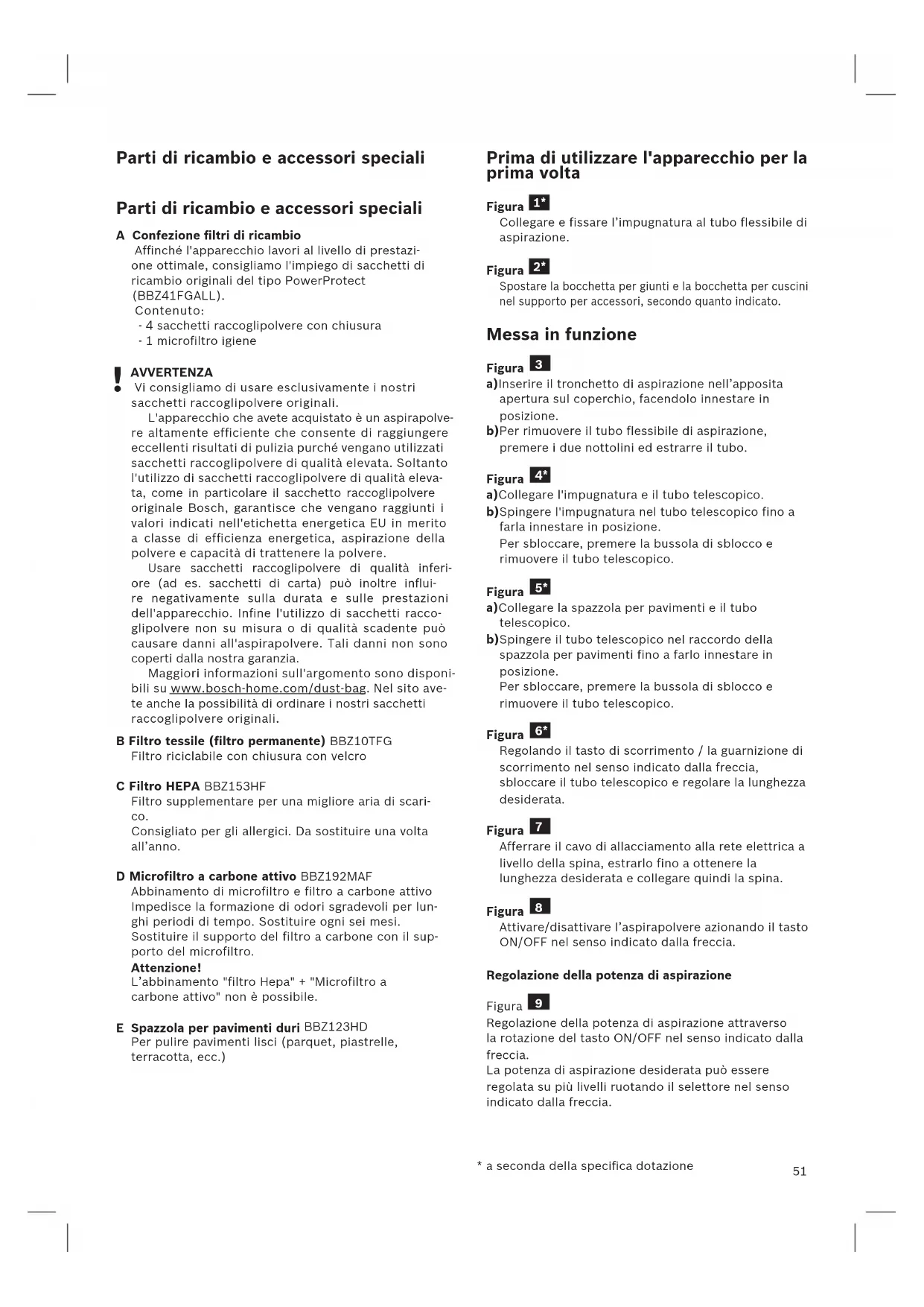 - a seconda della specifica dotazione Parti di ricambio e accessori speciali A Confezione filtri di ricambio Affinché l'apparecchio lavori al livello di prestazi- one ottimale, consigliamo l'impiego di sacchetti di ricambio originali del tipo PowerProtect (BBZ41FGALL). Contenuto: - 4 sacchetti raccoglipolvere con chiusura - 1 microfiltro igiene