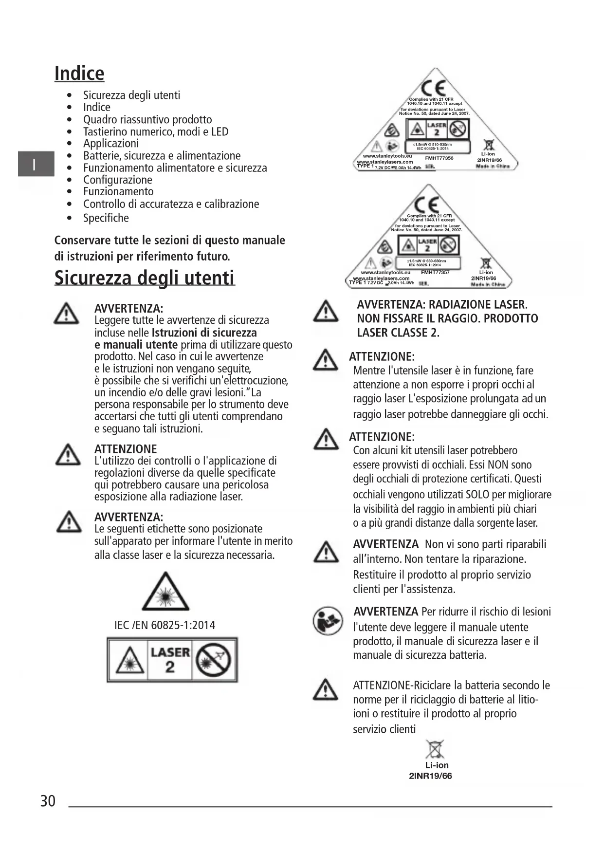 LASER CLASSE 2. ATTENZIONE: Mentre l'utensile laser èin funzione, fare attenzione anon esporre ipropri occhi al raggio laser L'esposizione prolungata ad un raggio laser potrebbe danneggiare gli occhi. ATTENZIONE: Con alcuni kit utensili laser potrebbero essere provvisti di occhiali. Essi NON sono degli occhiali di protezione certicati. Questi occhiali vengono utilizzati SOLO per migliorare la visibilità del raggio in ambienti più chiari oapiù grandi distanze dalla sorgente laser. AVVERTENZA Non vi sono parti riparabili all’interno. Non tentare la riparazione. Restituire il prodotto al proprio servizio clienti per l'assistenza. AVVERTENZA Per ridurre il rischio di lesioni l'utente deve leggere il manuale utente prodotto, il manuale di sicurezza laser eil manuale di sicurezza batteria. ATTENZIONE-Riciclare la batteria secondo le norme per il riciclaggio di batterie al litio- ioni orestituire il prodotto al proprio servizio clienti 2INR19/66 Li-ion