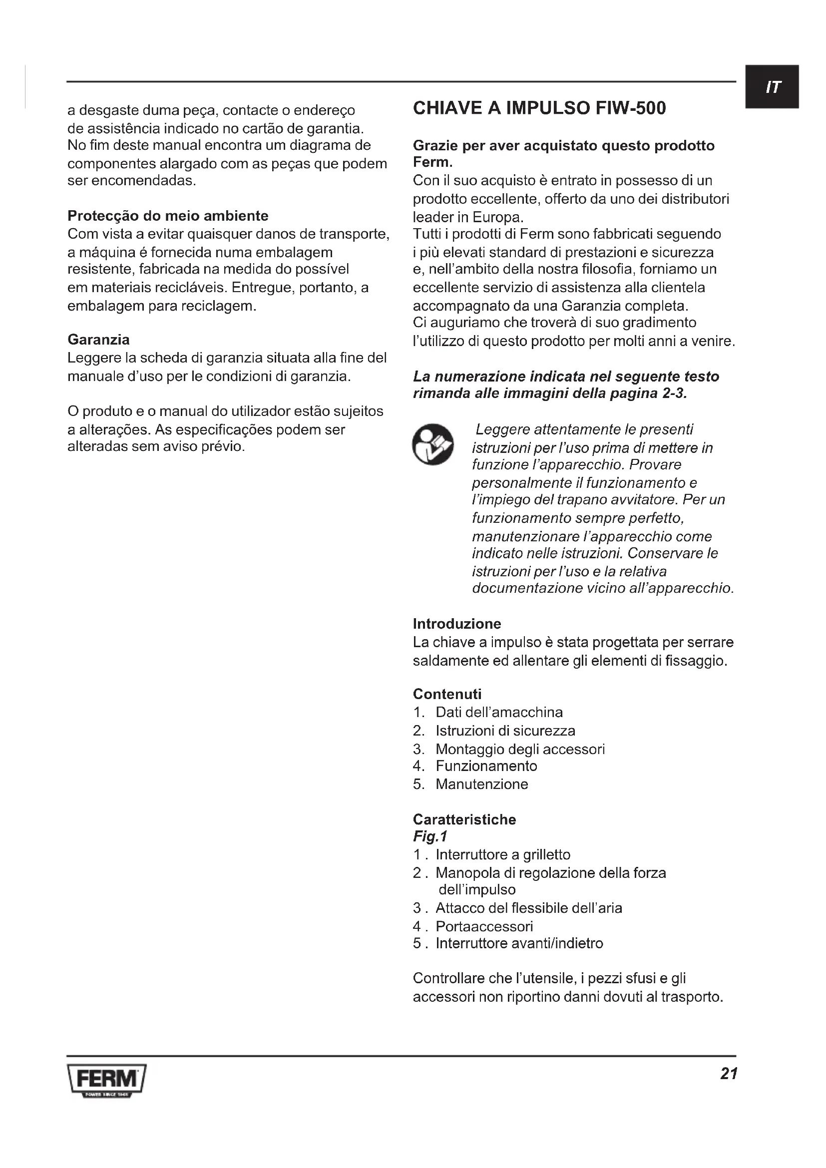 Grazie per aver acquistato questo prodotto Ferm. Con il suo acquisto è entrato in possesso di un prodotto eccellente, offerto da uno dei distributori leader in Europa. Tutti i prodotti di Ferm sono fabbricati seguendo i più elevati standard di prestazioni e sicurezza e, nell’ambito della nostra filosofia, forniamo un eccellente servizio di assistenza alla clientela accompagnato da una Garanzia completa. Ci auguriamo che troverà di suo gradimento l’utilizzo di questo prodotto per molti anni a venire. La numerazione indicata nel seguente testo rimanda alle immagini della pagina 2-3. Leggere attentamente le presenti istruzioni per l’uso prima di mettere in funzione l’apparecchio. Provare personalmente il funzionamento e l’impiego del trapano avvitatore. Per un funzionamento sempre perfetto, manutenzionare l’apparecchio come indicato nelle istruzioni. Conservare le istruzioni per l’uso e la relativa documentazione vicino all’apparecchio. Introduzione La chiave a impulso è stata progettata per serrare saldamente ed allentare gli elementi di fissaggio. Contenuti
