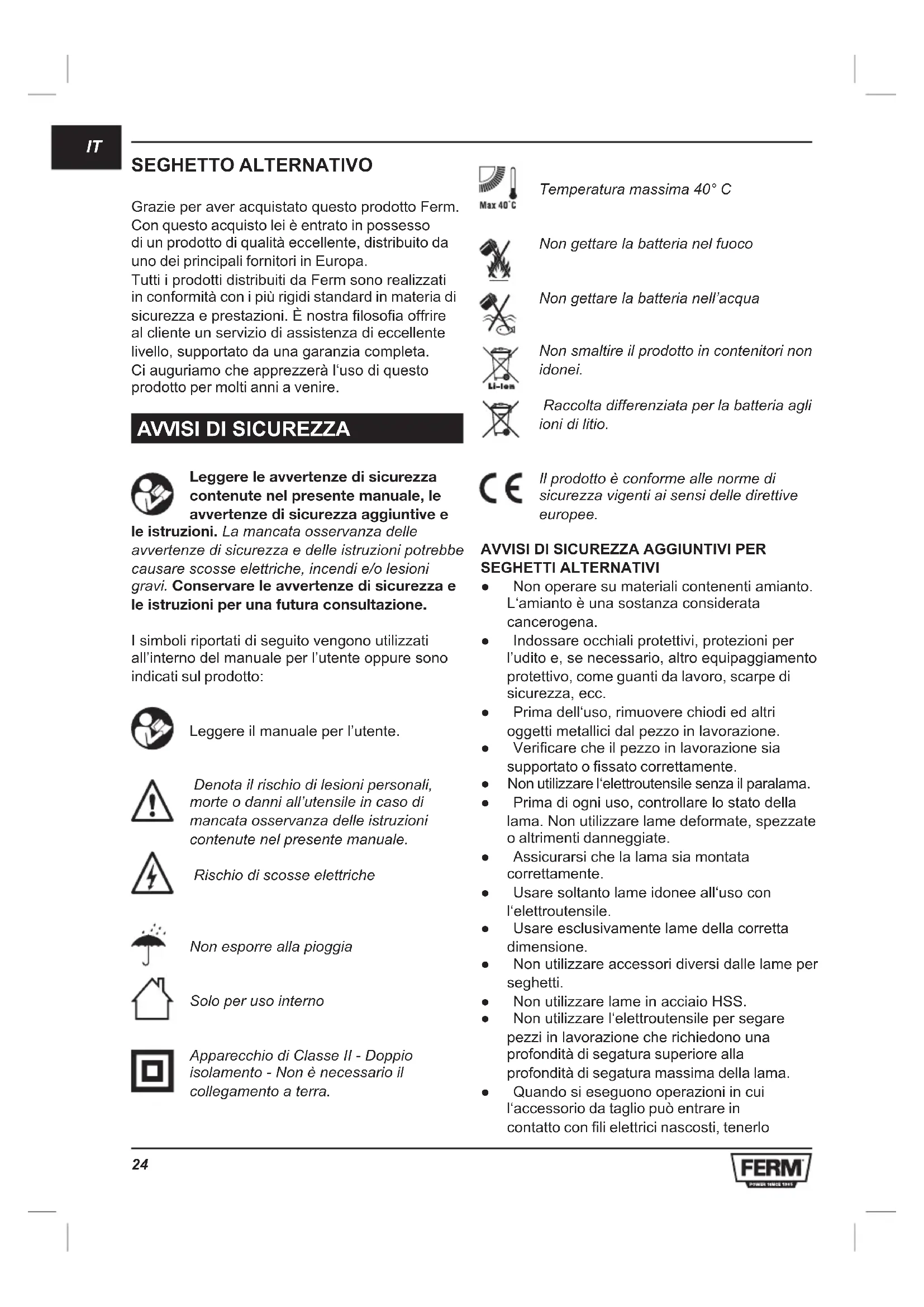 segHettO aLternatiVO GrazieperaveracquistatoquestoprodottoFerm. Con questo acquisto lei è entrato in possesso di un prodotto di qualità eccellente, distribuito da uno dei principali fornitori in Europa. TuttiiprodottidistribuitidaFermsonorealizzati in conformità con i più rigidi standard in materia di sicurezzaeprestazioni.Ènostrafilosofiaoffrire alclienteunserviziodiassistenzadieccellente livello,supportatodaunagaranziacompleta. Ciauguriamocheapprezzeràl‘usodiquesto prodotto per molti anni a venire. aVVisi Di siCUreZZa Leggere le avvertenze di sicurezza contenute nel presente manuale, le avvertenze di sicurezza aggiuntive e le istruzioni. La mancata osservanza delle avvertenze di sicurezza e delle istruzioni potrebbe causare scosse elettriche, incendi e/o lesioni gravi. Conservare le avvertenze di sicurezza e le istruzioni per una futura consultazione. Isimboliriportatidiseguitovengonoutilizzati all’internodelmanualeperl’utenteoppuresono indicati sul prodotto: Leggereilmanualeperl’utente. Denota il rischio di lesioni personali, morte o danni all’utensile in caso di mancata osservanza delle istruzioni contenute nel presente manuale. Rischio di scosse elettriche Non esporre alla pioggia Solo per uso interno Apparecchio di Classe II - Doppio isolamento - Non è necessario il collegamento a terra. Temperatura massima 40° C Non gettare la batteria nel fuoco Non gettare la batteria nell’acqua Non smaltire il prodotto in contenitori non idonei. Raccolta differenziata per la batteria agli ioni di litio. Il prodotto è conforme alle norme di sicurezza vigenti ai sensi delle direttive europee. aVVisi Di siCUreZZa aggiUntiVi Per segHetti aLternatiVi ● Nonoperaresumaterialicontenentiamianto. L‘amiantoèunasostanzaconsiderata cancerogena. ● Indossareocchialiprotettivi,protezioniper l’uditoe,senecessario,altroequipaggiamento protettivo, come guanti da lavoro, scarpe di sicurezza,ecc. ● Primadell‘uso,rimuoverechiodiedaltri oggettimetallicidalpezzoinlavorazione. ● Verificarecheilpezzoinlavorazionesia supportato o fissato correttamente. ● Nonutilizzarel‘elettroutensilesenzailparalama. ● Primadiogniuso,controllarelostatodella lama.Nonutilizzarelamedeformate,spezzate o altrimenti danneggiate. ● Assicurarsichelalamasiamontata correttamente. ● Usaresoltantolameidoneeall‘usocon l‘elettroutensile. ● Usareesclusivamentelamedellacorretta dimensione. ● Nonutilizzareaccessoridiversidallelameper seghetti. ● NonutilizzarelameinacciaioHSS. ● Nonutilizzarel‘elettroutensilepersegare pezziinlavorazionecherichiedonouna profondità di segatura superiore alla profondità di segatura massima della lama. ● Quandosieseguonooperazioniincui l‘accessorio da taglio può entrare in contatto con fili elettrici nascosti, tenerloIT