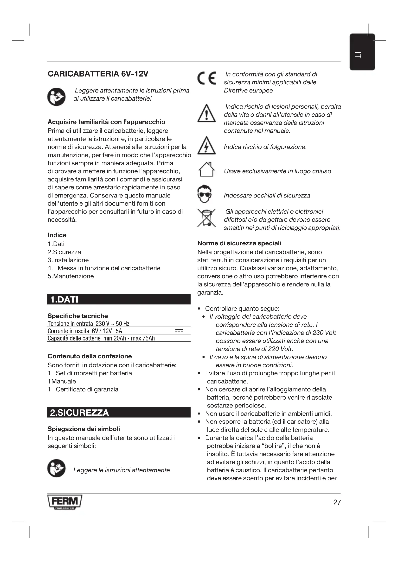 Specifiche tecniche Tensione in entrata 230 V ~ 50 Hz Corrente in uscita 6V / 12V 5A Capacità delle batterie min 20Ah - max 75Ah Contenuto della confezione Sono forniti in dotazione con il caricabatterie: 1 Set di morsetti per batteria 1 Manuale 1 Certificato di garanzia