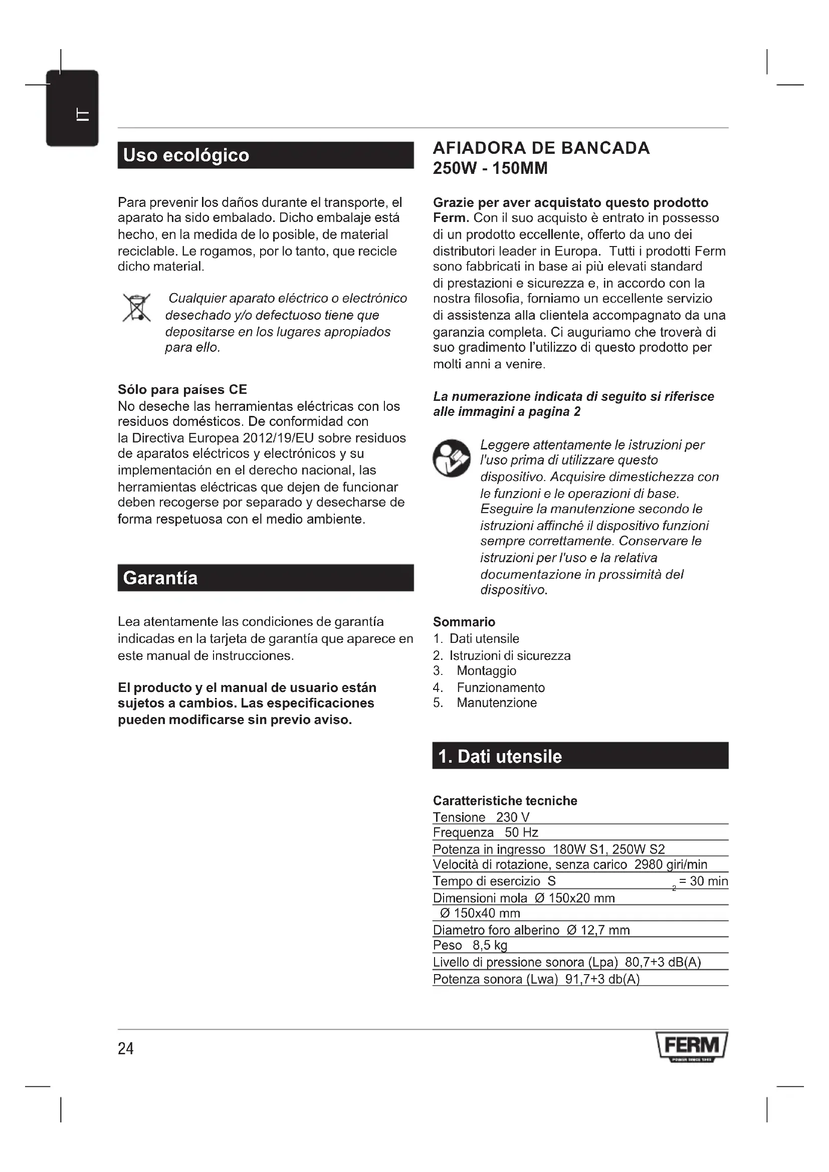 250W - 150MM Grazie per aver acquistato questo prodotto Ferm. Con il suo acquisto è entrato in possesso di un prodotto eccellente, offerto da uno dei distributori leader in Europa. Tutti i prodotti Ferm sono fabbricati in base ai più elevati standard di prestazioni e sicurezza e, in accordo con la nostra filosofia, forniamo un eccellente servizio di assistenza alla clientela accompagnato da una garanzia completa. Ci auguriamo che troverà di suo gradimento l’utilizzo di questo prodotto per molti anni a venire. La numerazione indicata di seguito si riferisce alle immagini a pagina 2 Leggere attentamente le istruzioni per l'uso prima di utilizzare questo dispositivo. Acquisire dimestichezza con le funzioni e le operazioni di base. Eseguire la manutenzione secondo le istruzioni affinché il dispositivo funzioni sempre correttamente. Conservare le istruzioni per l'uso e la relativa documentazione in prossimità del dispositivo. Sommario