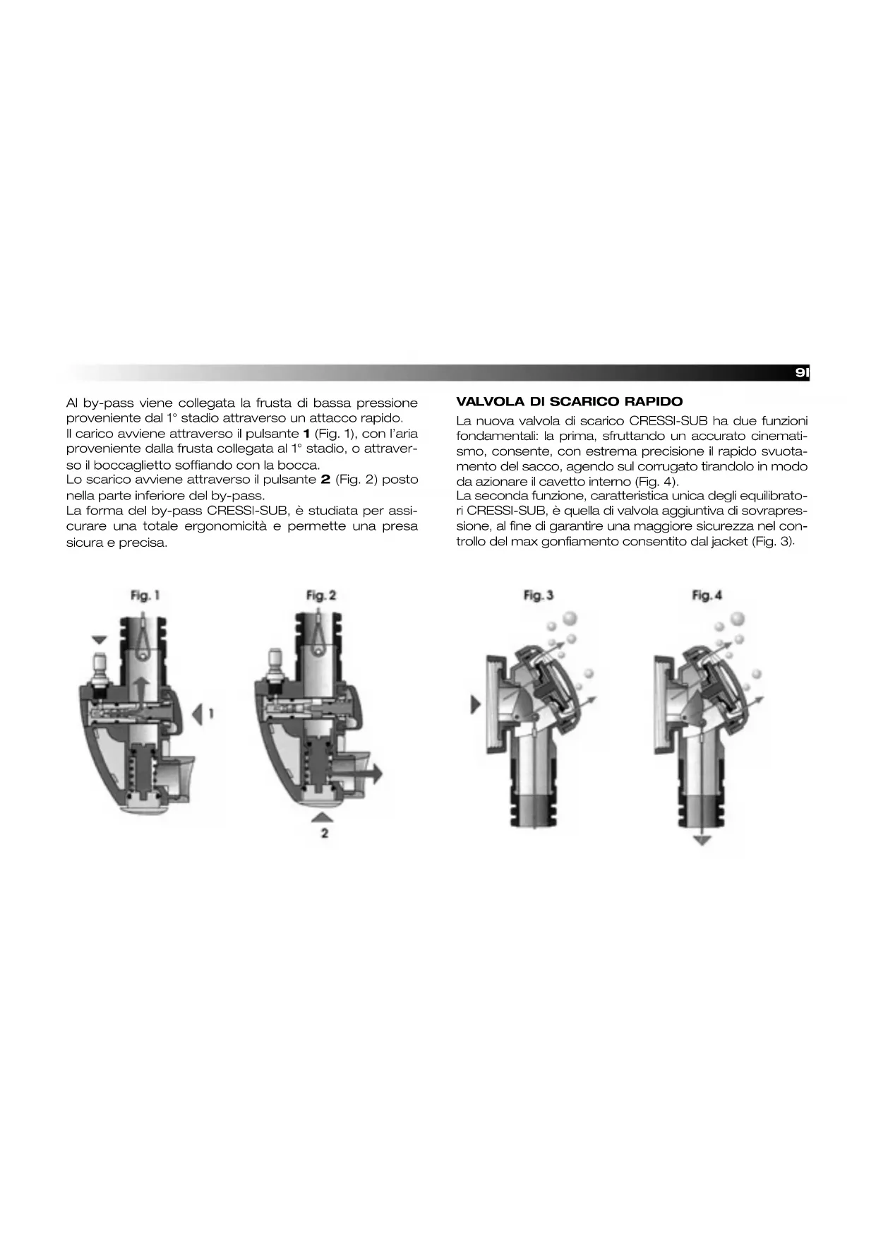 TO DA CRESSI-SUB. Libretto 25/10/05 25-10-2005 12:53 Pagina 78 Italiano Libretto 25/10/05 25-10-2005 12:53 Pagina 89Italiano Al by-pass viene collegata la frusta di bassa pressione proveniente dal 1° stadio attraverso un attacco rapido. Il carico avviene attraverso il pulsante 1 (Fig. 1), con l’aria proveniente dalla frusta collegata al 1° stadio, o attraver- so il boccaglietto soffiando con la bocca. Lo scarico avviene attraverso il pulsante 2 (Fig. 2) posto nella parte inferiore del by-pass. La forma del by-pass CRESSI-SUB, è studiata per assi- curare una totale ergonomicità e permette una presa sicura e precisa. VALVOLA Dl SCARICO RAPIDO La nuova valvola di scarico CRESSI-SUB ha due funzioni fondamentali: la prima, sfruttando un accurato cinemati- smo, consente, con estrema precisione il rapido svuota- mento del sacco, agendo sul corrugato tirandolo in modo da azionare il cavetto interno (Fig. 4). La seconda funzione, caratteristica unica degli equilibrato- ri CRESSI-SUB, è quella di valvola aggiuntiva di sovrapres- sione, al fine di garantire una maggiore sicurezza nel con- trollo del max gonfiamento consentito dal jacket (Fig. 3