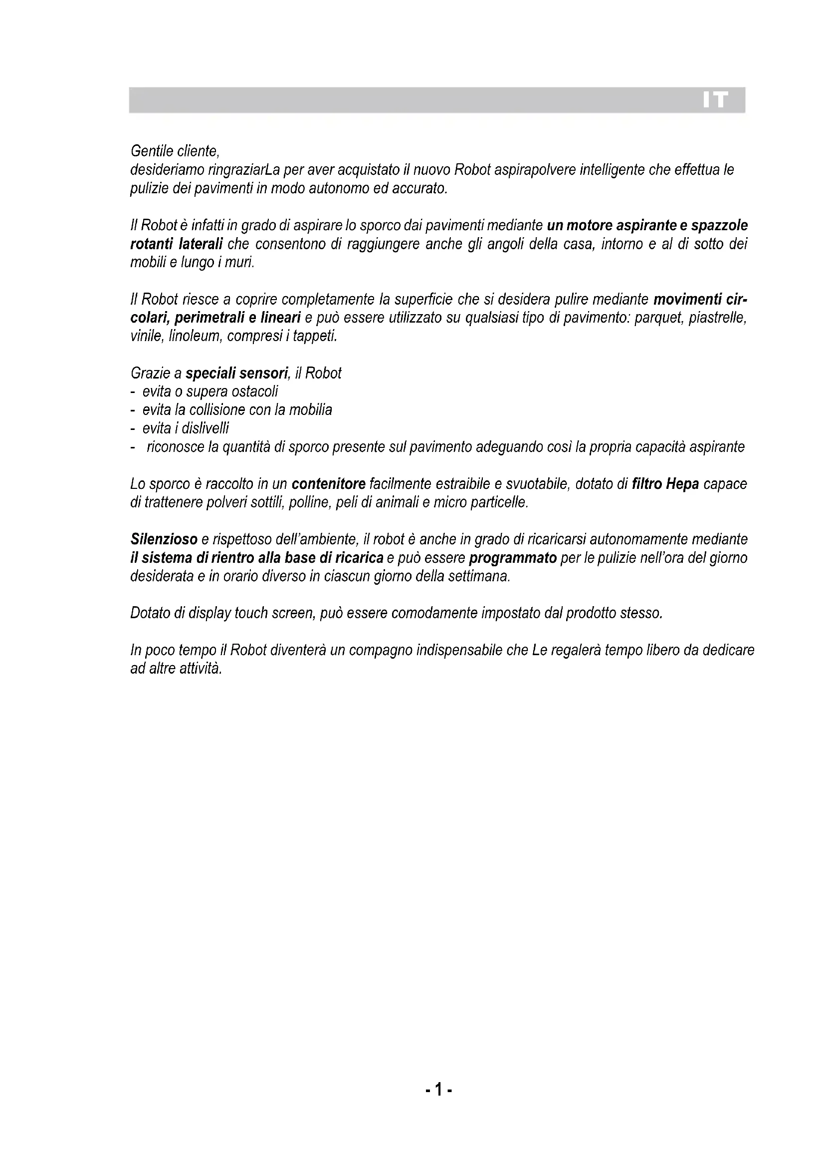 Gentile cliente, desideriamo ringraziarLa per aver acquistato il nuovo Robot aspirapolvere intelligente che effettua le pulizie dei pavimenti in modo autonomo ed accurato. Il Robot è infatti in grado di aspirare lo sporco dai pavimenti mediante un motore aspirante e spazzole rotanti laterali che consentono di raggiungere anche gli angoli della casa, intorno e al di sotto dei mobili e lungo i muri. Il Robot riesce a coprire completamente la superficie che si desidera pulire mediante movimenti cir- colari, perimetrali e lineari e può essere utilizzato su qualsiasi tipo di pavimento: parquet, piastrelle, vinile, linoleum, compresi i tappeti. Grazie a speciali sensori, il Robot - evita o supera ostacoli - evita la collisione con la mobilia - evita i dislivelli