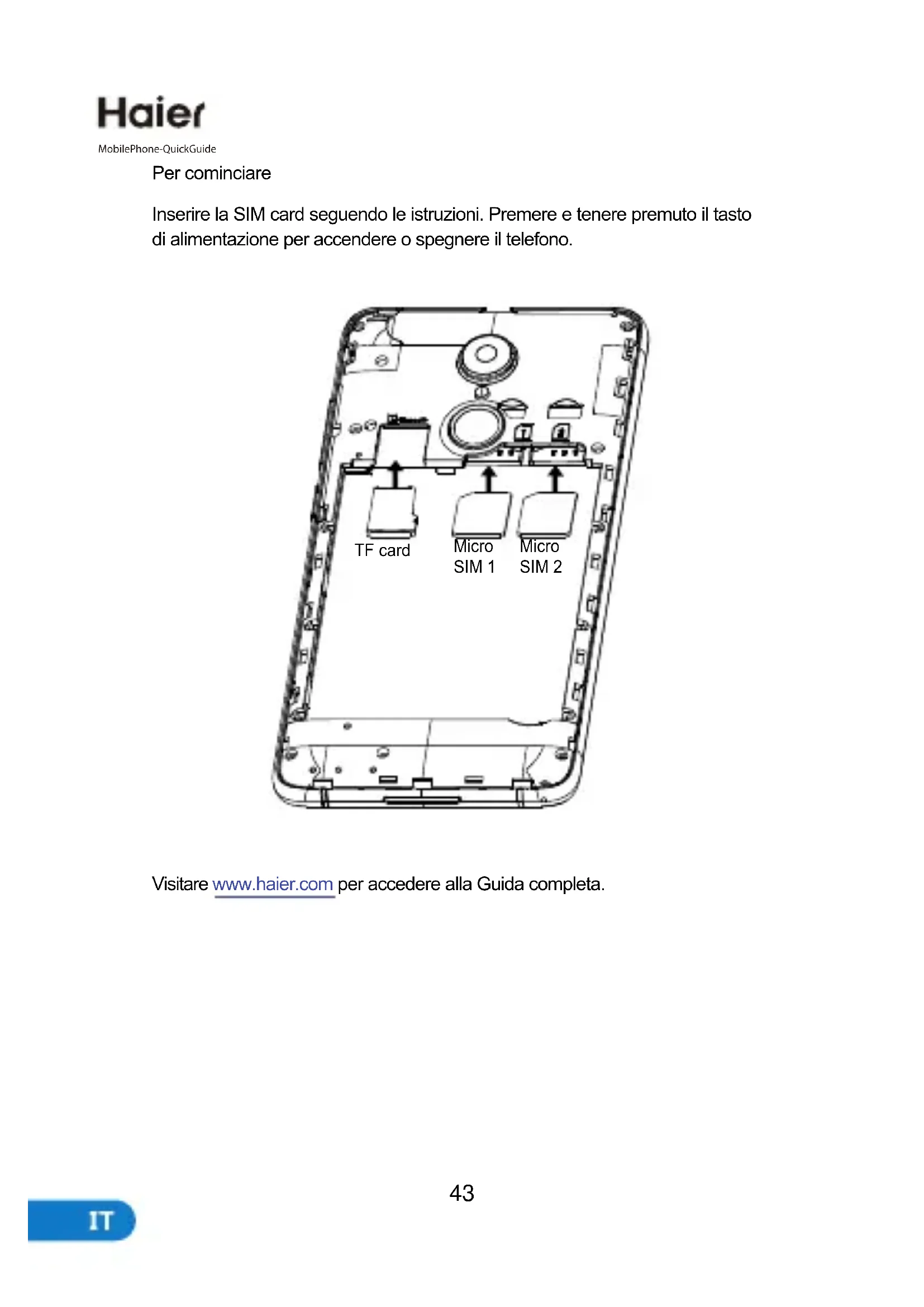 MobilePhone-QuickGuide TF card Micro SIM 1 Micro SIM 2Avvertenza Legale: Questo documento, sia in parte che in tutto, non deve essere riprodotto né trasmesso in alcun modo, forma o dimensione senza previa autorizzazione scritta da parte di Haier. è un marchio registrato della Haier Europe Trading SRL. Haier si riserva il diritto di modificare l’informazione contneuta in questa guida in qualsiasi momento senza preavviso. Declino di Responsabilità I SERVIZI DI TERZA PARTE COSì COME IL LORO CONTENUTO SONO FORNITI IN MANIERA CHIUSA. HAIER NON GARANTISCE I CONTENUTI E I SERVIZI FORNITI, ESPLICITAMENTE O IMPLICITAMENTE, PER ALCUNO SCOPO COSì COME GARANZIE DI COMMERCIALIZZAZIONE E ADEGUATEZZA PER UNO SCOPO PARTICOLARE. HAIER NON GARANTISCE ACCURATEZZA, VALIDITA’, LEGALITA’ O COMPLETEZZA DEL CONTENUTO O DEI SERVIZI FORNITI DA QUESTO DISPOSITIVO. HAIER NON SI RITERRA’ RESPONSABILE PER NEGLIGENZA, SIA PER CONTRATTO CHE PER TORTO CON DANNO DIRETTO, INDIRETTO, OCCASIONALE O SPECIALE, IMPOSTE DI LEGGE, SPESE E OGNI ALTRO DANNO INSORGENTE DALL’USO DEL CONTENUTO O DEI SERVIZI FORNITI DA TERZE PARTI ANCHE QUALORA HAIER SIA STATA AVVISATA DI TALI POSSIBILI INCONVENIENTI. DAL MOMENTO CHE ALCUNI PAESE NON PERMETTONO L’ESCLUSIONE DELL’IMPLICATA GARANZIA NE’ LIMITAZIONI DEI DIRITTI LEGALI DEL CONSUMATORE, E’ POSSIBILE CHE QUESTE ESCLUSIONI E LIMITAZIONI POSSANO NON ESSERE APPLICABILI A VOI.