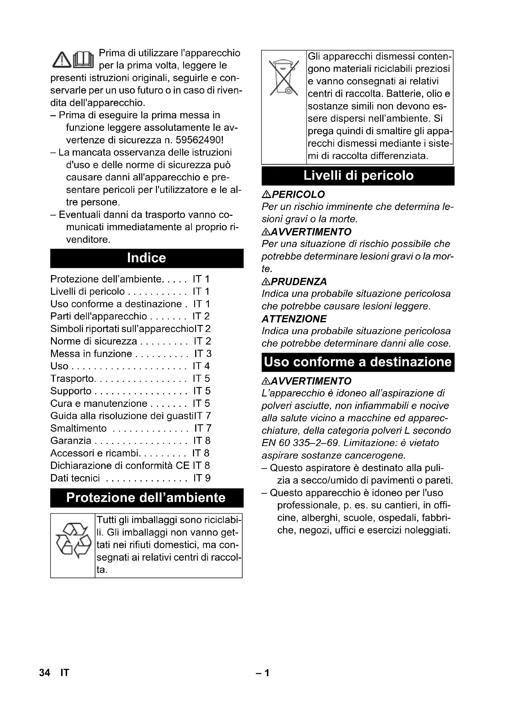 Référence Longueur de câble EU 297.534 7,5 m 33FR– 1 Prima di utilizzare l'apparecchio per la prima volta, leggere le presenti istruzioni originali, seguirle e con- servarle per un uso futuro o in caso di riven- dita dell'apparecchio. – Prima di eseguire la prima messa in funzione leggere assolutamente le av- vertenze di sicurezza n. 59562490! – La mancata osservanza delle istruzioni d'uso e delle norme di sicurezza può causare danni all'apparecchio e pre- sentare pericoli per l'utilizzatore e le al- tre persone. – Eventuali danni da trasporto vanno co- municati immediatamente al proprio ri- venditore. PERICOLO Per un rischio imminente che determina le- sioni gravi o la morte. 몇 AVVERTIMENTO Per una situazione di rischio possibile che potrebbe determinare lesioni gravi o la mor- te. 몇 PRUDENZA Indica una probabile situazione pericolosa che potrebbe causare lesioni leggere. ATTENZIONE Indica una probabile situazione pericolosa che potrebbe determinare danni alle cose. 몇 AVVERTIMENTO L’apparecchio è idoneo all’aspirazione di polveri asciutte, non infiammabili e nocive alla salute vicino a macchine ed apparec- chiature, della categoria polveri L secondo EN 60 335–2–69. Limitazione: è vietato aspirare sostanze cancerogene. – Questo aspiratore è destinato alla puli- zia a secco/umido di pavimenti o pareti. – Questo apparecchio è idoneo per l'uso professionale, p. es. su cantieri, in offi- cine, alberghi, scuole, ospedali, fabbri- che, negozi, uffici e esercizi noleggiati. Indice Protezione dell’ambiente... IT 1 Livelli di pericolo ... IT 1 Uso conforme a destinazione . IT 1 Parti dell'apparecchio ... IT 2 Simboli riportati sull’apparecchioIT 2 Norme di sicurezza ... IT 2 Messa in funzione ... IT 3 Uso ... IT 4 Trasporto... IT 5 Supporto ... IT 5 Cura e manutenzione ... IT 5 Guida alla risoluzione dei guastiIT 7 Smaltimento ... IT 7 Garanzia ... IT 8 Accessori e ricambi... IT 8 Dichiarazione di conformità CE IT 8 Dati tecnici ... IT 9 Protezione dell’ambiente Tutti gli imballaggi sono riciclabi- li. Gli imballaggi non vanno get- tati nei rifiuti domestici, ma con- segnati ai relativi centri di raccol- ta. Gli apparecchi dismessi conten- gono materiali riciclabili preziosi e vanno consegnati ai relativi centri di raccolta. Batterie, olio e sostanze simili non devono es- sere dispersi nell’ambiente. Si prega quindi di smaltire gli appa- recchi dismessi mediante i siste- mi di raccolta differenziata. Livelli di pericolo Uso conforme a destinazione 34 IT– 2 1 Elettrodi 2 Tubo flessibile di aspirazione 3 Gancio per cavo 4 Fuoriuscita d'aria, aria d’esercizio 5 Dispositivo di blocco della testa di aspi- razione 6 Adattatore universale 7 Afflusso aria, aria di raffreddamento motore 8 Contenitore sporcizia 9 Testa aspirante 10 Ruota pivottante 11 Raccordo di aspirazione 12 Bocchetta per pavimenti (non in dota- zione) 13 Tubo di aspirazione (non in dotazione) 14 Maniglia trasporto 15 Coperchio del filtro 16 Gomito (non in dotazione) 17 Regolatore di potenza aspirazione (continuo) 18 Regolazione girevole della potenza di aspirazione (min-max) 19 Spia di controllo 20 Presa elettrica 21 Pulizia automatica del filtro 22 Interruttore principale 23 Filtro plissettato piatto 24 Pulizia del filtro 25 Sostegno per bocchetta per pavimenti 26 Sostegno per bocchetta per fughe 27 Sostegno per tubi di aspirazione 28 Cavo di alimentazione 29 Targhetta 몇 AVVERTIMENTO – Se l’aria di scarico viene rinviata nel ri- spettivo ambiente chiuso, occorre assi- curare un sufficiente tasso di ricambio dell'aria L. Per rispettare i valori limite ri- chiesti, il flusso volumetrico ricondotto deve essere al massimo 50% del flusso volumetrico di aria fresca (volume dell'ambiente V