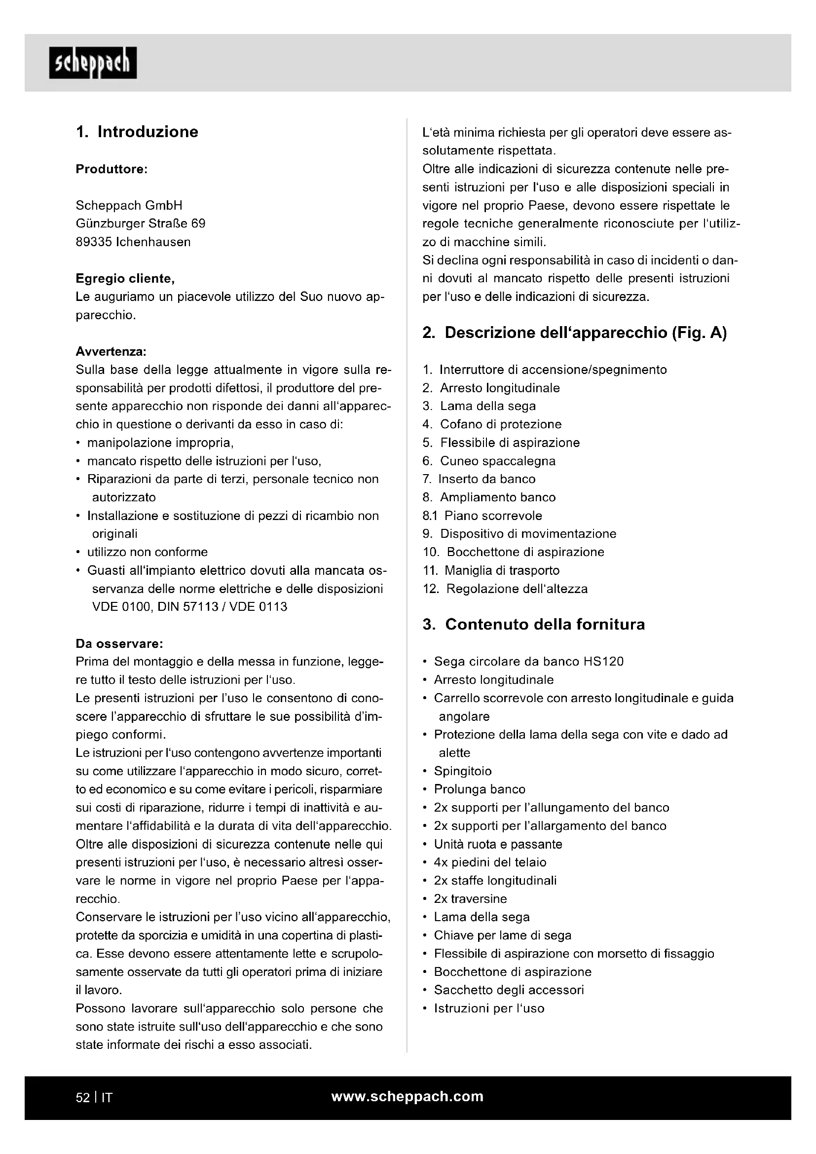 Da osservare: Prima del montaggio e della messa in funzione, legge- re tutto il testo delle istruzioni per l‘uso. Le presenti istruzioni per l’uso le consentono di cono- scere l’apparecchio di sfruttare le sue possibilità d’im- piego conformi. Le istruzioni per l‘uso contengono avvertenze importanti su come utilizzare l‘apparecchio in modo sicuro, corret- to ed economico e su come evitare i pericoli, risparmiare sui costi di riparazione, ridurre i tempi di inattività e au- mentare l‘afdabilità e la durata di vita dell‘apparecchio. Oltre alle disposizioni di sicurezza contenute nelle qui presenti istruzioni per l‘uso, è necessario altresì osser- vare le norme in vigore nel proprio Paese per l‘appa- recchio. Conservare le istruzioni per l’uso vicino all‘apparecchio, protette da sporcizia e umidità in una copertina di plasti- ca. Esse devono essere attentamente lette e scrupolo- samente osservate da tutti gli operatori prima di iniziare il lavoro. Possono lavorare sull‘apparecchio solo persone che sono state istruite sull‘uso dell‘apparecchio e che sono state informate dei rischi a esso associati.www.scheppach.com