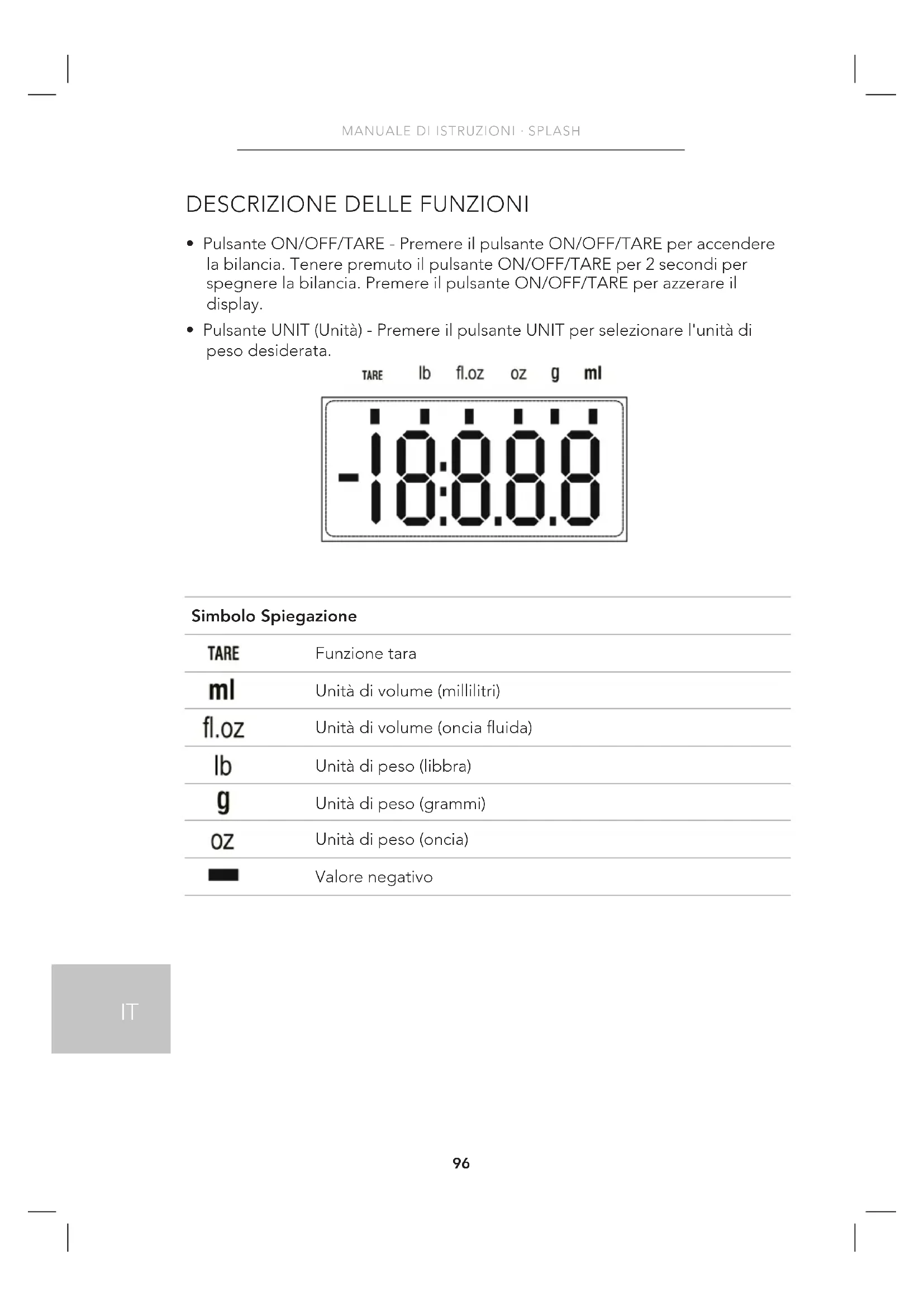 - Pulsante UNIT (Unità) - Premere il pulsante UNIT per selezionare l'unità di peso desiderata. Simbolo Spiegazione Funzione tara Unità di volume (millilitri) Unità di volume (oncia uida) Unità di peso (libbra) Unità di peso (grammi) Unità di peso (oncia) Valore negativo97