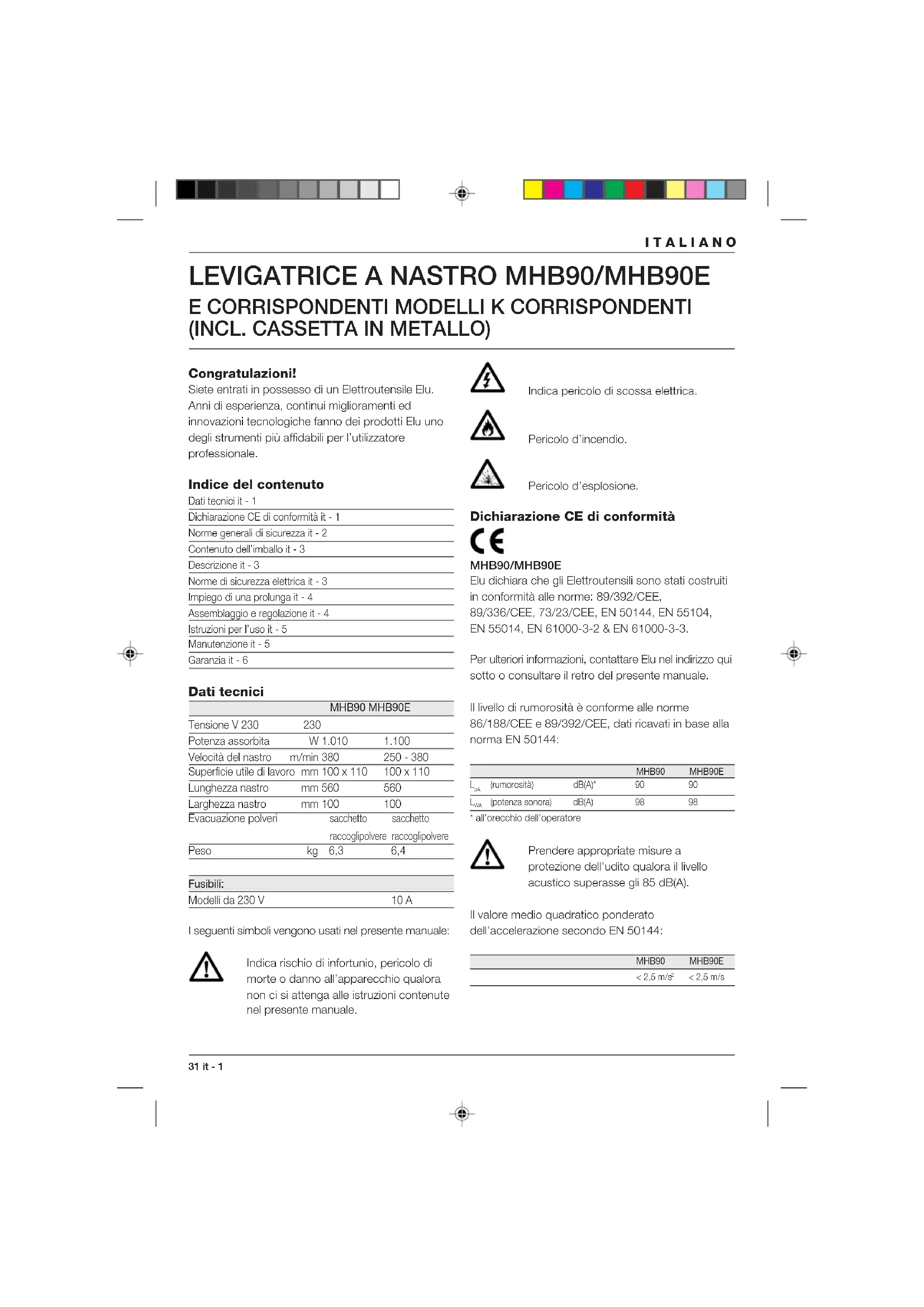(potenza sonora) dB(A) 98 98* all’orecchio dell’operatore Prendere appropriate misure a protezione dell’udito qualora il livello acustico superasse gli 85 dB(A). Il valore medio quadratico ponderato dell’accelerazione secondo EN 50144: MHB90 MHB90E< 2,5 m/s < 2,5 m/sit - 2 32 ITALIANO Direttore ricerca e sviluppo Horst Großmann Elu International, Richard-Klinger-Straße 40, D-65510, Idstein, Germania Norme generali di sicurezza Durante l’utilizzo di utensili elettrici adottate sempre le elementari norme di sicurezza atte a ridurre i rischi d’incendio, scariche elettriche e ferimenti. Leggere attentamente le seguenti istruzioni prima di utilizzare il prodotto. Custodire con cura le istruzioni! Norme generali 1 Tenere pulita l’area di lavoro Ambienti e banchi di lavoro in disordine possono essere causa d’incidenti. 2 Tener presenti le caratteristiche dell’ambiente di lavoro Non esporre gli utensili elettrici all’umidità. Tenere ben illuminata l’area di lavoro. Non usare gli utensili elettrici in luoghi con atmosfera gassosa o infiammabile. 3 Proteggersi da scariche elettriche Evitare il contatto con oggetti dotati di scarico a terra (per es. tubi, termosifoni, cucine e frigoriferi). Durante impieghi estremi (per es. alto livello di umidità, polvere metallica, ecc.) si può aumentare la sicurezza elettrica collegando in serie un trasformatore d’isolamento o un interruttore di sicurezza per correnti di guasto (FI). 4 Tenere i bambini lontani dall’area di lavoro Non permettere che persone estranee tocchino l’utensile o il cavo di prolunga. Per i ragazzi di età inferiore ai 16 anni è richiesta la supervisione di un adulto. 5 Cavo di prolunga per l’uso esterno Se l’utensile viene utilizzato all’aperto, si faccia uso soltanto di un cavo di prolunga di tipo idoneo, appositamente previsto e contrassegnato per l’uso esterno. 6 Custodia dell’elettroutensile dopo l’uso Riporre gli Elettroutensili in luogo sicuro e ben asciutto, fuori dalla portata dei bambini. 7 Usare il vestiario appropriato Evitare l’uso di abiti svolazzanti, catenine, ecc. in quanto potrebbero rimanere impigliati nelle parti mobili dell’utensile. Lavorando all’aperto indossare guanti di gomma e scarpe con suole antisdrucciolo. Raccogliere i capelli se si portano lunghi. 8 Usare occhiali protettivi Usare inoltre una maschera antipolvere qualora si producano polvere o particelle volatili. 9 Rumorosità eccessiva Prendere appropriate misure a protezione dell’udito se il livello acustico supera gli 85 dB(A). 10 Bloccare il pezzo da lavorare Usare pinze o morse per bloccare il pezzo da lavorare, ciò aumenta la sicurezza e consente di mantenere entrambe le mani libere per operare meglio. 11 Non sbilanciarsi Mantenere sempre un buon equilibrio evitando posizioni malsicure. 12 Evitare accensioni accidentali Non eseguire il trasporto dell’Elettroutensile collegato alla rete di alimentazione tenendo il dito sull’interruttore. Assicurarsi che l’interruttore sia in posizione OFF prima di inserire la spina. 13 Stare sempre attenti Prestare attenzione a quanto si sta facendo. Usare il proprio buon senso e non utilizzare l’utensile quando si è stanchi. 14 Staccare l’alimentazione dell’utensile Spegnere l’utensile ed attendere il suo arresto completo prima di lasciarlo incustodito. Staccare la spina dalla presa se l’utensile rimane inutilizzato e prima di eseguire qualsiasi operazione di manutenzione dell’utensile o di sostituzione degli accessori. 15 Non lasciare sull’utensile chiavi o strumenti di misura Prima di mettere in funzione l’Elettroutensile si abbia cura di togliere chiavi e altri strumenti. 16 Usare l’utensile adatto L’utilizzo previsto è indicato nel presente manuale. Non forzare utensili e accessori di potenza limitata impiegandoli per lavori destinati ad utensili di maggiore potenza. Attenzione! L’uso di accessori o attrezzature diversi, o l’impiego del presente utensile per scopi diversi, da quelli raccomandati nel manuale d’uso possono comportare il rischio di infortuni.• Tutte le persone che entrano nell’area di lavoro devono indossare una maschera di protezione specifica per polveri ed esalazioni di pitture a base di piombo.