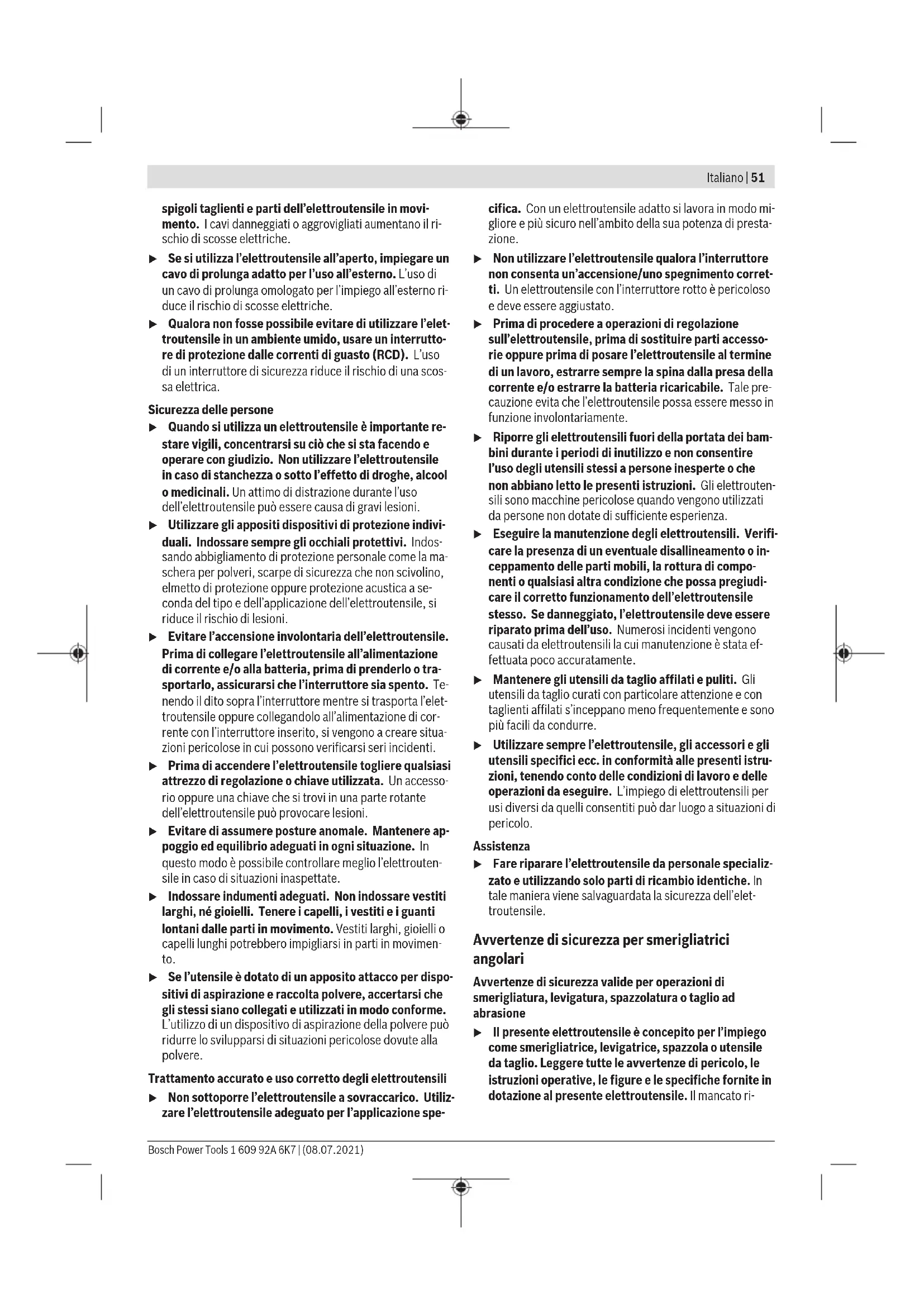 Il livello di vibrazioni indicato nelle presenti istruzioni è stato rilevato in conformità ad una procedura di misurazione stan- dardizzata e può essere utilizzato per eseguire un confronto tra gli elettroutensili. Lo stesso è idoneo anche per una valu- tazione temporanea della sollecitazione da vibrazioni. Il livello di vibrazioni indicato rappresenta gli impieghi princi- pali dell’elettroutensile. Qualora l’elettroutensile venisse uti- lizzato tuttavia per altri impieghi, con accessori differenti op- pure con manutenzione insufficiente, il livello di vibrazioni può differire. Ciò potrebbe aumentare sensibilmente la solle- citazione da vibrazioni per l’intero periodo operativo. Per una valutazione precisa della sollecitazione da vibrazioni bisognerebbe considerare anche i tempi in cui l’apparecchio è spento oppure è acceso ma non è utilizzato effettivamente. Ciò potrebbe aumentare sensibilmente la sollecitazione da vibrazioni per l’intero periodo operativo. Adottare misure di sicurezza supplementari per proteggere l’operatore dall’effetto delle vibrazioni: ad esempio, sottopo- nendo a manutenzione l’elettroutensile e gli accessori, man- tenendo calde le mani e organizzando i vari processi di lavo- ro. Montaggio Montaggio del dispositivo di sicurezza u Prima di qualunque intervento sull’elettroutensile estrarre la spina di rete dalla presa. Avvertenza: dopo una rottura della mola abrasiva durante il funzionamento, oppure in caso di danni ai dispositivi di al- loggiamento sulla cuffia di protezione/sull’elettroutensile, l’elettroutensile andrà immediatamente inviato al Servizio Clienti post-vendita. Per gli indirizzi, vedere il paragrafo «Servizio di assistenza e consulenza tecnica». Cuffia di protezione per levigatura Applicare la cuffia di protezione (5) sul collare dell’alberino. Adattare la posizione della cuffia di protezione (5) in base al- la lavorazione da eseguire e bloccare la cuffia di protezione (5) con la vite di fissaggio (6). u Regolare la cuffia di protezione (5) in modo da impedi- re proiezioni di scintille in direzione dell’operatore. Cuffia di protezione per taglio u Per il taglio con abrasivi legati, utilizzare sempre la cuffia di protezione per taglio (13). u Per il taglio nella pietra, provvedere ad un’adeguata aspirazione della polvere. La cuffia di protezione per taglio (13) andrà montata analo- gamente alla cuffia di protezione per levigatura (5). Cuffia di aspirazione per taglio con slitta di guida La cuffia di aspirazione per taglio con slitta di guida (21) an- drà montata analogamente alla cuffia di protezione per levi- gatura (5). Impugnatura supplementare u Impiegare l’elettroutensile esclusivamente con l’impu- gnatura supplementare (3). Avvitare l’impugnatura supplementare (3) a destra o a sini- stra della testata ingranaggi, in base alla modalità di lavoro. Bosch Power Tools 1 609 92A 6K7 | (08.07.2021)56 | Italiano Protezione per le mani u Per operazioni con il platorello in gomma (17) o con la spazzola a tazza/la spazzola a disco/il disco lamellare, montare sempre la protezione per le mani (15). Fissare la protezione per le mani (15) con l’impugnatura supplementare (3). Montaggio degli accessori di levigatura u Prima di qualunque intervento sull’elettroutensile estrarre la spina di rete dalla presa. u Non afferrare i dischi di levigatura e di taglio con le mani prima che si siano raffreddati. Durante il lavoro, i dischi raggiungono temperature molto elevate. Pulire il mandrino portamola (4) e tutte le parti da montare. Per fissare e sbloccare gli accessori di levigatura, premere il pulsante di bloccaggio dell’alberino (1), in modo da bloccare il mandrino portamola. u Premere il pulsante di bloccaggio dell’alberino esclusi- vamente a mandrino portamola fermo. In caso contra- rio, l’elettroutensile potrebbe subire dei danni. Mola abrasiva/mola da taglio Prestare attenzione alle dimensioni degli accessori di leviga- tura. Il diametro del foro dovrà coincidere con la flangia di at- tacco. Non utilizzare adattatori, né elementi di riduzione. Qualora si utilizzino mole diamantate, accertarsi che la frec- cia del senso di rotazione sulla mola stessa ed il senso di ro- tazione dell’elettroutensile (vedere la freccia del senso di ro- tazione sulla testa ingranaggi) coincidano. La sequenza di montaggio è riportata alla pagina con rappre- sentazione grafica. Per fissare la mola abrasiva/da taglio, avvitare il dado di serraggio(9) e serrarlo con la chiave a due perni (vedi « Da- do autoserrante », Pagina56). u Dopo il montaggio dell’utensile abrasivo, verificare prima dell’accessione se l’utensile abrasivo è montato in modo corretto e può essere girato senza impedi- menti. Assicurarsi che l’utensile abrasivo non venga a contatto con la cuffia di protezione o altre parti. Nella flangia di attacco (7), attorno al collare di centraggio, è inserito un elemento in plastica (O-ring). Qualora l’O-ring sia assente o dan- neggiato, prima del riutilizzo sarà fondamen- tale sostituire la flangia di attacco (7). Disco lamellare u Per operazioni con il disco lamellare, montare sempre la protezione per le mani (15). Platorello in gomma u Per operazioni con il platorello in gomma (17), monta- re sempre la protezione per le mani (15). La sequenza di montaggio è riportata alla pagina con rappre- sentazione grafica. Prima di montare il platorello in gomma (17), applicare le 2 rondelle distanziatrici (16) sul mandrino portamola (4). Avvitare il dado cilindrico (19) e serrarlo con la chiave a due perni. Spazzola a tazza/spazzola a disco u Per operazioni con la spazzola a tazza o la spazzola a disco, montare sempre la protezione per le mani (15). La sequenza di montaggio è riportata alla pagina con rappre- sentazione grafica. La spazzola a tazza/la spazzola a disco dovrà potersi avvitare sul mandrino portamola fino a farla poggiare saldamente sul- la flangia del mandrino stesso, all’estremità della fil