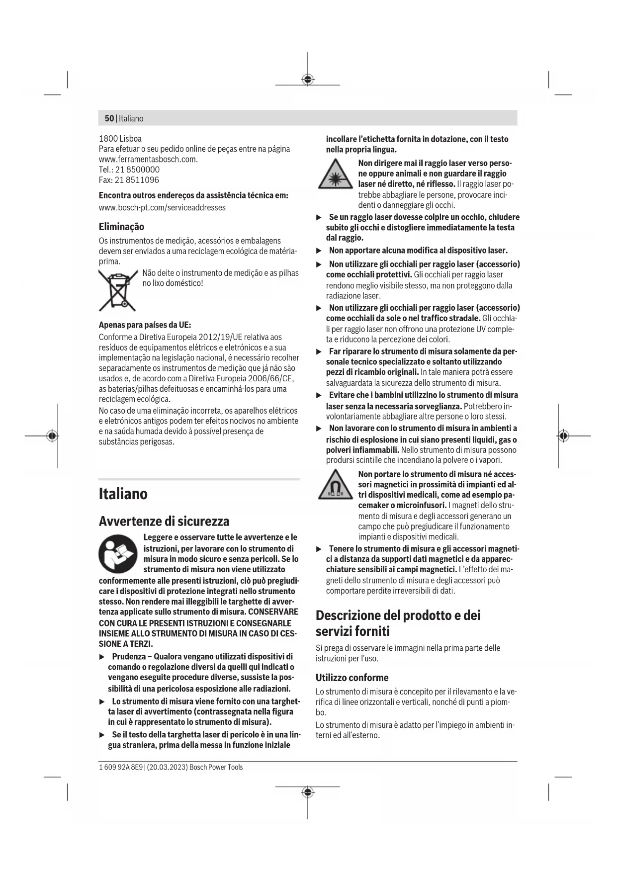 con 20–25°C C) I valori indicati presuppongono condizioni ambientali normali e/o favorevoli (ad esempio assenza di vibrazioni, nebbia, fumo, nessuna irra- diazione solare diretta). In seguito a violente oscillazioni di temperatura è possibile che si riscontrino perdite di precisione. D) Presenza esclusivamente di contaminazioni non conduttive, ma che, in alcune occasioni, possono essere rese temporaneamente condutti- ve dalla condensa. Per un’identificazione univoca dello strumento di misura, consultare il numero di serie (12) riportato sulla targhetta identificativa. Montaggio Introduzione/sostituzione delle pile Per l’impiego dello strumento di misura si raccomanda di uti- lizzare pile alcaline al manganese. Per aprire il coperchio del vano batterie(6) esercitare pres- sione sul bloccaggio(7) e quindi sollevare il coperchio. In- trodurre le batterie. Durante tale fase, prestare attenzione alla corretta polarità, riportata sul lato interno del vano batterie. Quando le batterie iniziano ad essere scariche, l’avviso pile(2) lampeggia con luce verde. Le linee laser inoltre lam- peggeranno per circa 5s ogni 10min. Dopo il primo lampeg- gio, lo strumento di misura avrà un’autonomia residua di cir- ca 1h. Quando le pile saranno completamente scariche, le li- nee laser lampeggeranno un’altra volta e subito dopo lo stru- mento si spegnerà automaticamente. Sostituire sempre tutte le pile contemporaneamente. Utiliz- zare esclusivamente pile dello stesso produttore e con la stessa capacità. u Se lo strumento di misura non viene impiegato per lun- ghi periodi, rimuovere le pile dallo strumento stesso. Qualora le batterie rimangano per lungo tempo all’interno dello strumento di misura si possono verificare fenomeni di corrosione e di autoscaricamento. Utilizzo con il supporto ruotabileRM1 (vederefigg.A1–A3) Mediante il supporto ruotabile(14) è possibile ruotare lo strumento di misura di 360° attorno ad un punto a piombo centrale, sempre visibile. Ciò consente di orientare le linee laser senza modificare la posizione dello strumento di misu- ra. Sistemare lo strumento di misura, con la scanalatura di guida (8) sul binario di guida(15) del supporto ruotabile(14) e spingere fino a battuta lo strumento di misura sulla piattafor- ma. Per separare le parti, estrarre lo strumento di misura dal supporto ruotabile nella direzione opposta. Possibilità di posizionamento del supporto ruotabile: – verticale su superficie piana, – avvitato su superficie verticale, – in combinazione con il fermaglio di copertura su listelli di copertura (18) metallici, – mediante i magneti (17) su superfici metalliche. u Mantenere le dita a distanza dal lato posteriore dell’accessorio magnetico, quando lo si fissa su super- fici. A causa dell’elevata forza di attrazione dei magneti, le dita potrebbero restare intrappolate. 1 609 92A 8E9 | (20.03.2023) Bosch Power ToolsItaliano | 53 Utilizzo Messa in funzione u Proteggere lo strumento di misura da liquidi e dall’esposizione diretta ai raggi solari. u Non esporre lo strumento di misura a temperature o ad oscillazioni termiche estreme. Ad esempio, evitare di lasciarlo per lungo tempo all’interno dell’auto. In caso di considerevoli oscillazioni di temperatura, lasciare che lo strumento di misura raggiunga la normale temperatura e, prima di procedere con ulteriori lavorazioni, eseguire sempre una verifica della precisione (vedi «Verifica della precisione dello strumento di misura», Pagina55). Temperature oppure sbalzi di temperatura estremi posso- no pregiudicare la precisione dello strumento di misura. u Evitare di urtare violentemente o di far cadere lo stru- mento di misura. Qualora lo strumento di misura abbia subito forti influssi esterni, prima di riprendere il lavoro andrà sempre effettuata una verifica della precisione (ve- di «Verifica della precisione dello strumento di misura», Pagina55). u Spegnere lo strumento di misura, quando occorra tra- sportalo. Spegnendo lo strumento, viene bloccata l’unità oscillante che altrimenti potrebbe venire danneggiata in caso di movimenti violenti. Accensione/spegnimento Per accendere lo strumento di misura, spostare l’interrutto- re di avvio/arresto(9) in posizione On (per impiego senza bloccaggio oscillazione), oppure in posizione On (per im- piego con livellamento automatico). Subito dopo l’accensio- ne, lo strumento di misura proietterà raggi laser dalle apertu- re di uscita(1). u Non dirigere mai il raggio laser su persone oppure su animali e non rivolgere lo sguardo in direzione del rag- gio laser stesso, neanche da grande distanza. Per spegnere lo strumento di misura, spingere l’interruttore di accensione/spegnimento (9) in posizione Off. In fase di spegnimento, l’unità oscillante verrà bloccata. u Non lasciare incustodito lo strumento di misura quan- do è acceso e spegnerlo sempre dopo l’uso. Altre per- sone potrebbero essere abbagliate dal raggio laser. Qualora venga superata la temperatura massima di funziona- mento ammessa, pari a 50°C, lo strumento verrà spento, per proteggere il diodo laser. Una volta raffreddato, lo stru- mento di misura sarà nuovamente pronto al funzionamento e potrà essere nuovamente acceso. Spegnimento automatico Se per circa 120min non verrà premuto alcun tasto sullo strumento di misura, lo strumento stesso si spegnerà auto- maticamente, per salvaguardare le pile. Per riaccendere lo strumento di misura dopo lo spegnimento automatico, si potrà portare l’interruttore di accensione/spe- gnimento (9) in posizione «Off» e riaccendere lo strumento di misura, oppure premere il tasto di modalità Punto laser(4) o il tasto di modalità Linea laser(5). Disattivazione temporanea dello spegnimento automatico Per disattivare lo spegnimento automatico, a strumento di misura acceso, mantenere premuto il tasto di modalità Linea laser(5) per almeno 3 sec. Quando lo spegnimento automa- tico sarà stato disattivato, i raggi laser lampeggeranno bre- 
