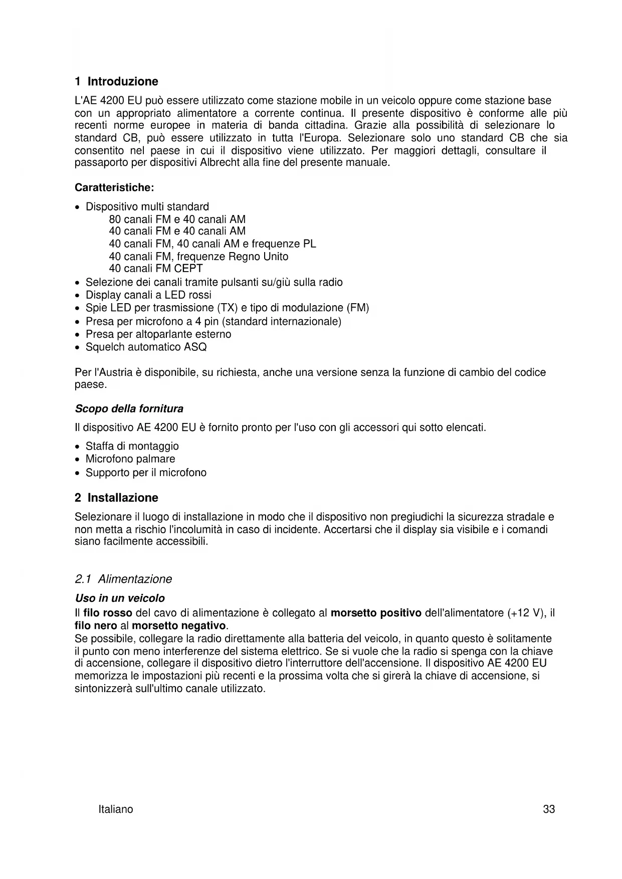 1 Introduzione L'AE 4200 EU può essere utilizzato come stazione mobile in un veicolo oppure come stazione base con un appropriato alimentatore a corrente continua. Il presente dispositivo è conforme alle più recenti norme europee in materia di banda cittadina. Grazie alla possibilità di selezionare lo standard CB, può essere utilizzato in tutta l'Europa. Selezionare solo uno standard CB che sia consentito nel paese in cui il dispositivo viene utilizzato. Per maggiori dettagli, consultare il passaporto per dispositivi Albrecht alla fine del presente manuale. Caratteristiche:
