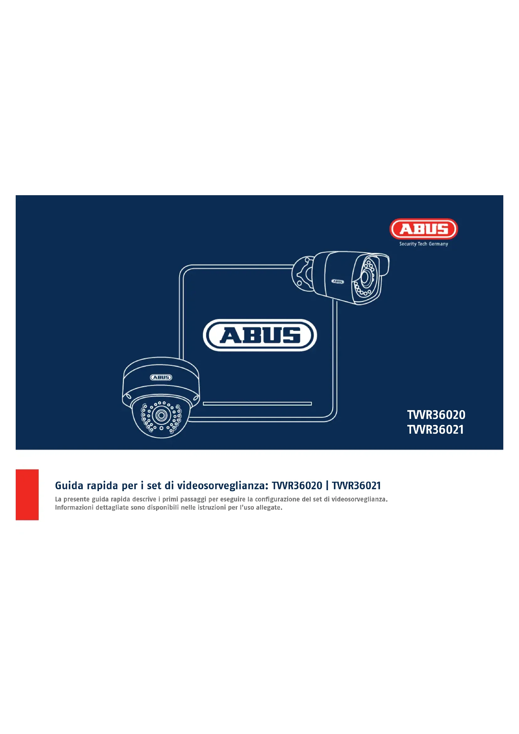 160218-Quick-Guide-TVVR36020-RRo-BUCH.indb 129 03.03.16 13:36160218-Quick-Guide-TVVR36020-RRo-BUCH.indb 130 03.03.16 13:36TVVR36020 TVVR36021 Guida rapida per i set di videosorveglianza: TVVR36020 | TVVR36021 La presente guida rapida descrive i primi passaggi per eseguire la configurazione del set di videosorveglianza. Informazioni dettagliate sono disponibili nelle istruzioni per l’uso allegate. 160218-Quick-Guide-TVVR36020-RRo-BUCH.indb 131 03.03.16 13:36132 Italiano Gentile cliente, La ringraziamo per aver acquistato questo prodotto. Questo prodotto risponde ai requisiti richiesti dalle direttive europee e nazionali in vigore. La sua conformità è stata comprovata, le dichiarazioni e la relativa documentazione sono depositate presso il produttore (ABUS Security-Center GmbH & Co. KG, Linker Kreuthweg 5, 86444 Ang, Germany). Al ne di preservare tale stato e garantire un funzionamento sicuro, Lei, in qualità di utente, è tenuto a osservare le presenti istruzioni per l‘uso. Prima di mettere in funzione il prodotto legga tutte le istruzioni per l‘uso facendo attenzione alle indicazioni sull‘uso e sulla sicurezza. Tutti i nomi di aziende e prodotti riportati sono marchi depositati dei rispettivi proprietari. Tutti i diritti riservati. In caso di domande rivolgersi al proprio rivenditore specializzato. 160218-Quick-Guide-TVVR36020-RRo-BUCH.indb 132 03.03.16 13:36133 Italiano Avvertenze importanti Conservare il registratore e la videoca- mera esclusivamente alle condizioni ambiente consigliate dal produttore. Assicurarsi che venga sempre garantita un’adeguata ventilazione. Assicurarsi che l’alimentazione elettrica non venga interrotta. Tenere la videocamera di rete lontano da forti campi magnetici. Tenere il registratore lontano da liquidi. Assicurarsi che la videocamera di rete sia montata correttamente. Utilizzare la videocamera di rete solo con un’adeguata fonte di tensione. Non introdurre alcun oggetto nella videocamera (ad es. aghi). 160218-Quick-Guide-TVVR36020-RRo-BUCH.indb 133 03.03.16 13:36134 Italiano