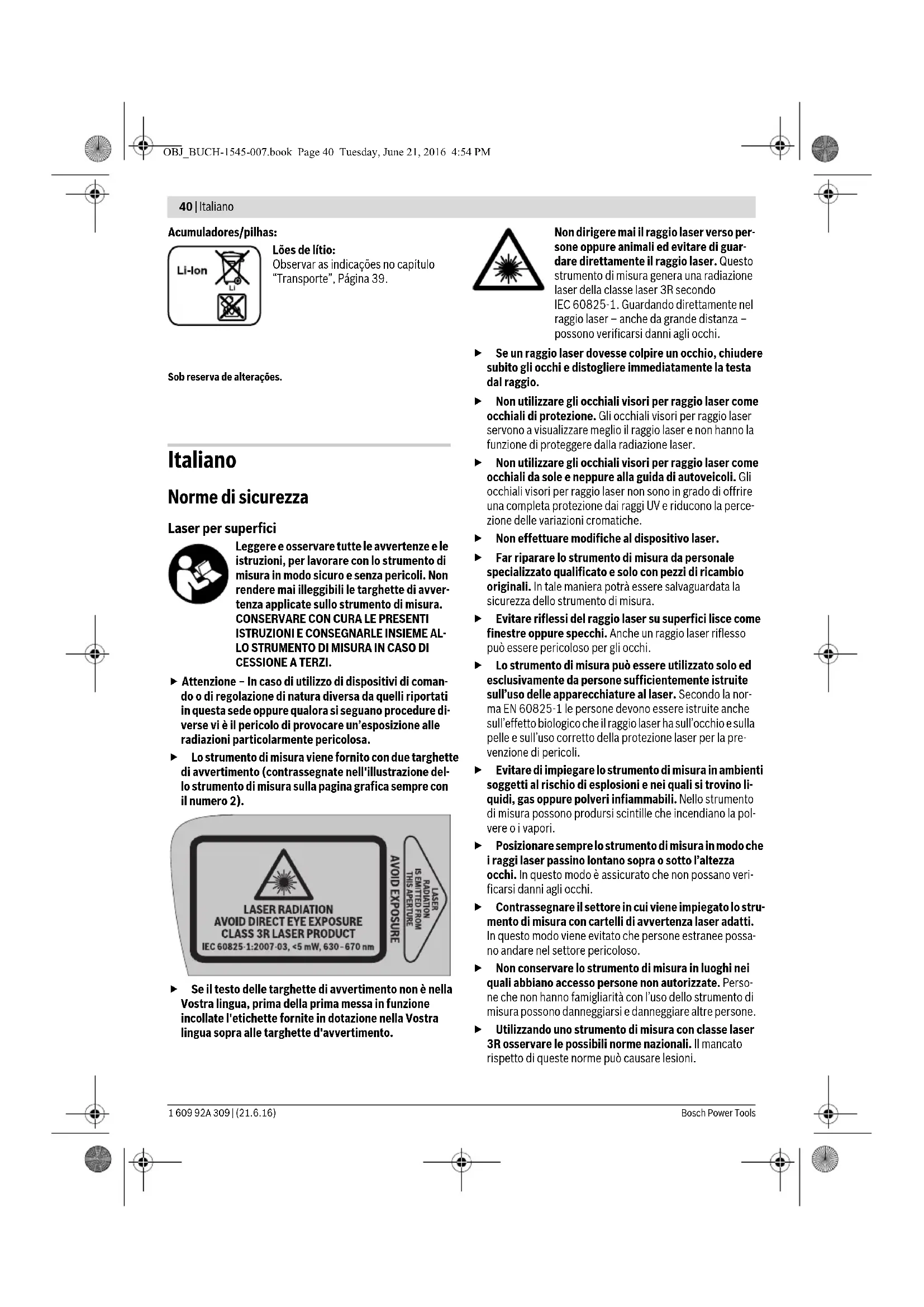 LO STRUMENTO DI MISURA IN CASO DI CESSIONE A TERZI. Attenzione – In caso di utilizzo di dispositivi di coman- do o di regolazione di natura diversa da quelli riportati in questa sede oppure qualora si seguano procedure di- verse vi è il pericolo di provocare un’esposizione alle radiazioni particolarmente pericolosa. Lo strumento di misura viene fornito con due targhette di avvertimento (contrassegnate nell'illustrazione del- lo strumento di misura sulla pagina grafica sempre con il numero 2). Se il testo delle targhette di avvertimento non è nella Vostra lingua, prima della prima messa in funzione incollate l'etichette fornite in dotazione nella Vostra lingua sopra alle targhette d'avvertimento. Non dirigere mai il raggio laser verso per- sone oppure animali ed evitare di guar- dare direttamente il raggio laser. Questo strumento di misura genera una radiazione laser della classe laser 3R secondo IEC60825-1. Guardando direttamente nel raggio laser – anche da grande distanza – possono verificarsi danni agli occhi. Se un raggio laser dovesse colpire un occhio, chiudere subito gli occhi e distogliere immediatamente la testa dal raggio. Non utilizzare gli occhiali visori per raggio laser come occhiali di protezione. Gli occhiali visori per raggio laser servono a visualizzare meglio il raggio laser e non hanno la funzione di proteggere dalla radiazione laser. Non utilizzare gli occhiali visori per raggio laser come occhiali da sole e neppure alla guida di autoveicoli. Gli occhiali visori per raggio laser non sono in grado di offrire una completa protezione dai raggi UV e riducono la perce- zione delle variazioni cromatiche. Non effettuare modifiche al dispositivo laser. Far riparare lo strumento di misura da personale specializzato qualificato e solo con pezzi di ricambio originali. In tale maniera potrà essere salvaguardata la sicurezza dello strumento di misura. Evitare riflessi del raggio laser su superfici lisce come finestre oppure specchi. Anche un raggio laser riflesso può essere pericoloso per gli occhi. Lo strumento di misura può essere utilizzato solo ed esclusivamente da persone sufficientemente istruite sull’uso delle apparecchiature al laser. Secondo la nor- ma EN 60825-1 le persone devono essere istruite anche sull’effetto biologico che il raggio laser ha sull’occhio e sulla pelle e sull’uso corretto della protezione laser per la pre- venzione di pericoli. Evitare di impiegare lo strumento di misura in ambienti soggetti al rischio di esplosioni e nei quali si trovino li- quidi, gas oppure polveri infiammabili. Nello strumento di misura possono prodursi scintille che incendiano la pol- vere o i vapori. Posizionare sempre lo strumento di misura in modo che i raggi laser passino lontano sopra o sotto l’altezza occhi. In questo modo è assicurato che non possano veri- ficarsi danni agli occhi. Contrassegnare il settore in cui viene impiegato lo stru- mento di misura con cartelli di avvertenza laser adatti. In questo modo viene evitato che persone estranee possa- no andare nel settore pericoloso. Non conservare lo strumento di misura in luoghi nei quali abbiano accesso persone non autorizzate. Perso- ne che non hanno famigliarità con l’uso dello strumento di misura possono danneggiarsi e danneggiare altre persone. Utilizzando uno strumento di misura con classe laser 3R osservare le possibili norme nazionali. Il mancato rispetto di queste norme può causare lesioni. OBJ_BUCH-1545-007.book Page 40 Tuesday, June 21, 2016 4:54 PMItaliano | 41 Bosch Power Tools 1 609 92A 309 | (21.6.16) Provvedere affinché il settore della radiazione laser sia custodito oppure schermato. La limitazione della radia- zione laser in settori controllati evita danni agli occhi di persone estranee. Rimuovere la batteria ricaricabile oppure le batterie dallo strumento di misura prima di qualsiasi intervento sullo strumento stesso (p. es. montaggio, manutenzio- ne ecc.) nonché durante il suo trasporto e la conserva- zione. In caso di azionamento accidentale dell’interruttore di avvio/arresto esiste pericolo di lesioni. Non aprire la batteria ricaricabile. Esiste il pericolo di un cortocircuito. Proteggere la batteria ricaricabile dal calore, p. es. anche dall’irradiamento solare continuo, dal fuoco, dall’acqua e dall’umidità. Esiste peri- colo di esplosione. Tenere lontano la batteria ricaricabile non utilizzata da graffette, monete, chiavi, chiodi, viti oppure altri piccoli oggetti metallici che potrebbero causare un’esclusione dei contatti. Un corto circuito tra i contatti della batteria ricaricabile può causare incendi oppure fuoco. In caso di impiego errato può fuoriuscire liquido dalla batteria ricaricabile. Evitare il contatto con il liquido stesso. In caso di contatto accidentale sciacquare con acqua. Se il liquido dovesse venire a contatto con gli oc- chi richiedere anche l’intervento di un medico. Il liquido della batteria ricaricabile che fuoriesce può causare irrita- zioni della pelle o ustioni. In caso di danneggiamento ed un uso non corretto della batteria ricaricabile possono fuoriuscire vapori. Aera- re con aria fresca ed in caso di disturbi rivolgersi ad un medico. I vapori possono irritare le vie respiratorie. Caricare le batterie ricaricabili esclusivamente in sta- zioni di ricarica che sono state consigliate dal produtto- re. Per una stazione di ricarica adatta per un determinato tipo di batterie ricaricabili esiste pericolo di incendio se la stessa viene impiegata con batterie ricaricabili differenti. Utilizzare la batteria ricaricabile esclusivamente insie- me allo strumento di misura Bosch. Solo in questo modo la batteria ricaricabile viene protetta da sovraccarico peri- coloso. Utilizzare esclusivamente batterie ricaricabili originali Bosch dotate della tensione indicata sulla targhetta di identificazione dello strumento di misura. In caso di im- piego di altre batterie ricaricabili, p. es. imitazioni, batterie ricaricabili rigenerate oppure prodot