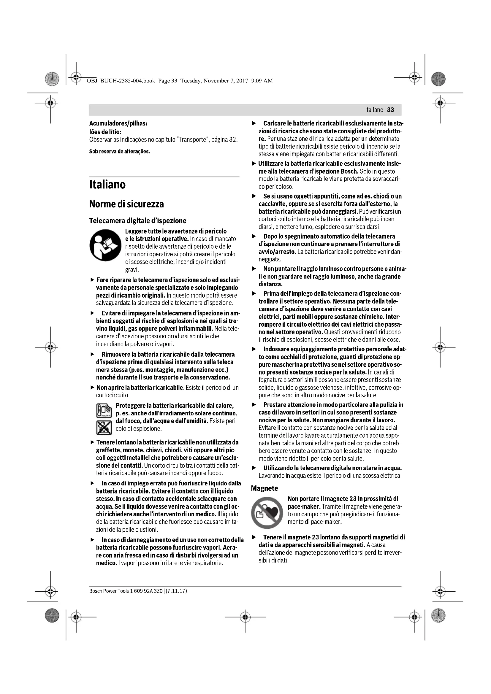 OBJ_BUCH-2385-004.book Page 34 Tuesday, November 7, 2017 9:09 AMItaliano | 35 Bosch Power Tools 1 609 92A 3Z0 | (7.11.17) Montaggio Alimentazione d’energia La telecamera da ispezione è utilizzabile con batterie normal- mente reperibili in commercio, oppure con una batteria rica- ricabile al litio Bosch. Impiego con adattatore batterie (estraibile) (3 601 B41 2..) (vedi figura A) Le batterie vengono inserite nell’apposito adattatore. L’adattatore batterie è destinato al solo impiego nelle telecamere da ispezione Bosch previste e non andrà utilizzato con elettroutensili. Per inserire le batterie, spingere il rivestimento 26 dell’adat- tatore batterie nel vano 28. Inserire le batterie in conformità all’immagine riprodotta sulla calotta di chiusura 27 nel rivesti- mento. Spingere quindi la calotta di chiusura sul rivestimento fino a farla scattare udibilmente in sede e portarla a filo dell’impugnatura della telecamera da ispezione. Per estrarre le batterie, premere i tasti di sbloccaggio 18 del- la calotta di chiusura 27 e rimuovere la calotta stessa. Estrar- re il rivestimento interno 26 dal vano 28. Sostituire sempre contemporaneamente tutte le batterie. Uti- lizzare esclusivamente batterie che siano di uno stesso pro- duttore e che abbiano la stessa capacità. Se la telecamera da ispezione non viene impiegata per lunghi periodi, prelevare le batterie dalla stessa. Un im- magazzinaggio prolungato può comportare la corrosione o l’autoscarica delle batterie. Funzionamento con batteria ricaricabile (3 601 B41 2..) (vedi figura B) Utilizzare esclusivamente i caricabatteria indicati nei dati tecnici. Soltanto questi caricabatteria sono adatti alle batterie al litio utilizzabili nella vostra telecamera da ispe- zione. Nota bene: L’uso di batterie ricaricabili non adatte alla teleca- mera d’ispezione può causare funzionamenti difettosi oppure il danneggiamento della telecamera d’ispezione stessa. Nota bene: La batteria ricaricabile viene fornita parzialmente carica. Per garantire l’intera potenza della batteria ricaricabi- le, prima del primo impiego ricaricare completamente la bat- teria ricaricabile nella stazione di ricarica. La batteria ricaricabile agli ioni di litio può essere ricaricata in qualsiasi momento senza ridurne la durata. Un’interruzione dell’operazione di ricarica non danneggia la batteria ricaricabile. Per inserire la batteria ricaricabile carica 17, spingere la bat- teria stessa nel relativo vano 28 fino a farla scattare udibil- mente in sede e portarla a filo dell’impugnatura della teleca- mera da ispezione. Per estrarre la batteria ricaricabile 17 , premere i tasti di sbloccaggio 18 ed estrarre la batteria ricaricabile dal relativo vano 28. Durante questa operazione non esercitare forza. Umidità relativa dell’aria %5–95