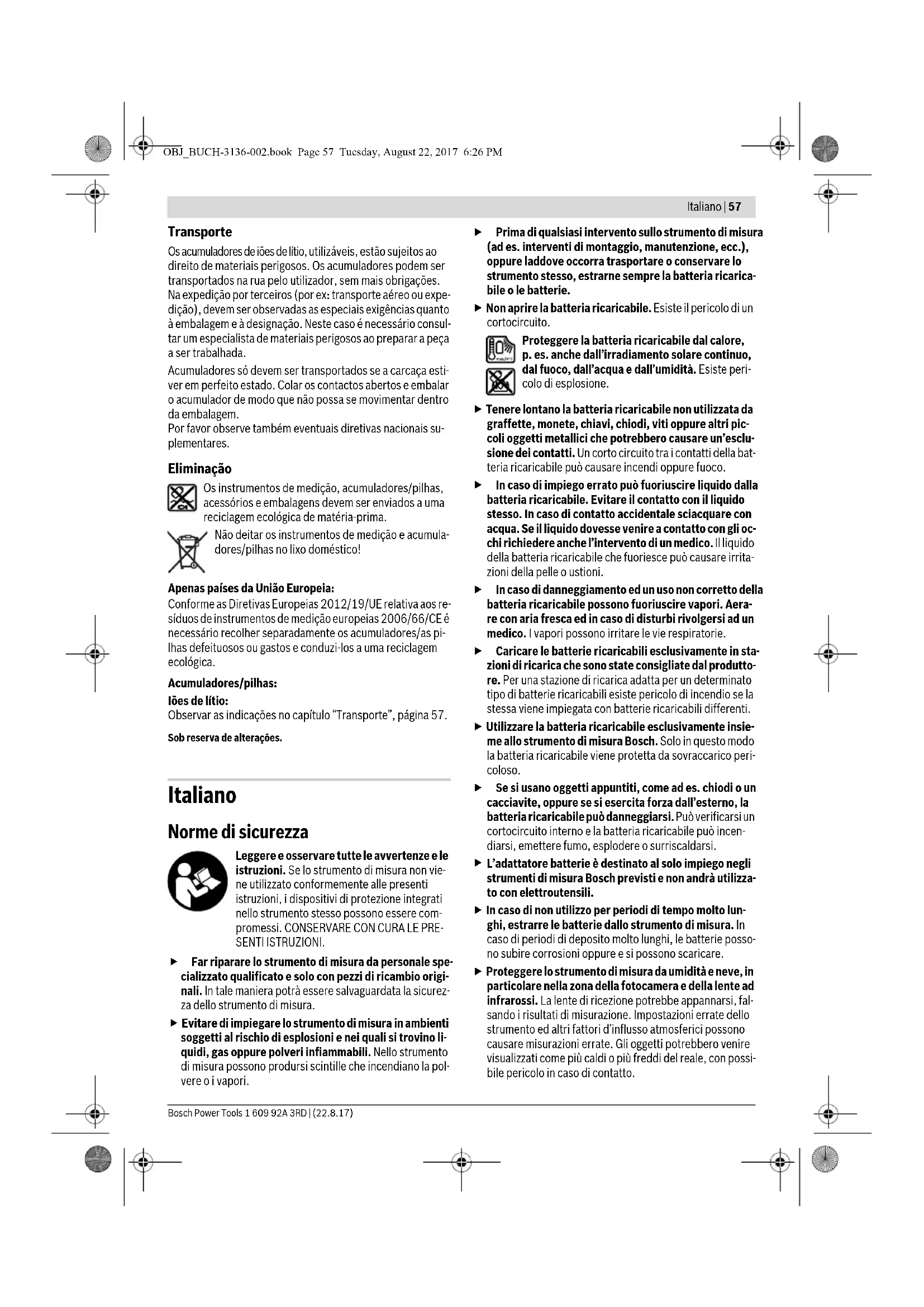 Dati tecnici rilevati con batteria ricaricabile del volume di fornitura. OBJ_BUCH-3136-002.book Page 59 Tuesday, August 22, 2017 6:26 PM60 | Italiano 1 609 92A 3RD | (22.8.17) Bosch Power Tools Montaggio Alimentazione d’energia Lo strumento di misura è utilizzabile sia con normali pile a stilo (pile a stilo AA tipo LR6 o simile), sia con una oppure con una batteria al litio Bosch. Impiego con adattatore batterie (estraibile) (vedi figura A) Le batterie vengono inserite nell’apposito adattatore. L’adattatore batterie è destinato al solo impiego negli strumenti di misura Bosch previsti e non andrà utilizza- to con elettroutensili. Per inserire le pile a stilo, spingere il rivestimento dell’adatta- tore pile a stilo 21 nel vano batterie 18. Inserire le pile a stilo nel rivestimento, conformemente all’immagine riportata sulla calotta di chiusura 20. Spingere quindi la calotta di chiusura sul rivestimento, fino a farla scattare udibilmente in sede e portarla a filo dell’impugnatura dello strumento di misura. Per prelevare le pile a stilo, premere i tasti di sbloccaggio 19 della calotta di chiusura 20 ed estrarre la calotta stessa. Prestare attenzione a non far cadere le pile a stilo. A tale scopo, mante- nere lo strumento di misura con il vano batterie 18 rivolto verso l’alto. Prelevare le pile a stilo. Per ri- muovere il rivestimento interno 21 dal vano batterie 18, fare presa nell’incavo del rivestimento 22 ed estrarre quest’ultimo dallo strumento di misura, esercitando una leggera pressione sulla parete laterale (vedere figura B). Nota bene: Per prelevare la batteria, non utilizzare attrezzi (ad es. cacciaviti), poiché altrimenti il rivestimento potrebbe rompersi. Sostituire sempre contemporaneamente tutte le batterie. Uti- lizzare esclusivamente batterie che siano di uno stesso pro- duttore e che abbiano la stessa capacità. In caso di non utilizzo per periodi di tempo molto lun- ghi, estrarre le batterie dallo strumento di misura. In caso di periodi di deposito molto lunghi, le batterie posso- no subire corrosioni oppure e si possono scaricare. Funzionamento con batteria ricaricabile (vedi figura C) Nota bene: L’uso di batterie ricaricabili non adatte allo stru- mento di misura può causare funzionamenti difettosi oppure il danneggiamento dello strumento di misura stesso. Nota bene: La batteria ricaricabile viene fornita parzialmente carica. Per garantire l’intera potenza della batteria ricaricabi- le, prima del primo impiego ricaricare completamente la bat- teria ricaricabile nella stazione di ricarica. Utilizzare esclusivamente i caricabatteria indicati nei dati tecnici. Soltanto questi caricabatteria sono adatti alle batterie ricaricabili al litio utilizzate nel vostro strumento di misura. La batteria ricaricabile agli ioni di litio può essere ricaricata in qualsiasi momento senza ridurne la durata. Un’interruzione dell’operazione di ricarica non danneggia la batteria ricarica- bile. Dopo lo spegnimento automatico dello strumento di misura, non premere ulteriormente il tasto ON/OFF. La batteria ricaricabile potrebbe subire dei danni. Per inserire la batteria ricaricabile carica 23, spingere la bat- teria stessa nel relativo vano 18, finché non si innesta udibil- mente e si posiziona a filo dell’impugnatura dello strumento di misura. Per estrarre la batteria 23, premere i tasti di sbloccaggio 19 ed estrarre la batteria dal relativo vano 18. Durante questa operazione, non esercitare forza. Indicatore dello stato di carica L’indicatore del livello di carica f nel display mostra lo stato di carica delle batterie e/o della batteria ricaricabile 23. Condizioni ambientali consentite – Temperatura di carica – Temperatura di funzionamento