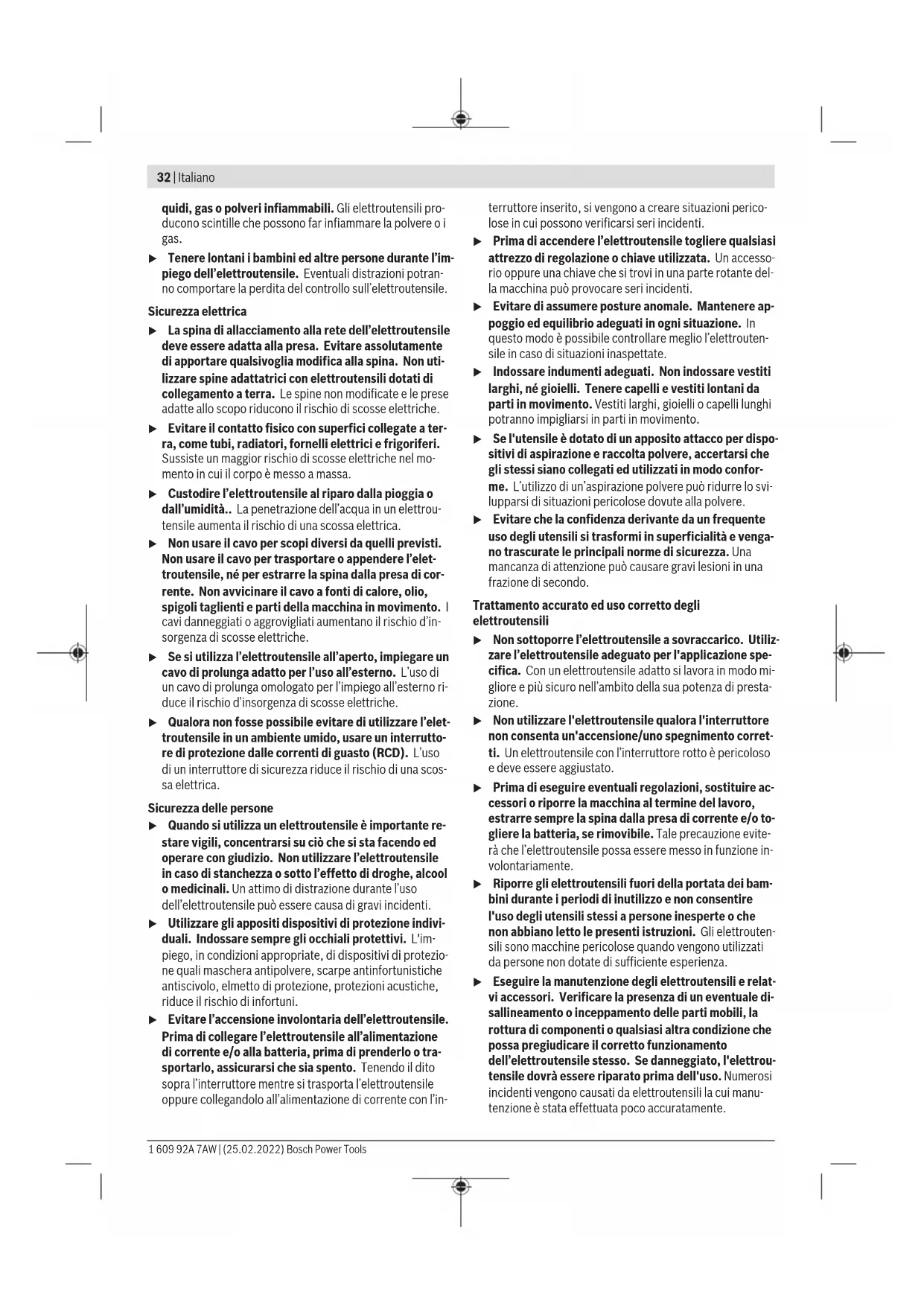 0,7 Alumínio 200 2,0 Lubrificar/refrigerar o punção Para aumentar a durabilidade do punção(8), deve ser usado um lubrificante com boa função de refrigeração (p. ex. óleo de corte). Aplique no lado de cima da chapa ao longo da linha de corte planeada um cordão de lubrificante. Cortar ao longo de uma marcação de corte ou com molde Os cortes a direito são mais fáceis de executar, se guiar a ferramenta elétrica ao longo de uma régua. Os contornos podem ser feitos guiando a ferramenta elétrica ao longo de um escantilhão. Para os cortes interiores, é necessária uma perfuração prévia de 22mm de diâmetro. Indicador da proteção contra sobrecarga Numa utilização correta, a ferramenta elétrica não pode ser sobrecarregada. Em caso de sobrecarga ou saída fora da faixa de temperatura permitida para a bateria, a número de cursos é reduzido ou a ferramenta desliga-se. No caso de um número de cursos reduzido, a ferramenta elétrica só volta ao número de cursos plenos depois de atingida a temperatura da bateria permitida. Em caso de desligamento automático, desligue a ferramenta elétrica, deixe a bateria arrefecer e depois volte a ligar a ferramenta elétrica. Manutenção e assistência técnica Manutenção e limpeza u A bateria deverá ser retirada antes de todos os trabalhos na ferramenta elétrica (p. ex. manutenção, troca de ferramenta etc.) e antes de transportar ou de armazenar a mesma. Há perigo de ferimentos se o interruptor de ligar/desligar for acionado involuntariamente. u Manter a ferramenta elétrica e as aberturas de ventilação sempre limpas, para trabalhar bem e de forma segura. Limpe e oleie o punção(8) e a matriz(9) a cada 3 horas de serviço. Troque o punção e a matriz atempadamente em caso de desgaste, porque só ferramentas afiadas apresentam um bom rendimento de corte e protegem a ferramenta elétrica. O punção(8) e a matriz(9) não podem ser reafiados. Substituir a matriz Desaperte o parafuso serrilhado(11) do porta-matriz(7). Remova a matriz(9). 1 609 92A 7AW | (25.02.2022) Bosch Power ToolsItaliano | 31 Limpe, se necessário, o porta-matriz(7). Coloque uma matriz(9) nova e bem oleada no porta-matriz. Observe o alinhamento ao lado plano. Volte a apertar o parafuso serrilhado(11) com o anel de borracha(10) colocado. Aperte o parafuso com a ajuda de uma chave sextavada interior contra a resistência do anel de borracha (3−4Nm). Substituir o punção Solte o parafuso(4) do porta-matriz e retire o porta- matriz(7) por completo da carcaça. Empurre o punção(8) lateralmente do encaixe e retire-o puxando-o para baixo. Coloque um novo punção(8) bem oleado na ranhura do encaixe e alinhe-o ao centro. Volte a deslizar o porta-matriz(7) com cuidado sobre o punção para a carcaça. Rode o porta-matriz, consoante o sentido de corte desejado, para uma das três posições possíveis. Aperte o parafuso(4) do porta-matriz. Serviço pós-venda e aconselhamento O serviço pós-venda responde às suas perguntas a respeito de serviços de reparação e de manutenção do seu produto, assim como das peças sobressalentes. Desenhos explodidos e informações acerca das peças sobressalentes também em: www.bosch-pt.com A nossa equipa de consultores Bosch esclarece com prazer todas as suas dúvidas a respeito dos nossos produtos e acessórios. Indique para todas as questões e encomendas de peças sobressalentes a referência de 10 dígitos de acordo com a placa de caraterísticas do produto. Portugal Robert Bosch LDA Avenida Infante D. Henrique Lotes 2E – 3E 1800 Lisboa Para efetuar o seu pedido online de peças entre na página www.ferramentasbosch.com. Tel.: 21 8500000 Fax: 21 8511096 Encontra outros endereços da assistência técnica em: www.bosch-pt.com/serviceaddresses Transporte As baterias de iões de lítio recomendadas estão sujeitas ao direito de materiais perigosos. As baterias podem ser transportadas na rua pelo utilizador, sem mais obrigações. Na expedição por terceiros (porex: transporte aéreo ou expedição), devem ser observadas as especiais exigências quanto à embalagem e à designação. Neste caso é necessário consultar um especialista de materiais perigosos ao preparar a peça a ser trabalhada. Só enviar baterias se a carcaça não estiver danificada. Colar contactos abertos e embalar a bateria de modo que não possa se movimentar dentro da embalagem. Por favor observe também eventuais diretivas nacionais suplementares. Eliminação As ferramentas elétricas, as baterias, os acessórios e as embalagens devem ser enviados a uma reciclagem ecológica de matéria prima. Não deitar ferramentas elétricas e baterias/ pilhas no lixo doméstico! Apenas para países da UE: Conforme a Diretiva Europeia 2012/19/UE relativa aos resíduos de equipamentos elétricos e eletrónicos e a sua implementação na legislação nacional, é necessário recolher separadamente as ferramentas elétricas que já não são usadas e, de acordo com a Diretiva Europeia 2006/66/CE, as baterias/pilhas defeituosas e encaminhá-las para uma reciclagem ecológica. No caso de uma eliminação incorreta, os aparelhos elétricos e eletrónicos antigos podem ter efeitos nocivos no ambiente e na saúda humada devido à possível presença de substâncias perigosas. Baterias/pilhas: Lítio: Observar as indicações no capítulo Transporte (ver "Transporte", Página31). Italiano Avvertenze di sicurezza Avvertenze generali di sicurezza per elettroutensili ATTENZIONE Leggere tutte le avvertenze di pe- ricolo, le istruzioni operative, le fi- gure e le specifiche fornite in dotazione al presente elet- troutensile. Il mancato rispetto di tutte le istruzioni sottoe- lencate potrà comportare il pericolo di scosse elettriche, in- cendi e/o gravi lesioni. Conservare tutte le avvertenze di pericolo e le istruzioni operative per ogni esigenza futura. Il termine "elettroutensile" riportato nelle avvertenze fa rife- rimento ai dispositivi dotati di alimentazione e