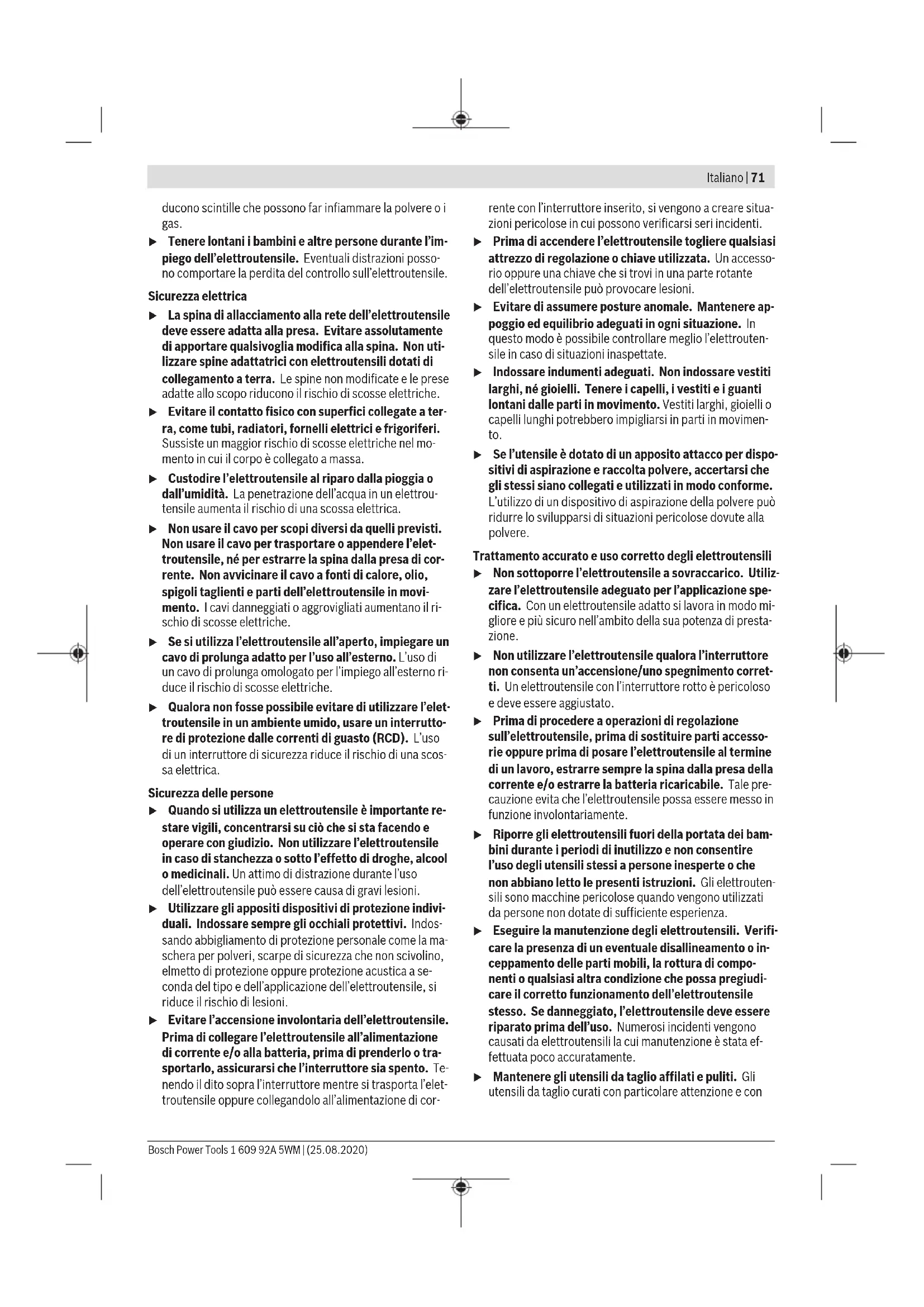 , così come i simboli grafici (loghi), sono marchi di fabbrica registrati e sono proprietà di Bluetooth SIG, Inc. Qualsivoglia utilizzo di tali wordmark/ loghi da parte di Robert Bosch Power Tools GmbH avvie- ne sotto specifica licenza. 1 609 92A 5WM | (25.08.2020) Bosch Power ToolsItaliano | 75 Descrizione del prodotto e dei servizi forniti Leggere tutte le avvertenze e disposizioni di sicurezza. La mancata osservanza delle avver- tenze e disposizioni di sicurezza può causare folgorazioni, incendi e/o lesioni di grave entità. Si prega di osservare le immagini nella prima parte delle istruzioni per l’uso. Uso conforme alle norme L’elettroutensile è destinato al taglio, sbavatura e spazzola- tura di materiali metallici e pietrosi senza l’impiego di acqua. Per la troncatura con abrasivo combinato deve essere impie- gata una cuffia di protezione speciale per la troncatura. Durante la troncatura in materiali pietrosi è necessario prov- vedere ad una sufficiente aspirazione della polvere. Abbinandolo agli appositi utensili ammessi, l’elettroutensile è utilizzabile per la levigatura con carta abrasiva. Dati e impostazioni relativi all’elettroutensile si potranno tra- sferire, con il sistema Bluetooth