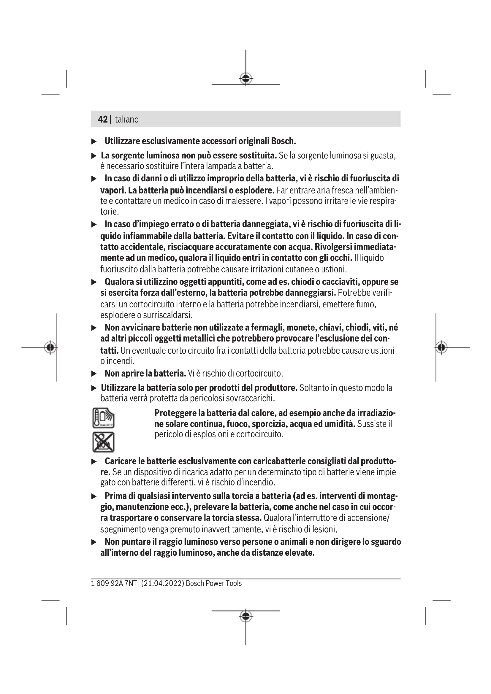 L’accessorio illustrato oppure descritto non è compreso nel volume di fornitura standard. L’accessorio completo è contenuto nel nostro programma accessori. Dati tecnici Torcia a batteria GLI 18V-300 Codice prodotto 3 601 DA1 1.. Tensione nominale V 18 Autonomia, circa min/Ah 300 Flusso luminoso totale, max. Im 300 Bosch Power Tools 1 609 92A 7NT | (21.04.2022)44 | Italiano Torcia a batteria GLI 18V-300 Temperatura ambiente consigliata in fase di ricarica °C 0...+35 Temperatura ambiente consentita durante il funzionamento