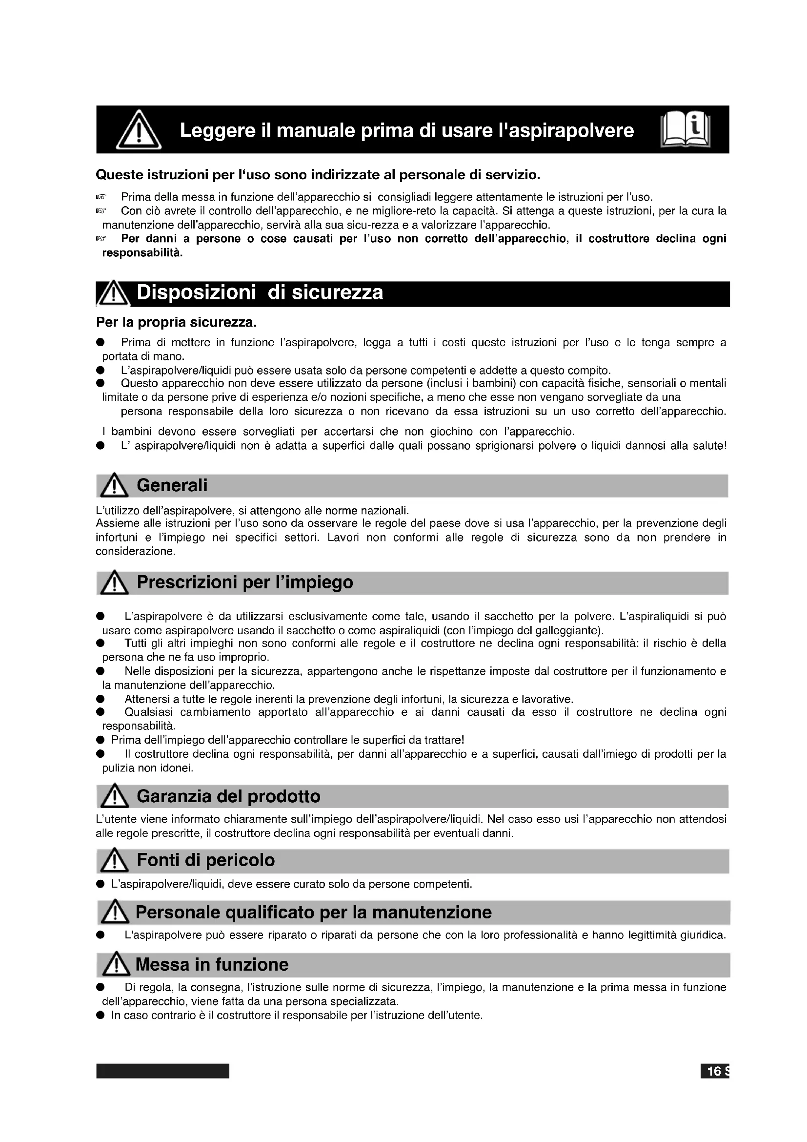 L'utenteiene informato chiaramente sull'impiego dell'aspirapolvere/liquidi. Nel caso esso usi l'apparecchio non attendosi alle regole prescritte, il costruttore declina agli responsabilita per eventuali danni.