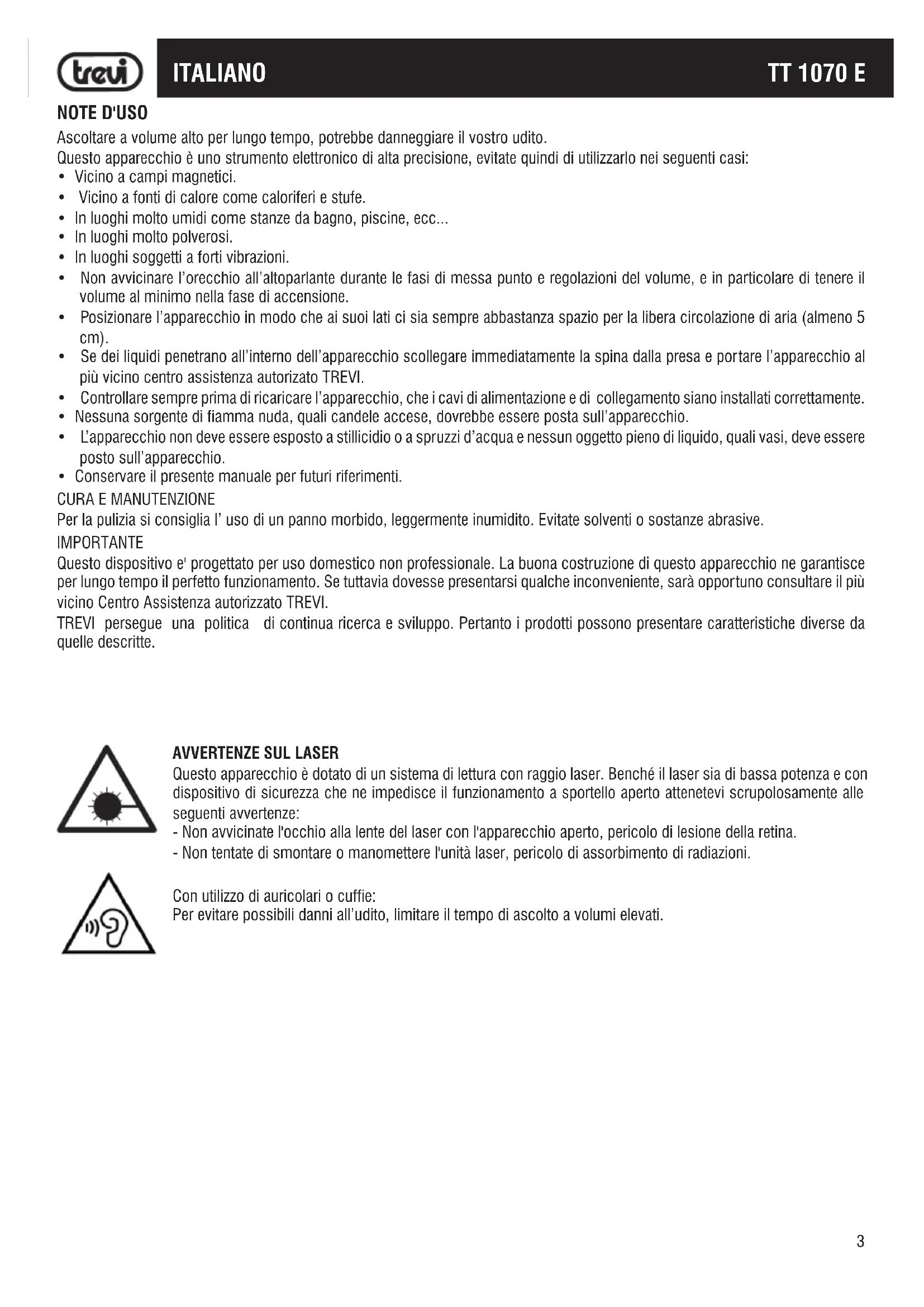 Questo apparecchio è dotato di un sistema di lettura con raggio laser. Benché il laser sia di bassa potenza e con dispositivo di sicurezza che ne impedisce il funzionamento a sportello aperto attenetevi scrupolosamente alle seguenti avvertenze: - Non avvicinate l'occhio alla lente del laser con l'apparecchio aperto, pericolo di lesione della retina. - Non tentate di smontare o manomettere l'unità laser, pericolo di assorbimento di radiazioni. Con utilizzo di auricolari o cuffie: Per evitare possibili danni all’udito, limitare il tempo di ascolto a volumi elevati. ITALIANO4 TT 1070 E